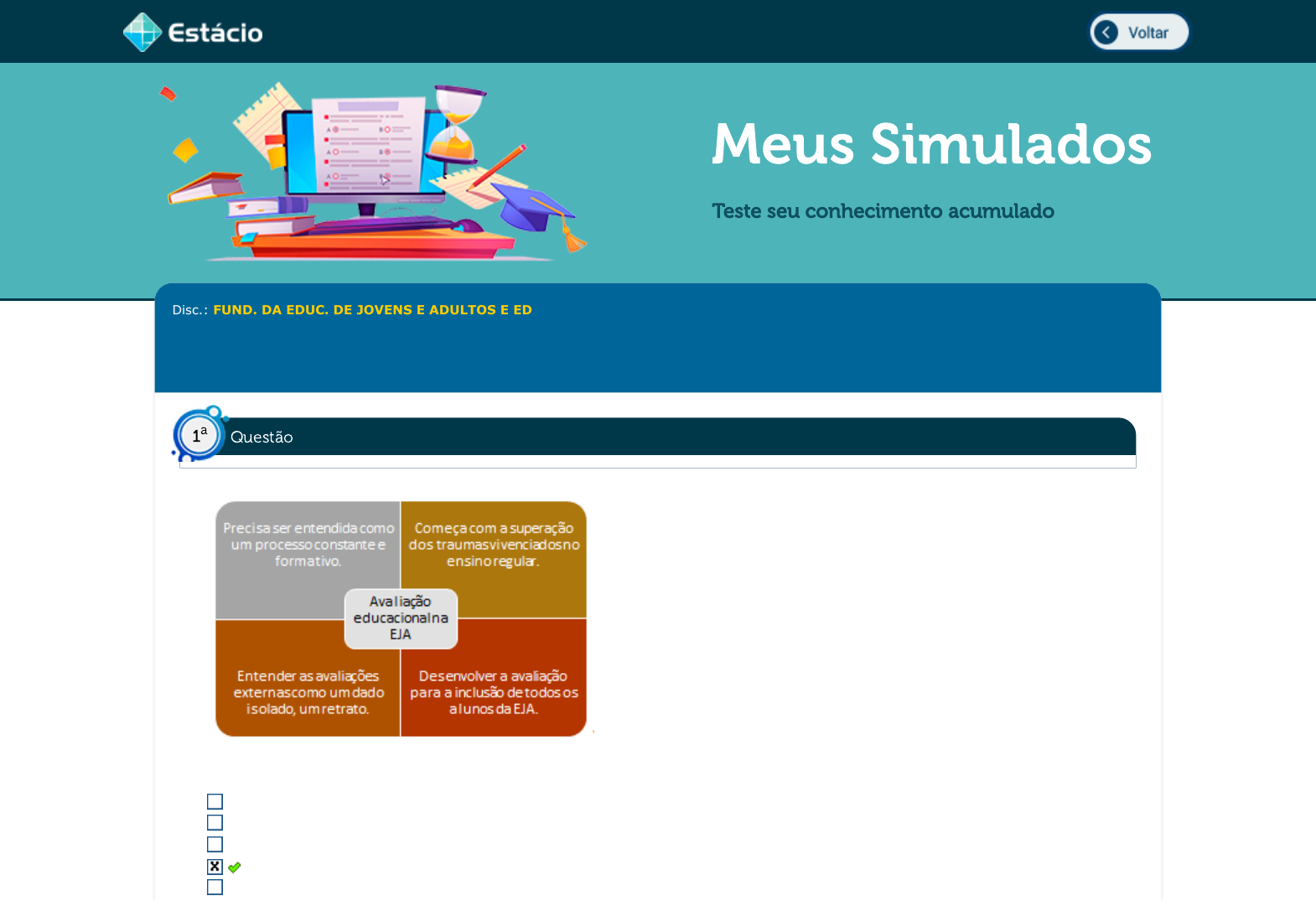 08/03/2023, 19:01 Estácio: Alunos https://simulado.estacio.br/alunos/ 1/8 Meus Simulados Teste seu conhecimento acumulado Disc.: FUND. DA EDUC. DE JOVENS E ADULTOS E EDUC. POPULAR Aluno(a): GABRIELA OLIVEIRA Y PINHO 202002561051 Acertos: 10,0 de 10,0 08/03/2023 Acerto: 1,0 / 1,0 Leia o esquema abaixo. Ao pensar as avaliações sobre esse princípio, estamos Destacando as avalições e minimizando o impacto das diversidades. Evidenciando os modelos padronizados do ensino regular. Reforçando o papel central das avaliações externas. Evitando novas exclusões e na percepção real dos papéis das avaliações na EJA. Reforçando a separação dos alunos que precisam ir logo para EJA. Questão1 a https://simulado.estacio.br/alunos/inicio.asp javascript:voltar(); 08/03/2023, 19:01 Estácio: Alunos https://simulado.estacio.br/alunos/ 2/8 Respondido em 08/03/2023 18:54:34 Explicação: O esquema demostra um sistema complexo de avalição que precisa ser utilizado na EJA, no reforço das inclusões por meio da avaliação. Pode ser engraçado, mas uma avaliação coletiva e que seja pautada não apenas em dados instantâneos pode servir para emancipação e na valorização da diversidade. Assim, vamos evitar novas exclusões e perceber o lugar da avalição na EJA. Acerto: 1,0 / 1,0 Com relação à coletividade na EJA, avalie as afirmações a seguir: I. Podemos dizer que ela é reforçada pelo silenciamento da BNCC. II. A BNCC não compreende o papel reparador da EJA. III. A BNCC não faz uma leitura crítica dos processos de silenciamento da educação pelos pares no ensino regular. IV. O coletivo não é uma oportunidade de renovar a experiência educacional . Podemos dizer que as opções corretas são: I e III II e III I e IV I e II II e IV Respondido em 08/03/2023 18:54:41 Explicação: Na primeira alternativa, está incorreto dizer que a coletividade pode ser reforçada pelo silêncio da EJA na BNCC. Ao negar a historicidade de milhares alunos, existe mais uma vez o apagamento das identidades coletivas desses alunos. A segunda está correta por destacar os aspectos reparadores da EJA. A terceira também está correta, por denunciar o silenciamento dos alunos da EJA em suas trajetórias pelo ensino regular. Por fim, na última opção, o coletivo é sim um lugar de renovação das experiências coletivas e precisamos destacar esse processo na EJA. Acerto: 1,0 / 1,0 Questão2 a Questão 3 a 08/03/2023, 19:01 Estácio: Alunos https://simulado.estacio.br/alunos/ 3/8 Numa sociedade predominantemente grafocêntrica, onde o código escrito ocupa posição privilegiada, um problema a ser enfrentado é o não acesso igualitário ao domínio da leitura e da escrita. As raízes da negação a esse direito são de ordem histórico-social, na medida em que, no Brasil, o caráter subalterno atribuído pelas elites dirigentes à educação escolar de negros escravizados, índios reduzidos, caboclos migrantes e trabalhadores braçais, entre outros, impediu-os da plena cidadania, de modo que os descendentes desses grupos ainda hoje sofrem as consequências dessa realidade histórica. Assim, de acordo com a maturação das estratégias do EJA como um processo de cidadania podemos afirmar que o EJA tem uma função: Social, que possibilita a inserção das pessoas a quem foram negados os direitos elementares de acesso à educação básica. Equalizadora, dado o seu papel de transformar os educandos dessa modalidade em sujeitos que possam retornar ao ensino regular em condições de igualdade de aprendizagem com os demais sujeitos. Reparadora, pela qual reconhece a dívida social histórica e se posiciona como mecanismo não só de entrada dos sujeitos no circuito dos direitos civis pela restauração de um direito negado (o direito a uma escola de qualidade), mas também como reconhecimento daquela igualdade ontológica de todo e qualquer ser humano. Qualificadora, pela qual possibilita ao sujeito o aprendizado e a apropriação do código escrito: ferramenta que o qualifica como trabalhador produtivo e inserido na sociedade. Econômica, para permitir uma melhoria da qualidade de vida e buscar empregos melhores. Respondido em 08/03/2023 18:54:49 Explicação: A resposta correta é: Reparadora, pela qual reconhece a dívida social histórica e se posiciona como mecanismo não só de entrada dos sujeitos no circuito dos direitos civis pela restauração de um direito negado (o direito a uma escola de qualidade), mas também como reconhecimento daquela igualdade ontológica de todo e qualquer ser humano. Acerto: 1,0 / 1,0 Dados oficiais e pesquisas recentes têm apontado que, diferentemente de tempos passados, a maior parte das pessoas que busca no sistema educacional brasileiro oportunidades de estudos acelerados em horário noturno não são adultos ou idosos analfabetos, mas, principalmente, adolescentes e jovens pobres que, após realizar uma trajetória escolar descontínua, marcada por insucessos e desistências, retornam à escola em busca de credenciais escolares e de espaços de aprendizagem, sociabilidade e expressão cultural. Esse processo é um fenômeno: Que se constitui numa estratégia oficial para aproximar os estudantes jovens e os adultos analfabetos em uma mesma turma. Que está presente na educação de jovens e adultos desde os anos 1940, quando o governo brasileiro criou o Ensino Supletivo. Que se segue os direcionamentos dos educadores e pesquisadores da Educação quando tratam do Ensino de Jovens e Adultos. Que, segundo Paulo Freire, é resultante de um processo de opressão das classes populares do país. Que se deve à combinação de fatores ligados ao mercado de trabalho e ao sistema educativo, potencializados pela redução da idade mínima para frequentar a EJA (LDB, 1996). Questão4 a 08/03/2023, 19:01 Estácio: Alunos https://simulado.estacio.br/alunos/ 4/8 Respondido em 08/03/2023 18:54:56 Explicação: A resposta correta é: Que se deve à combinação de fatores ligado