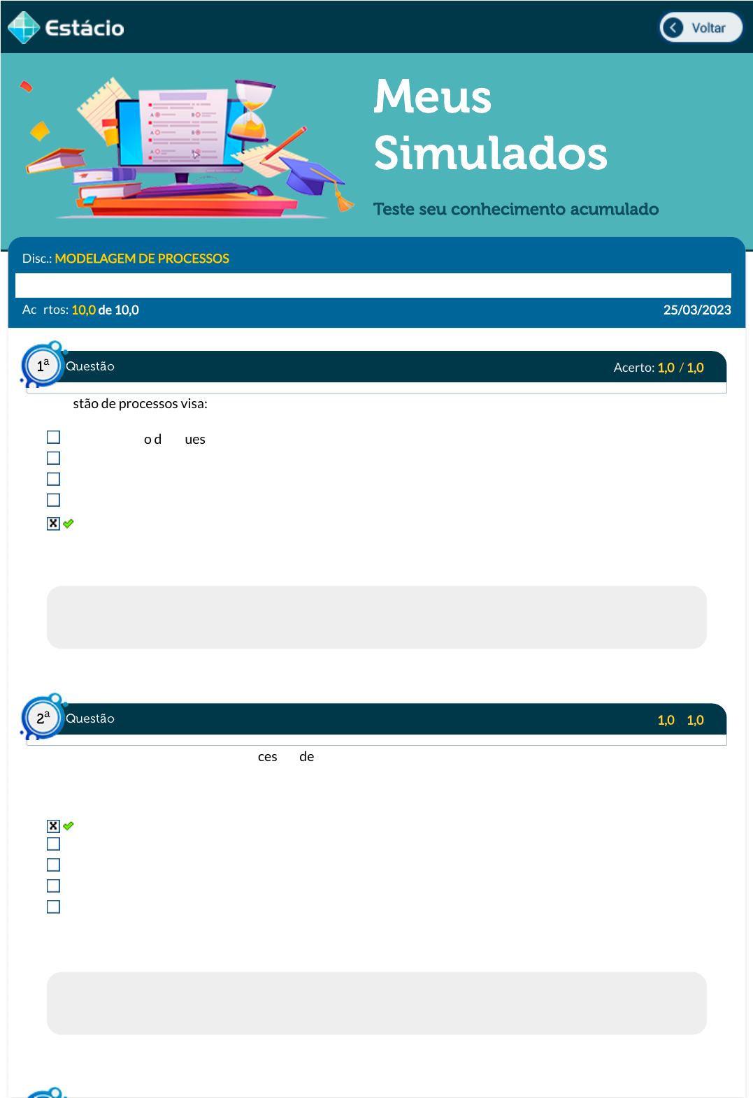 25/03/2023, 21:49 Estácio: Alunos https://simulado.estacio.br/alunos/ 1/6 Meus Simulados Teste seu conhecimento acumulado Disc.: MODELAGEM DE PROCESSOS Aluno(a): FLAVIO ALVES SIMEÃO 202009437842 Acertos: 10,0 de 10,0 25/03/2023 Acerto: 1,0 / 1,0 A gestão de processos visa: à redução das questões legais que podem afetar a produtividade da organização. ao suporte na tomada de decisões em contextos estratégicos críticos. à valorização de um processo organizacional centrado nos relacionamentos pessoais. à de�nição clara da cadeia hierárquica funcional de uma organização. ao gerenciamento e melhoria das atividades e utilização dos recursos da organização. Respondido em 25/03/2023 21:40:03 Explicação: A resposta correta é: ao gerenciamento e melhoria das atividades e utilização dos recursos da organização. Acerto: 1,0 / 1,0 A fase de criação de modelos de processos de negócios novos ou modi�cados dentro do contexto dos objetivos de negócio, utilizando notações, �uxos de atividades, regras de negócio, plataformas tecnológicas, recursos de dados, controles operacionais e integração com outros processos internos e externos chama-se: Desenho do processo. Análise do processo. Gerenciamento de desempenho. Controle do processo. Implementação do processo. Respondido em 25/03/2023 21:40:51 Explicação: A resposta correta é:: Desenho do processo. Questão1 a Questão2 a https://simulado.estacio.br/alunos/inicio.asp javascript:voltar(); 25/03/2023, 21:49 Estácio: Alunos https://simulado.estacio.br/alunos/ 2/6 Acerto: 1,0 / 1,0 O exemplo abaixo é referente a que tipo de ferramenta para tomada de decisão? Grá�co de Gantt. Diagrama de Ishikawa. Fluxograma. Grá�co de Pareto. Histograma. Respondido em 25/03/2023 21:41:30 Explicação: A resposta correta é: Grá�co de Pareto. Acerto: 1,0 / 1,0 Uma das diferenças entre as arquiteturas de software tradicionais e a arquitetura SOA é que: Nas arquiteturas tradicionais o acoplamento dos componentes é fraco e na arquitetura SOA é forte. A arquitetura SOA está dividida nas camadas Apresentação, Negócio e Dados. Na SOA os módulos ou componentes de softwares são autônomos, independentes e por isso possuem acoplamento fraco. Arquitetura de 3 camadas é outro nome que se dá para a arquitetura SOA. Na arquitetura SOA não há a necessidade dos processos de negócios estarem bem de�nidos. Respondido em 25/03/2023 21:44:10 Explicação: Questão3 a Questão4 a 25/03/2023, 21:49 Estácio: Alunos https://simulado.estacio.br/alunos/ 3/6 A resposta correta é: Na SOA os módulos ou componentes de softwares são autônomos, independentes e por isso possuem acoplamento fraco. Acerto: 1,0 / 1,0 A gestão de processos tem como base os fundamentos da melhoria contínua e para isso utiliza algumas ferramentas e conceitos que foram assimiladas a ela. Assinale a abaixo a alternativa correta que corrobora a a�rmação: Six Sigma, Lean, TQM. Lean, BPM, Six Sigma. Six Sigma, Reengenharia e TQM. PCP, Lean e TQM. Six Sigma, Lean e PCP. Respondido em 25/03/2023 21:44:50 Explicação: A resposta correta é: Six Sigma, Lean, TQM. Acerto: 1,0 / 1,0 As etapas para a implantação de um BPM seguem uma sequência, assinale a alternativa correta que representa esta sequência: Estratégia e Planejamento do Processo, Desenho e Modelagem dos Processos de Negócio, Análise dos Processos de Negócio, Implantação do Processo, Re�namento do Processo e Controle e Monitoramento do Processo. Estratégia e Planejamento do Processo, Análise dos Processos de Negócio, Desenho e Modelagem dos Processos de Negócio, Implantação do Processo, Controle e Monitoramento do Processo e Re�namento do Processo. Análise dos Processos de Negócio, Estratégia e Planejamento do Processo, Implantação do Processo, Desenho e Modelagem dos Processos de Negócio, Re�namento do Processo e Controle e Monitoramento do Processo. Estratégia e Planejamento do Processo, Análise dos Processos de Negócio, Implantação do Processo, Desenho e Modelagem dos Processos de Negócio, Re�namento do Processo e Controle e Monitoramento do Processo. Análise dos Processos de Negócio, Estratégia e Planejamento do Processo, Implantação do Processo, Desenho e Modelagem dos Processos de Negócio, Controle e Monitoramento do Processo e Re�namento do Processo. Respondido em 25/03/2023 21:45:53 Explicação: A resposta correta é: Estratégia e Planejamento do Processo, Análise dos Processos de Negócio, Desenho e Modelagem dos Processos de Negócio, Implantação do Processo, Controle e Monitoramento do Processo e Re�namento do Processo. Acerto: 1,0 / 1,0 Questão5 a Questão6 a Questão7 a 25/03/2023, 21:49 Estácio: Alunos https://simulado.estacio.br/alunos/ 4/6 Muitos são os modelos de gestão de desempenho que existem. Nesse contedto, a perspectiva da "árvore de metas" surgiu nos anos 2000 e consiste nas seguintes perspectivas: I. Visão �nanceira II. Visão sociedade III. Visão sustentatbilidade IV. Visão cliente V. Visão empregado Assinale a alternativa que indica os itens corretos. I, III, IV e V, apenas. II, IV e V, apenas. I, III e V, apenas. I, II, III, IV e V. I, II, IV e V, apenas. Respondido em 25/03/2023 21:46:45 Explicação: I. Visão �nanceira - correto. II. Visão sociedade - correto. III. Visão sustentatbilidade - incorreto. Visão inovação seria o correto. IV. Visão cliente - correto. V. Visão empregado - correto. Acerto: 1,0 / 1,0 O PPMS é um sistema de gestão do desempenho de processos que busca apresentar uma visão holística deste desempenho. Para isso o PPMS tem as seguintes característica: I. Deve ser focado nos processos II. Deve avaliar o desempenho de toda a organização III. Deve designar um responsável para cada indicador a ser medido Assinale a alternativa que indica os itens corretos: II e III, apenas. I e II, apenas. I e III, apenas. II, apenas. I, II e III. Respondido em 25/03/2023 21:47:02 