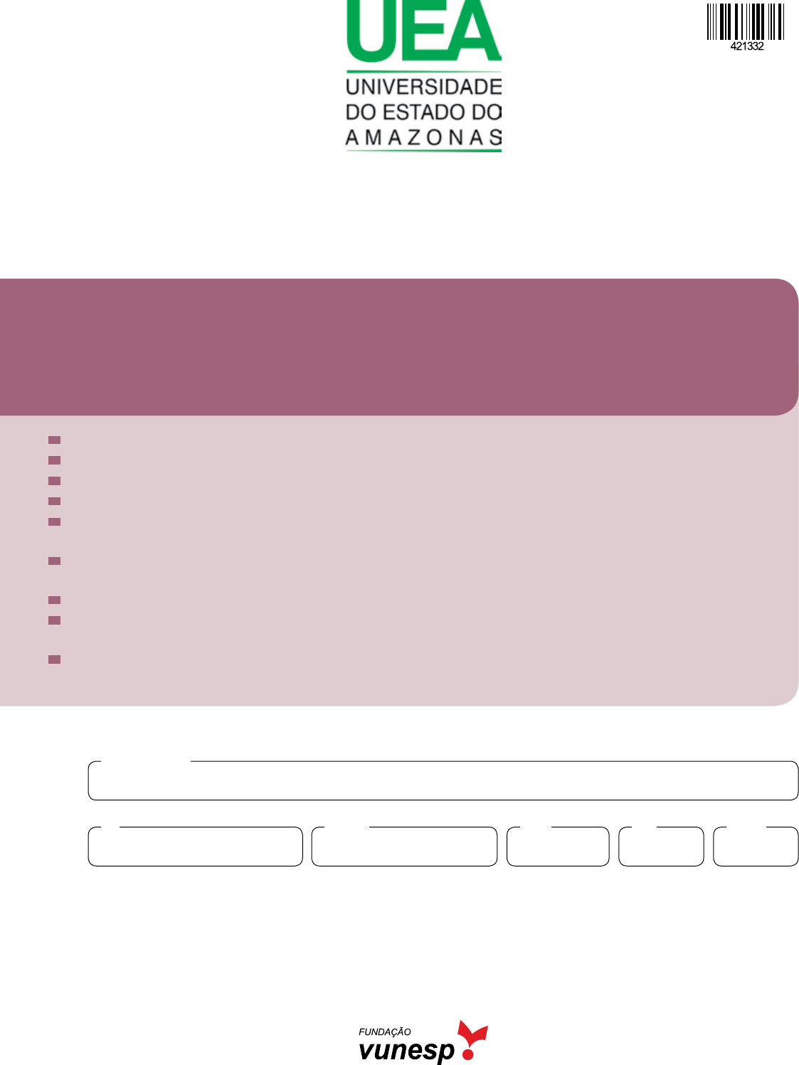 Confidencial até o momento da aplicação. Vestibular 2021 acesso 2022 002. Prova de ConheCimentos esPeCífiCos e redação Cursos: Medicina, odontologia, enfermagem, licenciatura em ciências biológicas, licenciatura em Química e licenciatura em educação Física. Verifique se sua folha de respostas pertence ao mesmo grupo de cursos que este caderno. confira seus dados impressos neste caderno. assine com caneta de tinta preta a Folha de respostas apenas no local indicado. esta prova contém 36 questões objetivas e uma proposta de redação. Quando for permitido abrir o caderno, verifique se está completo ou se apresenta imperfeições. caso haja algum problema, informe ao fiscal da sala para a devida substituição. Para cada questão, o candidato deverá assinalar apenas uma alternativa na Folha de respostas, utilizando caneta de tinta preta. encontra-se neste caderno a classificação Periódica, que poderá ser útil para a resolução de questões. esta prova terá duração total de 4h e o candidato somente poderá sair do prédio depois de transcorridas 3h, contadas a partir do início da prova. ao final da prova, antes de sair da sala, entregue ao fiscal a Folha de respostas, a Folha de redação e o caderno de Questões. Nome do candidato Prédio Sala CarteiraInscriçãoRG 2UEAM2101 | 002-CE-t1 Confidencial até o momento da aplicação. 3 UEAM2101 | 002-CE-t1Confidencial até o momento da aplicação. Questão 01 A figura ilustra duas organelas citoplasmáticas relacionadas ao metabolismo celular nos eucariontes. (www.biologianet.com. Adaptado.) Com relação às reações bioquímicas metabólicas realizadas por essas organelas, afirma-se que (A) os cloroplastos consomem glicose e água. (B) os cloroplastos consomem glicose e gás oxigênio. (C) as mitocôndrias produzem água e gás carbônico. (D) as mitocôndrias consomem glicose e gás carbônico. (E) os cloroplastos produzem gás carbônico e gás oxigênio. Questão 02 A prófase I da meiose é caracterizada pela ocorrência de um determinado processo, referente aos cromossomos homólo- gos, bastante importante na promoção da variabilidade gené- tica. Esse processo consiste essencialmente (A) na duplicação das cromátides irmãs. (B) na separação dos cromossomos homólogos. (C) no encurtamento das fibras cromossômicas. (D) na troca de pedaços entre cromátides homólogas. (E) na condensação máxima dos cromossomos. Questão 03 A figura ilustra alguns adipócitos, um tipo de célula do tecido adiposo. (https://brasilescola.uol.com.br) Os adipócitos são células caracterizadas pela grande quan- tidade de gordura presente no citoplasma. Essa caracterís- tica faz com que o t ecido do qual fazem parte tenha uma importante função fisiológica no grupo dos mamíferos aquá- ticos. A referida função deste tecido está relacionada (A) à manutenção da estabilidade da temperatura corporal. (B) ao armazenamento de aminoácidos e carboidratos. (C) à eficiência do processo circulatório sistêmico. (D) ao metabolismo autotrófico do organismo. (E) à perda de calor pelo contato direto com a água. Questão 04 O pâncreas é um órgão formado por diferentes tipos de epi- télios, sendo que 98% destes correspondem à sua porção exócrina e 2% à porção endócrina. A dupla função do pâncreas que está relacionada aos tipos glandulares classifica-o como glândula (A) secretora, com produção de proteínas estruturais e metabólicas. (B) anfícrina, com produção de enzimas e hormônios. (C) digestiva, com produção de enzimas gástricas e entéricas. (D) mista, com produção de glicídios e nucleotídeos. (E) mucosa, com produção de ceras e gorduras. 4UEAM2101 | 002-CE-t1 Confidencial até o momento da aplicação. Questão 07 Uma determinada característica genética humana é condi- cionada por apenas um par de alelos autossômicos que se s egregam de forma independente. Considere que a mulher de um casal heterozigoto para essa característica esteja grávida. A probabilidade de nascer uma única criança do sexo feminino homozigota dominante para esses alelos, nessa gestação, será de (A) 1/2. (B) 1/16. (C) 1/3. (D) 0. (E) 1/8. Questão 08 Os termos genótipo e fenótipo são amplamente utilizados no estudo das leis da genética. Ambos podem se referir tanto a características dominantes como recessivas, porém diferem consideravelmente em seu significado. Considerando as regras existentes na primeira lei de Mendel, a frase que utiliza de forma correta um desses termos é: (A) O cruzamento entre indivíduos homozigotos dominantes produz apenas um fenótipo. (B) O olho de coloração preta de uma pessoa é um exemplo de genótipo recessivo. (C) O fenótipo recessivo para o albinismo é condicionado pelo genótipo heterozigoto. (D) A cor verde das sementes de ervilha indica seu fenótipo heterozigoto. (E) A textura lisa das sementes de ervilha indica seu único genótipo possível. Questão 09 A ovelha doméstica, Ovis aris, foi selecionada pelo ser h umano por meio de cruzamentos em sequência através de hibridações. Atualmente, a ovelha doméstica não é capaz de gerar descendentes férteis com o muflão, Ovis orientalis, que é uma das espécies ancestrais que lhe deu origem. A domesticação de espécies, tal como ocorreu com a ovelha doméstica no processo descrito, é classificada como um tipo de especiação que ocorre em função da seleção (A) alopátrica. (B) parapátrica. (C) artificial. (D) simpátrica. (E) peripátrica. Questão 05 Analise a ilustração do processo de trocas gasosas em um alvéolo pulmonar. (https://brasilescola.uol.com.br) Para que o processo de ventilação pulmonar ocorra, diversos músculos respiratórios atuam na contração e relaxamento, expandindo e contraindo toda a caixa torácica, de modo que (A) o gás carbônico é difundido ativamente para fora dos a lvéolos. (B) o gás carbônico é bombeado ativamente para dentro do alvéolos. (C) o gás ox