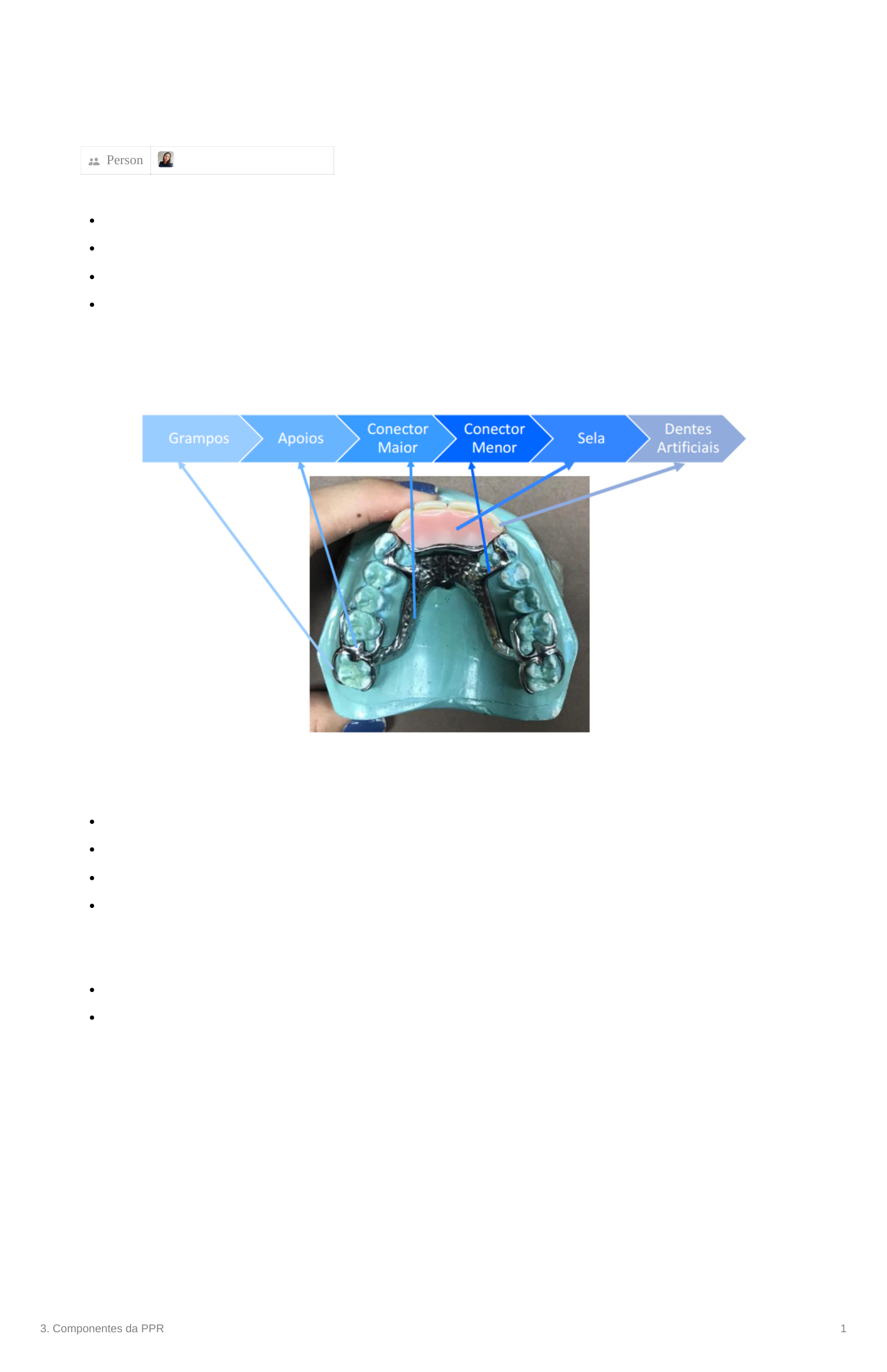 3. Componentes da PPR 1 3. Componentes da PPR Person Amanda De Moura Gomes → Principios fundamentais da PPR Retenção - associada a movimentos verticais Estabilidade - associada a movimentos laterais / oblíquos Fixação Reciprocidade retenção e estabilidade são conceitos comuns às outras próteses, fixação e reciprocidade são especificos da PPR pois são associados a componentes que existem somente nesses aparelhos → Componentes A ppr pode ser metaloplástica e plástica → Sistema da prótese parcial removivel sistema de suporte ou sustentação - dentes e periodonto sistema de retenção e estabilização - grampos, apoios e conectores maiores sistema de selas e dentes artificiais - selas e dentes artificiais sistema de conexão - conectores menores → Pilares São os dentes que irão participar da sustentação da prótese, podem ser diretos ou indiretos pilar direto - imediatamente ao lado protético pilar indireto - longe do espaço protético Para servir como dente pilar é importante verificar quanto de suporte ósseo existe, deve ter no mínimo 1:1 (coroa:raiz) → Tipos de rebordo 3. Componentes da PPR 2 A - horizontal - ideal B - descendente para distal - muito comum C - ascendente para distal D - côncavo - muito comum Quanto maior a perda de osso → mais resina → mais dificil a adaptação → Grampos - retenção Componentes que se relacionam com a coroa dos dentes suporte e tem função de resistir as forças de deslocamento. Podem ser classificados pela função e ação retentiva Função: de retenção direta - ao lado do espaço protético, grampos sobre dentes pilares diretos de retenção indireta - distante do espaço protético, grampos sobre dentes pilares indiretos Ação retentiva por abraçamento / circunferencial - abraça quase toda a coroa do dent, todos os elementos do grampo tocam na coroa do dente (180º). No último terço é mais flexivel para permitir entrada e saída nas áreas retentivas (retenção efetiva), nos demais terços é retenção por atrito princípios básicos (Roach) 1. fixação - apoio 2. retenção - braço de retenção, na vestibular, exerce força de vestibular para língual 3. reciprocidade - braço de oposição, ou braço de reciprocidade, fica na face lingual / palatina - impede lingualização do dente 4. estabilidade - todos os componentes juntos por ação de ponta - corpo alongado, não toca nem na mucosa e nem no dente, somente a ponta no dente pilar sempre que houver um braço de retenção obrigatoriamente precisa de um braço de oposição, mas pode haver braço de oposição sem braço de retenção → Apoios Asseguram que as cargas exercidas sobre os dentes artificiais durante a função mastigatória sejam transmitidas e distribuidas aos dentes suporte de maneira adequada suporte - transmissão de força/ carga para alguma estrutura podendo ser de caráter dental ou mucoso fixação - propriedade do aparelho em resistir a esse deslocamento no sentido ocluso gengival Nos posteriores - apoio oclusal Nos anteriores - apoio de cíngulo O apoio incisal não é mais utilizado por conta da questão estética → Conector maior maior componente que se tem na peça, maior volume metálico esse componente une todos os outros componentes a ele, de uma forma direta e indiretamente componentes maxilares e mandibulares são diferentes podem participar do suporte e estabilidade da prótese 3. Componentes da PPR 3 alguns também tem função de dissipar a carga mastigatória para o palato Na maxila barra palatina anterior ou em U chapeado palatino parcial chapeado palatino total barra dupla Mandíbula barra língual - tem menos largura, porém tem mais espessura, limite da borda (2-3mm abaixo da margem gengival e inserções musculares), largura (4-6mm) chapeado lingual - largura maior, porém com uma espessura menor manteno a rigidez, não há contato com a fibromucosa (sofre alíivio em torno de 0,5 mm) encosta no cíngulo dos dentes, utiliza-se quando não se tem o espaço de no mínimo 8mm Grampo contínuo de Kennedy - esse tipo de grampo fica separado da barra lingual e localiza-se sobre o cíngulo dos dentes anteriores inferiores. é utilizado em conjunto com a barra lingual em algumas situações, para prover maior estabilidade a peça. não é um conector maior e sim um grampo de estabilização → Relacionamento com os tecidos moles relação de contato: entre o conector maior superior e a fibromucosa palatina relação de alívio: entre o conector maior inferior e a fibromucosa 3. Componentes da PPR 4 → Selas componente vazado que tem retenções mecanicas para reter a resina e os dentes artificiais sempre está localizada no espaço protético e deve estar aliviada na fibromucosa, pois a resina que vai ficar ali tem que envolver essa sela tanto por cima quanto por baixo selas metaloplástica → quando a resina envolve toda a sela selas metálicas → são feitas quando se tem pouco espaço para a confecção da resina e dos dentes artificiais, sendo que os dentes são fixados na estrutura metálica → Conectores menores - sistema de conexão que faz a união do grampo com a sela ou que também une o grampo com o conector maior → Placas proximais - placas metálicas que são observadas na distal do dente geralmente quando é um pilar de extremidade livre. Essa placa tem intuito de estabilizar o dente em posição e guiar o movimento de entrada e saída da prótese → Dentes artificiais - existem várias marcas de dente de estoque de acrílico com vários formatos de dente e cores para adequar a prótese de acordo com as necessidades do paciente
