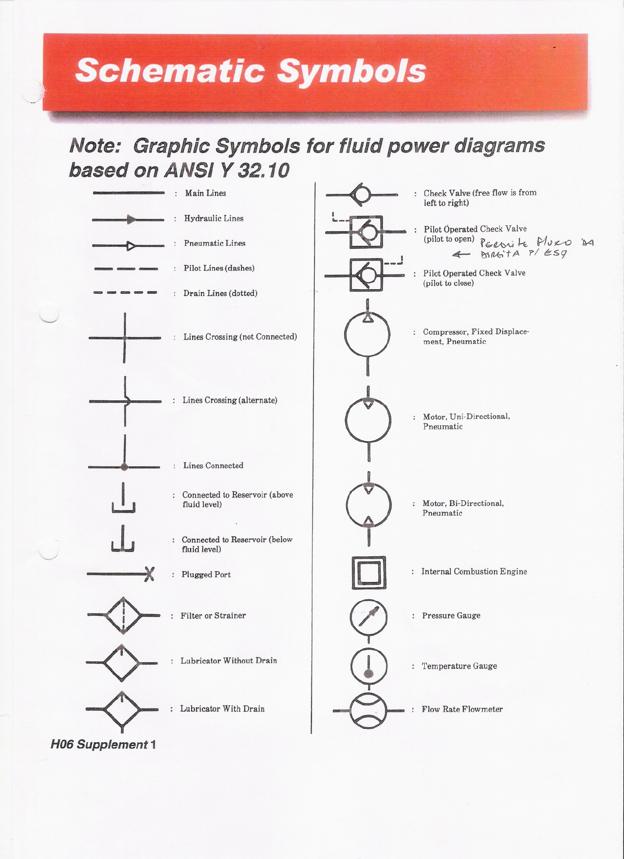 ;:"!~ ,~ Note: Graphic Symbols for fluid power diagrams based on ANSI Y 32.10 MainLines I ----ó- : CheckValve(freefIowisfromleftto right). : HydraulicLines I : Pilot Óperated Check Valve : Pneumatic Lines I (pilot to open) f6< k v 't A r>/ éSC;--- : Pilot Lines (dashes) I : PilotOperatedCheckValve (pilot to close)----- Drain Lines (dotted) I '--'" + : Lines Crossing (not Connected) I l ) : Compressor, Fixed Displace-ment, Pneumatic + : Lines Crossing (alternate) I l J : Motor, Uni-Directional, Pneumatic -L : Lines Connected : Connected to Reservoir (above fIuid leveI) I \A) : Motor, Bi-Directional, Pneumatic : Connectedto Reservoir (below fIuid leveI) '---'" I [[J]: Plugged Port : InternalCombustionEngine + : Filter or Strainer 0 : Pressure Gauge -<>-: LubricatorWithoutDrain CD : TemperatureGauge --<>- : LubricatorWithDrain ' FIowR'" Flm."" H06 Supplement 1 SYM2 Totalizing Flow Meter Q ShuttIe Valve Quick Disconnect. r.onnected ~ L L- : Quick Disconnect, ~ ~ Disconnected --o)-+<Q-Q:iCk Disconnect,withCheck Valve, Connected Manual Shut Off Valve, Normally Open --<)-i ~k D""",n~Cw;thChecl< Valve. Disconnected H06 Supplement 2 Manual Shut OffValve, Normally Closed Orifice, Fixed Adjustable Orifice Accumulator. Spring Loaded Accumulator. Gas Charged Receiver, Air or Gas Pump, Hydraulic, Uni- Directional, Fixed Displacement Pump. Hydraulic. Bi- Directional. Fixed Displacement Variable Displacement Hydraulic Pump, Uni-Directional Variable Displacement, Bi- Directional Hydraulic Pump Electric Motor Hydraulic Motor Fixed Dis- placement, Uni-Directional SYM4 3 Position. Double Air Pilot Operated. Spring Centered 3 Position. Manual Operated. Spring Centered S Position. Double Air Pilot Operated, with Manual Override, Detented, Valve Relief Valve, Remote Pilot Set, Vented to Atmosphere 4 Wa:y. 3 Position. Manual Operated, Spring Centered, Center Position, Ali ports Blocked 4 Wa:y,3 Position. Pilot Cylinder Operated with Manual Over- ride, Detented. Pressure Blocked, Cylinders Vented to Ambient In The Center Position, Valve 4 Way, 3 Position, Solenoid Operated. Spring Centered, Pres- sure Connected To Return, Cylinder Ports Blocked, Valve Two Way Manual Operated. Detented Valve (shown in the c10sed position) Two Way, Push Button Operated, Spring Return, Normally Close Valve H06 Supplement 4 SYM5 Two Way. Manual Operated. Spring Return NormaIly Open Valve 3 Way. Pneumatic Pilot Operated. Spring Return. NormaIly Closed Valve (fIuid vents to ambient) 3 Way Solenoid Operated. Spring Return. NormaIly Open Valve (fIuid vent is connected to reservoir) 4 Way. Two Position. Hydraulic Pilot Operated with Manual Override. Detented Valve (fIuid vent is connected to reservoir) Regulator, Manual Set. Non-Relieving Regulator. Manual Set. Relieving Type (fIuid vented to ambient I I '" Regulator. Air Pilot Operated. Relieving (fIuid vent connected to reservo ir) I I L ' ,'" Regulator. Hydraulic Pilot Operated. Relieving (fIuid vented to ambient) I' ' H06 Supplement 5 SYM6 , I L I ~f~Ly Ir-------- . I L.. , I I ...& H06 Supplement 6 Relief Valve, Non Adjustable. (vent connected to reservoir) Relief Valve, Adjustable (vented to ambient)