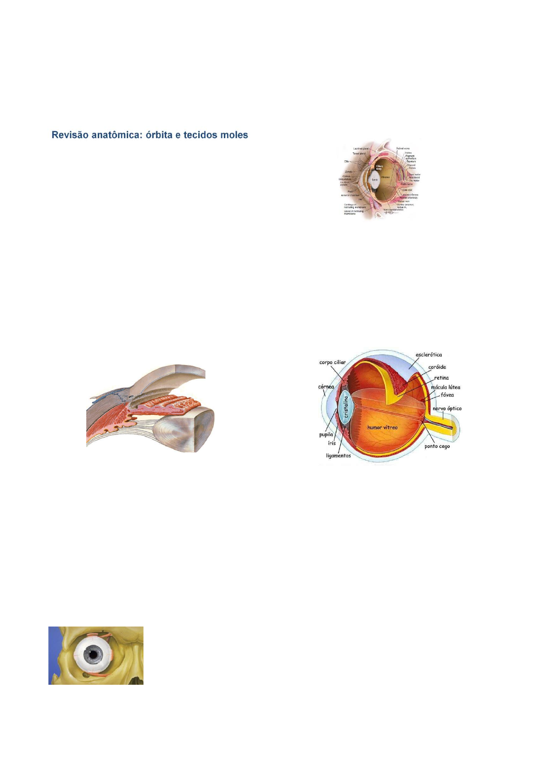 09/10/2020 1 Semiologia do sistema ocular Diferente nas diferentes espécies e nas diferentes raças Doenças sistêmicas podem resultar em alteração olftálmica Ex: catarata, uveite Anatomia do globo ocular Túnica externa ou fibrosa (córnea e esclera) Túnica média ou vascular (úvea) Túnica interna ou nervosa (retina e nervo óptico) Limbo https://elearning.up.pt/ppayo/SEMIO%2012- 13/AULASPRATICAS/OFTALMOLOGIA/Oftalmologia_Pedro_Malho_ICBAS_2 012.pdf Túnica média ou vascular do globo ocular Úvea anterior : íris, corpo ciliar Úvea posterior : coróide (tapetum) Revisão anatômica: bulbo ocular ou globo ocular Limbo ou junção córneo escleral wapedia.mobi Revisão anatômica: órbita e tecidos moles Arcabouço ósseo Músculos extra oculares: reto superior, reto inferior, reto lateral, reto medial, oblíquos superior e inferior, retrator do bulbo Revisão anatômica Anexos ou órgãos acessórios do olho: pálpebras Constituintes: Pálpebra superior Pálpebra inferior 3 a pálpebra (membrana nictitante) Glândulas, cílios, conjuntiva Rima palpebral: o espaço entre as pálpebras 09/10/2020 2 Funções das pálpebras Proteção física contra traumas Produção, distribuição e drenagem do filme lacrimal Pálpebras- revisão anatômica a) superfície epidérmica b) m orbicular do olho c) glândula tarsal d) conjuntiva palpebral •Glândulas lacrimais • Glândula da terceira pálpebra Camada aquosa Glândulas tarsais ou de Meibomion Camada lipídica • Células caliciformes Camada mucosa • Drenagem: 1. Pontos lacrimais 2. Sacos lacrimais 3. Ducto nasolacrimal Corte histológico córnea A –epitélio C-estroma D-membrana Descemet Características da córnea • Transparência, sem pigmentação, superfície lisa • Rica em terminações nervosas sensoriais principalmente nas camadas superficiais • Ausência de vasos sanguíneos e linfáticos • Controle do teor de água 09/10/2020 3 PRODUÇÃO E DRENAGEM DO HUMOR AQUOSO Produção: células do epitélio do corpo ciliar Drenagem: HA secretado c. posterior c. anterior ângulo irido-corneal drenagem irido-corneal (80 a 90%) e úveo- escleral (10 a 15%) sistema venoso Esquema retina cão: 9 camadas histológicas R= bastonete (visão noturna) C= cone (cores) Resenha + Anamnese geral Queixa principal Manifestações clínicas sistêmicas Exames anteriores Doenças concomitantes ou prévias (oculares e sistêmicos)- doenças infecciosas Antecedentes familiares/ doenças hereditárias Ingestão de carne crua, quantidade água ingerida Local de aquisição, contactantes, acesso à rua, imunização, ectoparasitos/ preventivos Viagens (litoral) Banhos (xampu, secador), reforma (cal)! Anamnese "oftálmica" Visão - cegueira no claro ou no escuro, ou quando muda de ambiente Tempo e forma de evolução Terapia prévia e atual Tamanho, opacificação ... Lacrimejamento excessivo (epífora), fotofobia, olho vermelho, prurido, blefarospasmo Início, progressão, evolução Uni x bilateral Anamnese "oftálmica" Avaliação visual - Subjetividade Ambiente com diferentes iluminações, avaliação de cada olho individualmente Resposta a ameaça Posicionamento tátil Teste do algodão Reflexo ofuscamento Teste de orientação: obstáculos: objetos móveis e parados 09/10/2020 4 Reflexo pupilar (diferente visão!) Palpação digital? Sala escura, magnificação (lupa), fonte de luz adequada teste de schirmer, fluoresceína tiras, colírio anestésico (anestalcon®), colírio midriático (tropicamida) Equipe para contenção apropriada Condições adequadas Exame específico oftálmico Teste lacrimal de Schirmer: papel filtro milimetrado Realizar antes de realizar manipulação excessiva e de aplicação de produtos tópicos Procedimento Quantifica a camada aquosa do filme lacrimal Primeiro procedimento a ser realizado Evitar manipulação prévia ou uso de colírios Teste lacrimal de Schirmer 09/10/2020 5 Exame específico oftálmico: corantes Teste de fluoresceína: corante de fluoresceína 1-2% Avalia integridade da córnea e sistema lacrimal Instilar 1-2 gotas, permitir piscar 20 segundos ~ 5minutos (teste de Jones) https://elearning.up.pt/ppayo/SEMIO%2012- 13/AULASPRATICAS/OFTALMOLOGIA/Oftalmologia_Pedro_Malho_ICBA S_2012.pdf Corte histológico córnea: camadas A –epitélio: grande capacidade de regeneração, 4- 7dias, lipofílico C- estroma- hidrofílico 90% espessura da córnea Fluoresceína corante hidrofílico- Positivo- cora de verde estroma Fonte: Manual de Oftalmologia Veterinária, Gelatt, 2003 Fluoresceína- tiras (ideal) Descrição Apresentação Volume Teste de shirmer Cx com 50 tiras estéreis 25 envelopes, 2 tiras Fluoresceína colírio 1% e 2% 5 mL Fluoresceína fitas Cx com 50 fitas estéreis 25 envelopes, 2 tiras Falso positivo, falso negativo... Exame oftalmoscópico- específico Oftalmoscopia direta Exame específico oftálmico: tonometria Olho vermelho, midríase, edema corneal, trauma orbital, luxação de lente, histórico de glaucoma Anestesia tópica e tonometria digital por aplanação Normal de 15- 25 a 40 mmHg, ≠ entre olhos 8mm Tonopen, tonovet 09/10/2020 6 Tonometria Cultura, antibiograma, testes específicos Exame citológico, cultura e antibiograma Antes de aplicar colírios ou corantes, anestésicos... Seleção apropriada de material, IF, PCR, ... Cuidados Exame de fundo de olho Oftalmoscópio Lente de 20 D + Transiluminador de Finoff Clear view Panóptico Biomicroscopia: Lâmpada de fenda Eletrorretinografia Registro da resposta elétrica causada por estímulo a luz Util quando o fundo está obscurecido Testa função de cones e bastonetes Diagnóstico precoce de degeneração e distrofias retinianas hereditárias Ultra som ocular e UBM 09/10/2020 7 Pálpebras Malformações congênitas Alterações adquiridas: Blefarites: processos inflamatórios e/ ou infecciosos Bacterianas, Fúngicas, Parasitária ou imunomediadas Traumas Neoplásicas Pálpebras Alterações congênitas/adquiridas Entróp