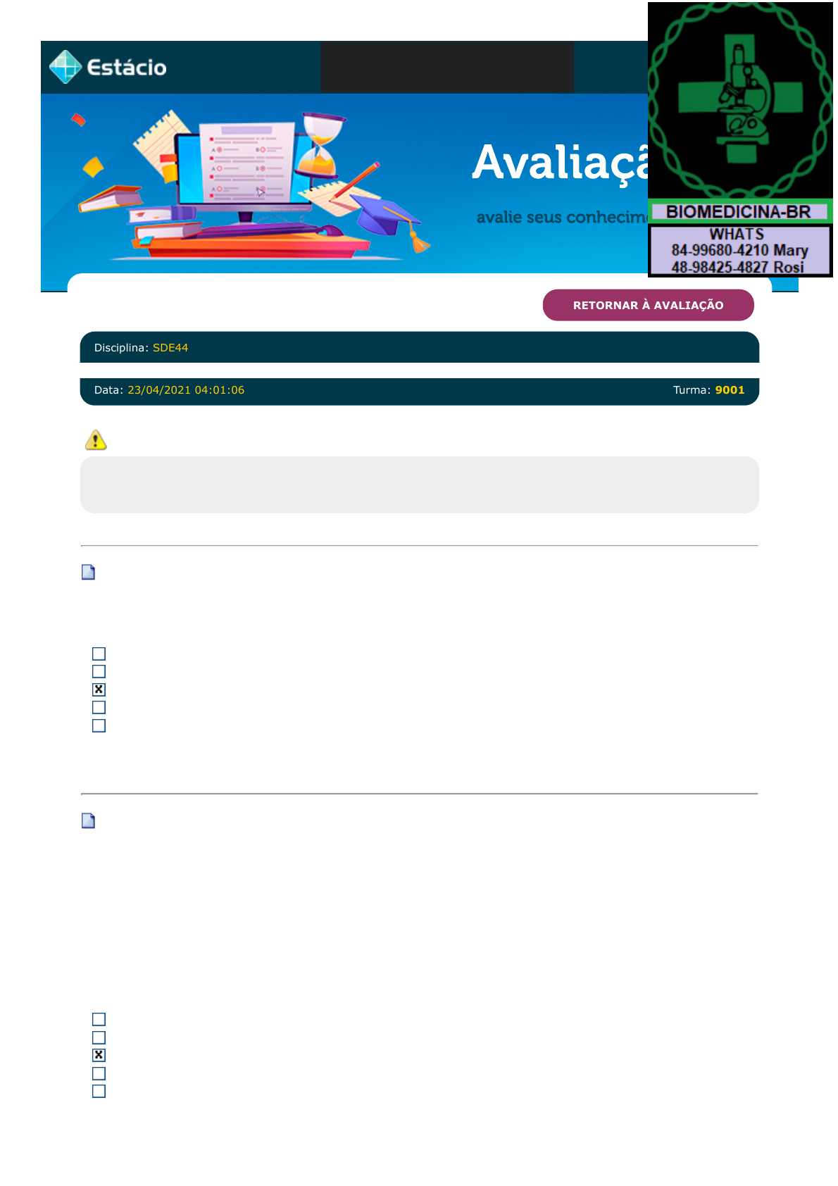 23/04/2021 EPS https://simulado.estacio.br/alunos/?p0=155702088&user_cod=2804605&matr_integracao=202004000781 1/4 Camilla de oliveira gomes monteiro Avaliação AV 202004000781 EAD VILA VELHA - GLÓRIA - ES avalie seus conhecimentos RETORNAR À AVALIAÇÃO Disciplina: SDE4449 - BIOINFORMÁTICA Período: 2021.1 - F (G) / AV Aluno: CAMILLA DE OLIVEIRA GOMES MONTEIRO Matrícula: 202004000781 Data: 23/04/2021 04:01:06 Turma: 9001 ATENÇÃO 1. Veja abaixo, todas as suas respostas gravadas no nosso banco de dados. 2. Caso você queira voltar à prova clique no botão "Retornar à Avaliação". 1a Questão (Ref.: 202007908164) O Projeto Genoma Humano,foi um projeto audacioso que começou no final dos anos 1980, liderado pelo Departamento de Energia do Instituto Nacional de Saúde dos Estados Unidos. Esse projeto foi extremamente marcante para a área da bioinformática. Nesse sentido, qual foi o principal objetivo desse projeto? Detectar os principais materiais genéticos de vírus e fungos. Determinar a ordem do RNA de vírus. Determinar a ordem das bases nitrogenadas (A, T, C e G) do todos os cromossomos humanos. Conhecer o núcleo da célula de maneira aprofundada. Determinar as bases nitrogenadas de bactérias. 2a Questão (Ref.: 202007883529) UFC-CE Cometer erros é a chave para o pro gresso. Há momentos em que é importan te não cometer erro algum ¿ pergunte a qualquer cirurgião ou piloto de avião. No entanto (¿) os erros não são apenas opor - tunidades valiosas para aprendermos; eles são, de forma significativa, a única opor tunidade para aprendermos algo relativa-mente novo. (¿) A evolução biológica se dá através de uma grande e inexorável se quência de tentativas e erros ¿ e sem os er ros as tentativas não teriam levado a nada. DENNETT, Daniel C. In: BROCKMAN, J. e MATSON K. (Org.). As coisas são assim. São Paulo: Cia. das Letras, 1997. Adaptado. O processo que se relaciona com o concei to de evolução biológica apresentado pelo autor é: indução de mutações programadas. alteração na estrutura do RNA. alteração aleatória na estrutura do DNA. geração de organismos transgênicos. reparação das lesões gênicas. javascript:voltar_avaliacoes() javascript:alert('C%C3%B3digo da quest%C3%A3o: 3907305\n\nStatus da quest%C3%A3o: Liberada para Uso.'); javascript:alert('C%C3%B3digo da quest%C3%A3o: 3882670\n\nStatus da quest%C3%A3o: Liberada para Uso.'); 23/04/2021 EPS https://simulado.estacio.br/alunos/?p0=155702088&user_cod=2804605&matr_integracao=202004000781 2/4 3a Questão (Ref.: 202007584576) Por muito tempo acreditou-se que uma molécula de DNA era capaz de produzir uma molécula de RNA, mas o mecanismo inverso não era possível. Hoje, no entanto, sabe-se que uma molécula de RNA pode produzir DNA em um processo chamado de: transcrição. tradução. reprodução transcrição reversa. replicação. 4a Questão (Ref.: 202007883565) Existem basicamente dois tipos de variáveis, utilizados em bioinformática: Causa e dependentes Causa e efeito Independentes e dependentes Nula e estabelecida Independentes e efeito 5a Questão (Ref.: 202007429108) (UFMG) Se o total de bases nitrogenadas de uma sequência de DNA de fita dupla é igual a 240, e nela existirem 30% de adenina, o número de moléculas de guanina será: 168 48. 144 72 120 6a Questão (Ref.: 202007583556) As alternativas a seguir estão relacionadas à transcriptômica, exceto: Várias técnicas podem ser aplicadas para o estudo, dentre elas, a técnica de microarranjos de DNA (DNA microarray). Determina os perfis da expressão de todos os genes presentes em um genoma. É usada para quantificar a abundância, modificação e interação de peptídeos. A atividade das proteínas codificadas pelos mRNAs é regulada em vários níveis após a sua expressão A abundância do mRNA nem sempre é bem correlacionada com a abundância da proteína. 7a Questão (Ref.: 202007883590) Qual a aplicabilidade do nucleotídeo blast? Ferramenta utilizada para realizar BLAST de proteínas com a sequência de nucleotídeo associada a ela. Neste BLAST, o pesquisador recebe como resultado a sequência de DNA que corresponde a uma dada proteína de entrada. Ferramenta utilizada para realizar BLAST de sequência de proteínas (aminoácidos) com proteínas. Neste BLAST, o pesquisador entra com uma sequência de aminoácidos e recebe como resultado sequências de javascript:alert('C%C3%B3digo da quest%C3%A3o: 3583717\n\nStatus da quest%C3%A3o: Liberada para Uso.'); javascript:alert('C%C3%B3digo da quest%C3%A3o: 3882706\n\nStatus da quest%C3%A3o: Liberada para Uso.'); javascript:alert('C%C3%B3digo da quest%C3%A3o: 3428249\n\nStatus da quest%C3%A3o: Liberada para Uso.'); javascript:alert('C%C3%B3digo da quest%C3%A3o: 3582697\n\nStatus da quest%C3%A3o: Liberada para Uso.'); javascript:alert('C%C3%B3digo da quest%C3%A3o: 3882731\n\nStatus da quest%C3%A3o: Liberada para Uso.'); 23/04/2021 EPS https://simulado.estacio.br/alunos/?p0=155702088&user_cod=2804605&matr_integracao=202004000781 3/4 aminoácidos similares à sequência de entrada. Ferramenta utilizada para realizar BLAST de nucleotídeo com nucleotídeo. Neste BLAST, o pesquisador entra com uma sequência de DNA (nucleotídeos) e recebe como resultado sequências de nucleotídeos (DNA) similares à sequência de entrada. Para realizar ua PCR, nós necessitamos de nucleotídeos, da enzima DNA polimerase, do cofator enzimático e de um par de primers. Ferramenta utilizada para realizar BLAST de sequências de nucleotídeos com as proteínas associadas a esta sequência. Neste BLAST, o pesquisador recebe como resultado o produto da tradução das sequências de nucleotídeos de entrada. 8a Questão (Ref.: 202007570832) Qual o primeiro passo para iniciarmos o desenho de primers? Conhecer o tamanho dos primers Conhecer sua temperatura de anelamento Conhecer o conteúdo G/C de repetições Obtenção da sequência a qual deseja se amplificar. Conhecer sua temperatura de Melti
