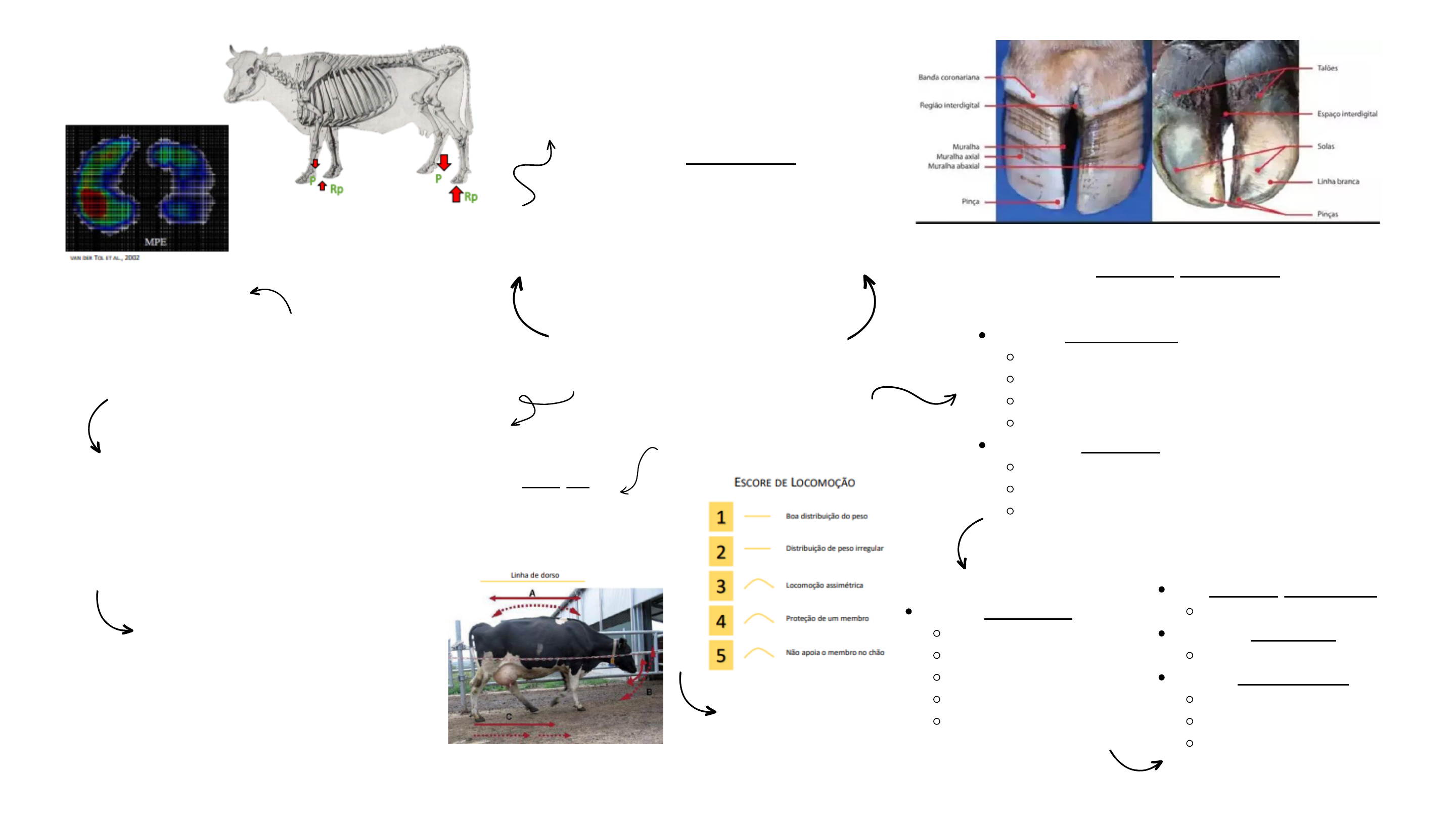 Afecções de Sistema Locomotor nos Bovinos Maior pressão em posição lateral posterior, e medial anterior. Desgaste supera taxa de crescimento córneo, em pisos duros/ abrasivos. FATORES NUTRICIONAIS Dietas c/ fibras de baixa qualidade; Tamanho da fibra (>5cm); Relação concentrado : volumoso; Tamanho do grão; Ausência de suplementação mineral. FATORES AMBIENTAIS Conforto animal; Umidade; Lotação; Sujidades; Piso. FATORES GENÉTICOS Seleção genética: alta produção x qualidade de casco e membros; Defeitos de formação; Raças taurinas x zebuínas. FATORES INDIVIDUAIS Idade; Estágio de lactação; ECC: +100 kg: x 1,9 chance de claudicação. INSPEÇÃO Porte físico; Estado corporal; Conformação geral. Posição quadrupedal; Em movimento. EXAME DO CASCO Após inspeção; Contenção (tronco, amarração); Limpeza c/ água e sabão; Avaliação; Provas: flexão, extensão, rotação, pinçamento. PODODERMATIRE (acomete tecido córneo): Pododermamite circunscrita; Pododermamite asséptica difusa (coriose); Erosão de talão; Doença da linha branca; DERMATITES (acomete tecidos moles): Dermatite digital; Dermatite interdigital; Flegmão interdigital. CLASSIFICAÇÃO DAS LESÕES Localização: BACTERIANA: Erosão de talão; Dermatite digital; Dermatite interdigital; Flegmão interdigital; Foot-Rot; Etiologia: DEGENERAÇÃO VASCULAR: Pododermatite asséptica difusa; TRAUMÁTICA: Hiperplasia interdigital; ORIGEM INCERTA: Pododermatite circunscrita; Doença da linha branca; Unha em "saca rolha". Dermatite Digital Dermatite papilomatosa; "Doença do moranguinho". Inflamação superficial da epiderme próxima a margem coronária ou do espaço interdigital Bactéria em forma de espiroqueta (Trepinema sp). Erosiva/ ulcerativa; Proliferativa. DIAGNÓSTICO Inspeção direta do membro após lavagem da região entre os bulbos dos talões, sobre-unhas, espaço interdigital e região dorsal; Lesão dolorida. Dermatite Interdigital Frieira dos cascos. Inflamação da epiderme interdigital por bactérias infecciosas. Dichelobacter Nodosus (bov); Fusobacterium Necrophorum (ov). Erosões e ulcerações superficiais na epiderme interdigital; Casos crônicos: pode haver acometimento da transição pele/casco na região do talão. DIAGNÓSTICO Inspeção após lavagem da região interdigital. Erosão de Talâo "V" negro. Claudicação não é um sinal comum nos cascos não comprometidos; Lesão muito extensa -> pode acometer o córium e causar complicações. Odor fétido. DIAGNÓSTICO Inspeção da região do talão após lavagem. Tratamentos Antibiótico tópico em pó, fazer uma pasta c/ talco + solução fisiologia;; Colocar na lesão + bandagens; Impermeabilizar c/ alcatrão. Recomendações após tirar: não deixar em ambiente úmido, controle do casco. Perda irregular do tecido córneo na região dos talões na forma de múltiplas depressões ou ranhuras oblíquas. Dichelobacter nodosus Limpeza da lesão (clorexidina); Antibiótico tópico (tetraciclina ou sulfa); Bandagem protetora (troca a cada 72h). P/ remover umidade do tecido.. Trocar a cada 72h até cicatrizar o tecido. Foot-Rot Flegmão Interdigital Necrobacilose interdigital; Abscesso do pé. Lesão necrótica profunda aguda originada de uma lesão na pele interdigital. Fusobacterium Necrophorum biótipo A ou AB (produtores de toxinas). Intenso edema e eritema na região distal do membro; Intensa claudicação, geralmente não apoia o membro no solo. TRATAMENTO Limpeza da lesão (clorexidina); Retirada do tecido necrótico; Antibiótico tópico (tetraciclina); Bandagem protetora. DIAGNÓSTICO Observação do intenso edema que separa os dígitos e lesão no espaço interdigital. Podridão dos cascos. Infecção conjunta da pele interdigital pelo Fusobacterium necrophorum e Diclobacter nodosus Cascos brandos: apresenta-se como dermatite digital; Cascos complicados: ocorre infecção da pele e do casco, gerando a separação entre aqueles estruturas. DIAGNÓSTICO Inspeção da região distal do membro. Oxitetraciclina (20mg/kg, IM, dose única); Penicilina procaína (20.000-30.000 UI/kg, IM, BID). Fenilbitazona (4mg/kg, IV, SID) -> em caso de dores de locomotor. TRATAMENTO Separa animal doente do rebanho; Abertura da lesão c/ tesoura de casco; Bandagem protetora c/ antibiotico tópico (tetraciclina); Antibiótico sistêmico: AINE (anti-inflamatório): Oxitetraciclina (20mg/kg, IM, SID, 48h); Ceftiofur (2,2mg/kg, SC, SID). 1g de oxitetraciclina (5ml); 1g de ceftiofur (5 ml). Fenilbitazona (4mg/kg, SID, 48h); Flunixina meglumina (2,2 mg/kg, IM, SID, 3 dias). Antibiótico sistêmico: Antibiose (perfusão regional): AINE: REAVALIAR ANIMAL APÓS 72H DE TTO Pododermatite Asséptica Difusa Agudo; Subclínica/ crônico. ACIDOSE RUMINAL CORIOSE AGUDA Apresenta dor = claudicação; Região coronária = nota-se hiperemia, elevação da temperatura e aumento de pulsação. CORIOSE SUBCLÍNICA/CRÔNICA Não produz sinais clínicos imediatos; Deterioração da qualidade do tecido córneo, pode estar associado ao aparecimento de outras lesões (sola dupla, hematomas de sola, doença da iha branca, úlceras de sola); Tecido córneo de péssima qualidde (áspecto farináceo). Coriose; Infosura; Antiga laminite. Distúrbio da microcirculação do córium que gera processo inflamatório degenerativo e alterações no junção derme-epidermal Fatores: nutricionais, ambientais, individuais, doenças sistêmicas. DEGENERAÇÃO LAMINAR Tratar causas primárias (distúrbio digestivo): Hidratação (solução de ringer c/ lactato); Caso de acidemia: corrigir c/ bicarbonato de sódio. Controle da dor: Fenilbutazona (4mg/kg, IV ou IM, SID, a cada 48h); Flunixina meglumina (2,2 mg/kg, IV, SID); Dipirona sódica. TRATAMENTO Apara corretiva; Suplementação c/ biotina (20mg/animal/dia); Suplementação mineral. TRATAMENTO Doença da Linha Branca Fissura enegrecidas na região da linha branca. Pododermatite Circuscrita Lesão isquêmica causada pela compressão 