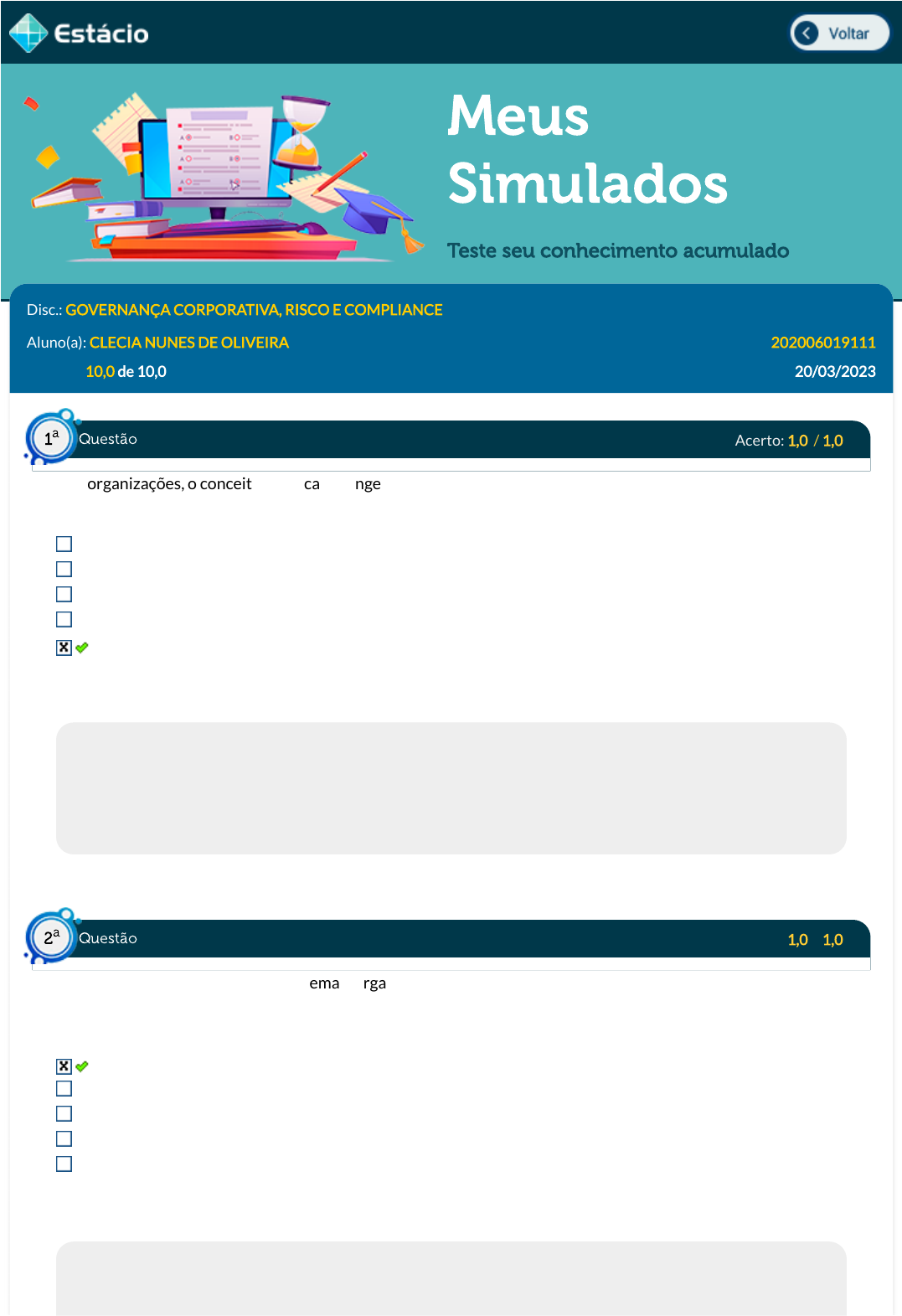 28/03/2023, 20:39 Estácio: Alunos https://simulado.estacio.br/alunos/ 1/6 Meus Simulados Teste seu conhecimento acumulado Disc.: GOVERNANÇA CORPORATIVA, RISCO E COMPLIANCE Aluno(a): CLECIA NUNES DE OLIVEIRA 202006019111 Acertos: 10,0 de 10,0 20/03/2023 Acerto: 1,0 / 1,0 Nas organizações, o conceito de ética abrange os princípios que moldam a conduta das pessoas nos negócios. Entre as boas práticas da ética empresarial, destaca-se: Informações parciais e inconstantes sobre os investimentos dos acionistas. Descarte inadequado e proposital de resíduos que contaminam o ambiente. Condições de trabalho consideradas desumanas para a garantia mínima de sobrevivência local. Manipulação das informações e comportamentos anticompetitivos. Atender as expectativas básicas da sociedade perante as instituições. Respondido em 28/03/2023 20:12:56 Explicação: A busca de ações pautadas pela ética deve ser do interesse dos próprios gestores, pois reconhecer e respeitar os direitos dos stakeholders garante o apoio e a legitimidade de suas ações, o que, em última instância, bene�cia tanto a empresa quanto eles mesmos. Caso contrário, as ações antiéticas podem causar danos aos interessados e, consequentemente, para a organização que não se resguardar eticamente. Acerto: 1,0 / 1,0 O sistema pelo qual as empresas e demais organizações são dirigidas, monitoradas e incentivadas, envolvendo os relacionamentos entre sócios, conselho de administração, diretoria, órgãos de �scalização e controle e demais partes interessadas, descreve o conceito de: Governança Corporativa. Controladoria. Compliance. Sistema Gerencial. Relatório da Administração. Respondido em 28/03/2023 20:13:27 Explicação: Questão1 a Questão2 a https://simulado.estacio.br/alunos/inicio.asp javascript:voltar(); 28/03/2023, 20:39 Estácio: Alunos https://simulado.estacio.br/alunos/ 2/6 Trata-se do conceito de Governança Corporativa conforme o Instituto Brasileiro de Governança Corporativa (IBGC, 2020), conforme abaixo: "Governança corporativa é o sistema pelo qual as empresas e demais organizações são dirigidas, monitoradas e incentivadas, envolvendo os relacionamentos entre sócios, conselho de administração, diretoria, órgãos de �scalização e controle e demais partes interessadas." "As boas práticas de governança corporativa convertem princípios básicos em recomendações objetivas, alinhando interesses com a �nalidade de preservar e otimizar o valor econômico de longo prazo da organização, facilitando seu acesso a recursos e contribuindo para a qualidade da gestão da organização, sua longevidade e o bem comum." Acerto: 1,0 / 1,0 Ética empresarial e governança corporativa são conceitos distintos, mas relacionados. Sobre eles podemos a�rmar que: Têm como objetivos demarcar os princípios que guiarão as ações a serem realizadas e em quanto tempo o resultado será alcançado. Determinam os padrões de desempenho operacional, gestão centralizadora e consideram as prioridades organizacionais acima das demandas da sociedade. É uma ferramenta de gestão fundamental para a realização da análise ambiental, constituindo a base do planejamento estratégico das organizações. Visam o planejamento de longo prazo e abordam a responsabilidade dos níveis mais altos da administração em formular e reformular suas estratégias empresariais. Embora a ética empresarial não seja um princípio da governança corporativa, representa a base que sustenta sua prática nas organizações. Respondido em 28/03/2023 20:16:17 Explicação: Os princípios da governança corporativa são: participação, estado de direito, transparência, responsabilidade, orientação por consenso, igualdade e inclusividade, efetividade e e�ciência. Esses princípios só poderão ser legitimados se estiverem pautados em comportamentos éticos. Torna-se natural a necessidade da inclusão de princípios éticos e de responsabilidade social no conceito de governança corporativa, uma vez que todos eles possuem os mesmos interesses quando de sua utilização, sejam eles de cunho social, ambiental ou nacional. Acerto: 1,0 / 1,0 (FCC/2012 - adaptado) Todas as atividades desenvolvidas por uma organização detêm certo grau de risco. Sobre o gerenciamento de riscos é correto a�rmar: Uma vez que os riscos tenham sido identi�cados e as decisões para o tratamento dos riscos tenham sido tomadas, é necessário que controles sejam implementados para assegurar que todos os riscos sejam eliminados, ou seja, reduzidos zero. Convém que a análise/avaliação de riscos considere apenas os recursos de processamento das informações, e inclua os resultados especí�cos da segurança da informação. Os processos de negócio não são relevantes nesse contexto. A seleção de controles de segurança da informação depende exclusivamente das decisões da organização, baseadas nos critérios para aceitação de risco. Nesse contexto, as legislações e regulamentações nacionais são irrelevantes. Os resultados da análise/avaliação de riscos ajudarão a direcionar e a determinar as ações gerenciais apropriadas e as prioridades para o gerenciamento dos riscos da segurança da informação, e para a implementação dos controles selecionados para a proteção contra estes riscos. Questão3 a Questão4 a 28/03/2023, 20:39 Estácio: Alunos https://simulado.estacio.br/alunos/ 3/6 A análise/avaliação de riscos deve contemplar todos os riscos internos e externos que podem afetar a continuidade do negócio, porém, não deve ser repetida periodicamente. Respondido em 28/03/2023 20:20:13 Explicação: Convém que os resultados orientem e determinem as ações de gestão apropriadas e as prioridades para o gerenciamento dos riscos de segurança da informação, e para a implementação dos controles selecionados, de maneira a proteger contra estes riscos. Acerto: 1,0 / 1,0 O conceito de risco é bastan