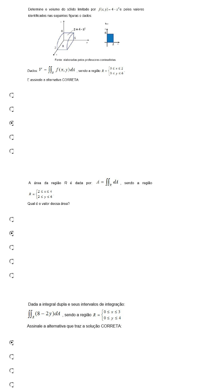 PERGUNTA 1 1. a. 10 unidades de volume. b. 104 unidades de volume. c. 32 unidades de volume. d. 24,5 unidades de volume. e. 56,4 unidades de volume. 0,2 pontos PERGUNTA 2 1. a. 10 unidades de área. b. 8 unidades de área. c. 11 unidades de área. d. 16 unidades de área. e. 22 unidades de área. 0,2 pontos PERGUNTA 3 1. a. 48. b. 56. c. 22. d. 38. e. 10. 0,2 pontos PERGUNTA 4 1. a. b. c. d. e.