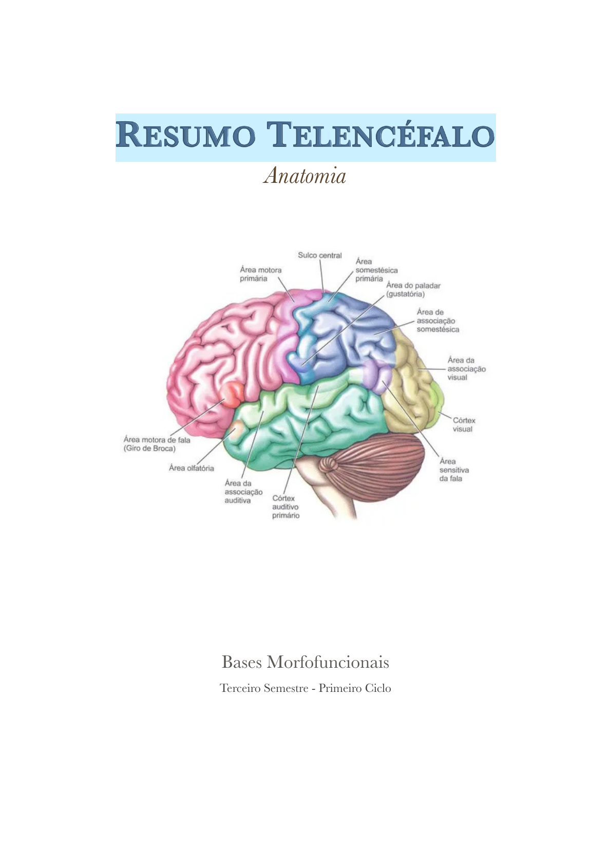 RESUMO TELENCÉFALO Anatomia Bases Morfofuncionais Terceiro Semestre - Primeiro Ciclo RESUMO ANATOMIA NATHYFANTIN 1 Telencéfalo O telencéfalo compreende os dois hemisférios cerebrais, direito e esquerdo, e uma pequena linha mediana situada na porção anterior do III ventrículo. Os dois hemisférios cerebrais são incompletamente separados pela fissura longitudinal do cérebro, cujo o assoalho é formado por uma larga faixa de fibras comissurais, denominada corpo caloso, principal meio de união entre os dois hemisférios. Os hemisférios possuem cavidades, os ventrículos laterais direito e esquerdo, que se comunicam com o III ventrículo pelos forames interventriculares. Cada hemisfério possui três pólos: Frontal, Occipital e Temporal; e três faces: Súpero- lateral (convexa); Medial (plana); e Inferior ou base do cérebro (irregular), repousando anteriormente nos andares anterior e médio da base do crânio e posteriormente na tenda do cerebelo. RESUMO ANATOMIA NATHYFANTIN 2 Sulcos e Giros: Durante o desenvolvimento embrionário, quando o tamanho do encéfalo aumenta rapidamente, a substância cinzenta do córtex aumenta com maior rapidez que a substância branca subjacente. Como resultado, a região cortical se enrola e se dobra sobre si mesma. Portanto, a superfície do cérebro do homem e de vários animais apresenta depressões denominadas sulcos, que delimitam os giros ou circunvoluções cerebrais. A existência dos sulcos permite considerável aumento do volume cerebral e sabe-se que cerca de dois terços da área ocupada pelo córtex cerebral estão “escondidos” nos sulcos. Em qualquer hemisfério, os dois sulcos mais importantes são o sulco lateral e o sulco central. Sulco Lateral: é o sulco que separa o lobo frontal do lobo temporal. Ele é subdividido em ascendente, anterior e posterior. Sulco Central: separa o lobo parietal do frontal. O sulco central é ladeado por dois giros paralelos, um anterior, giro pré-central, e outro posterior, giro pós-central. As RESUMO ANATOMIA NATHYFANTIN 3 áreas situadas adiante do sulco central relacionam-se com a MOTRICIDADE, enquanto as situadas atrás deste sulco relacionam-se com a SENSIBILIDADE. Outro sulco importante situado no telencéfalo, na face medial, é o Sulco Parieto- occipital, que separa o lobo parietal do occipital. Os lobos cerebrais recebem o nome de acordo com a sua localização em relação aos ossos do crânio. Portanto, temos cinco lobos: Frontal, Temporal, Parietal, Occipital e o Lobo da Ínsula, que é o único que não se relaciona com nenhum osso do crânio, pois está situado profundamente no sulco lateral. RESUMO ANATOMIA NATHYFANTIN 4 A divisão dos lobos não corresponde muito a uma divisão funcional, exceto pelo lobo occipital que parece estar relacionado somente com a visão. O lobo frontal está localizado acima do sulco lateral e adiante do sulco central. Na face medial do cérebro, o limite anterior do lobo occipital é o sulco parieto-occipital. Na sua face súpero-lateral, este limite é arbitrariamente situado em uma linha imaginaria que se une a terminação do sulco parieto-occipital, na borda superior do hemisfério, à incisura pré-occipital, situada na borda ínfero-lateral, cerca de 4 cm do pólo occipital. Do meio desta linha imaginaria parte uma segunda linha imaginaria em direção no ramo posterior do sulco lateral e que, juntamente com este ramo, limita o lobo temporal do lobo parietal. RESUMO ANATOMIA NATHYFANTIN 5 Face Súpero-lateral: Lobo Frontal: Sulcos: Sulco Pré-central: mais ou menos paralelo ao sulco central. Sulco Frontal Superior: inicia-se na porção superior do sulco pré-central e dirigi-se anteriormente no lobo frontal. É perpendicular a ele. Sulco Frontal Inferior: partindo da porção inferior do sulco pré-central, dirige-se para frente e para baixo. Lobo Frontal Lobo Temporal Lobo Parietal Lobo Occipital Lobo da Ínsula RESUMO ANATOMIA NATHYFANTIN 6 Giros: Giro Pré-central: localiza-se entre o sulco central e o sulco pré-central. Neste giro se localiza a área motora principal do cérebro (córtex motor). Giro Frontal Superior: localiza-se acima do sulco frontal superior. Giro Frontal Médio: localiza-se entre o sulco frontal superior e inferior. Giro Frontal Inferior: localiza-se abaixo do sulco frontal inferior. O giro frontal inferior do hemisfério esquerdo é o centro cortical da palavra falada Lobo Temporal: Sulcos: Sulco Temporal Superior: inicia-se próximo ao pólo temporal e dirige-se para trás RESUMO ANATOMIA NATHYFANTIN 7 paralelamente ao ramo posterior do sulco lateral, terminando no lobo parietal. Sulco Temporal Inferior: paralelo ao sulco temporal superior é geralmente formado por duas ou mais partes descontinuas. Giros: Giro Temporal Superior: localiza-se entre o sulco lateral e o sulco temporal superior. Giro Temporal Médio: localiza-se entre os sulcos temporal superior e o temporal inferior. Giro Temporal Inferior: localiza-se abaixo do sulco temporal inferior e se limita com o sulco occípito-temporal. Afastando-se os lábios do sulco lateral, aparece o seu assoalho, que é parte do giro temporal superior. A porção superior deste assoalho é atravessada por pequenos giros transversais, os giros temporais transversos, dos quais o mais evidente é o giro temporal transverso anterior. Esse é importante pois se localiza o centro cortical da audição. RESUMO ANATOMIA NATHYFANTIN 8 Lobo Parietal: Sulcos: Sulco Pós-central: localiza-se posteriormente ao giro pós-central. É paralelo ao sulco central. Sulco Intraparietal: geralmente localiza-se perpendicular ao sulco pós-central (com o qual pode estar unido) e estende-se para trás para terminar no lobo occipital. Diferentemente dos outros lobos, o lobo parietal apresenta um giro e dois lóbulos: Giro Pós-central: localiza-se entre o sulco central e o sulco pós-central. É no giro pós-central que se localiza uma das mais importantes áreas sensitivas do córtex, a área some