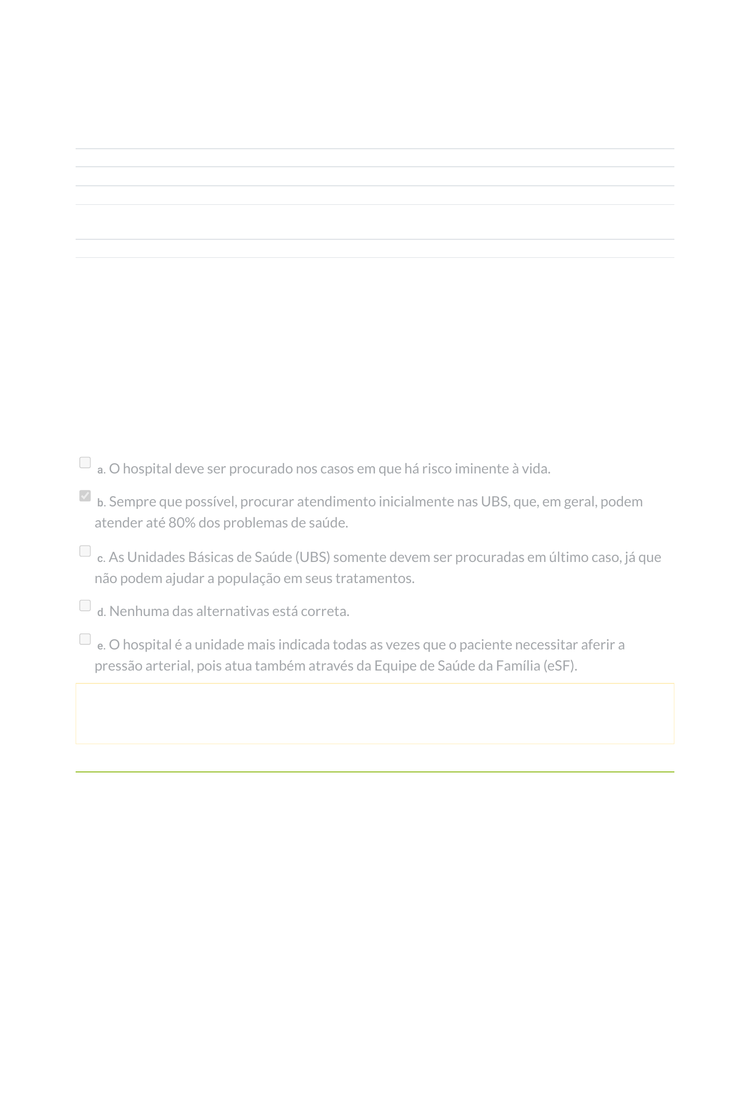 21/02/2023, 10:23 Atividades de Aprendizagem 1 - Níveis de Atenção à Saúde: Revisão da tentativa https://ead.icsf.com.br/mod/quiz/review.php?attempt=833246&cmid=1217 1/5 Painel / Meus Cursos / ICSF / REGISTRO E PROCESSAMENTO DA PRODUÇÃO ASSISTENCIAL (FATURAMENTO SUS) / Ciclo Básico / 03 - Níveis de Atenção à Saúde no Brasil / SUS 002.2 / Níveis de atenção à saúde / Atividades de Aprendizagem 1 - Níveis de Atenção à Saúde Iniciado em terça, 21 fev 2023, 07:52 Estado Finalizada Concluída em terça, 21 fev 2023, 08:25 Tempo empregado 33 minutos 41 segundos Notas 7,50/8,00 Avaliar 9,38 de um máximo de 10,00(94%) Questão 1 Completo Atingiu 0,50 de 1,00 Considerando o atendimento realizado pelas unidades de saúde do SUS em cada nível de atenção, analise as sentenças e marque a(s) alternativa(s) CORRETA(S): Escolha uma ou mais: a. O hospital deve ser procurado nos casos em que há risco iminente à vida. b. Sempre que possível, procurar atendimento inicialmente nas UBS, que, em geral, podem atender até 80% dos problemas de saúde. c. As Unidades Básicas de Saúde (UBS) somente devem ser procuradas em último caso, já que não podem ajudar a população em seus tratamentos. d. Nenhuma das alternativas está correta. e. O hospital é a unidade mais indicada todas as vezes que o paciente necessitar aferir a pressão arterial, pois atua também através da Equipe de Saúde da Família (eSF). Sua resposta está parcialmente correta. Você selecionou corretamente 1. https://ead.icsf.com.br/my https://ead.icsf.com.br/course/index.php?categoryid=8 https://ead.icsf.com.br/course/index.php?categoryid=6 https://ead.icsf.com.br/course/index.php?categoryid=9 https://ead.icsf.com.br/course/index.php?categoryid=28 https://ead.icsf.com.br/course/view.php?id=171 https://ead.icsf.com.br/course/view.php?id=171#section-4 https://ead.icsf.com.br/mod/quiz/view.php?id=1217 21/02/2023, 10:23 Atividades de Aprendizagem 1 - Níveis de Atenção à Saúde: Revisão da tentativa https://ead.icsf.com.br/mod/quiz/review.php?attempt=833246&cmid=1217 2/5 Questão 2 Completo Atingiu 1,00 de 1,00 Questão 3 Completo Atingiu 1,00 de 1,00 Das opções abaixo, assinale a que melhor de�ne a integralidade da assistência à saúde: Escolha uma opção: a. Nenhuma das alternativas está correta. b. Conjunto de ações e serviços preventivos ou integralizados. c. “Ações individuais e/ou coletivas apenas nas complexidades de Atenção Básica e Média Complexidade.” (MINISTÉRIO DA SAÚDE, art. 11 da Lei nº 8.853, de 19 de setembro de 1996). d. “Conjunto articulado e contínuo das ações e serviços preventivos e curativos, individuais e coletivos, exigidos para cada caso em todos os níveis de complexidade do sistema.” (MINISTÉRIO DA SAÚDE, art. 7º da Lei nº 8.080, de 19 de setembro de 1990). e. Ações de saúde preventivas e curativas regionalizadas por série. Sua resposta está correta. Observando o que menciona a Portaria de Consolidação PRC nº 2, de 28 de setembro de 2017, em seu Anexo XXIV, que trata da Política Nacional de Atenção Hospitalar (PNHOSP) no âmbito do SUS, coloque V para a(s) sentença(s) verdadeira(s) e F para a(s) falsa(s). Em seguida, marque a alternativa CORRETA: ( ) Os hospitais são instituições que funcionam exclusivamente em regime de 40h semanais. ( ) Os hospitais são instituições complexas, com densidade tecnológica especí�ca, de caráter multipro�ssional e interdisciplinar. ( ) Os hospitais prestam ações e serviços no âmbito do SUS e constituem-se como um ponto ou conjunto de pontos de atenção. ( ) Os hospitais são unidades de saúde que atuam de forma independente das outras unidades da sua região, e somente atendem a chamados da central de regulação se houver médicos disponíveis para atender pacientes extras, considerando os pacientes hospitalizados já internados na unidade. ( ) Os hospitais, enquanto integrantes da RAS, atuarão de forma articulada à Atenção Básica. Escolha uma opção: a. F, V, V, V e V. b. F, V, F, F e V. c. F, V, V, F e V. d. V, F, V, V e V. e. F, V, F, F e F. Sua resposta está correta. 21/02/2023, 10:23 Atividades de Aprendizagem 1 - Níveis de Atenção à Saúde: Revisão da tentativa https://ead.icsf.com.br/mod/quiz/review.php?attempt=833246&cmid=1217 3/5 Questão 4 Completo Atingiu 1,00 de 1,00 Questão 5 Completo Atingiu 1,00 de 1,00 Com relação à competência para realização das ações abaixo, faça a correlação das atividades, em seguida, marque a alternativa CORRETA: (1) Direção Nacional do SUS. (2) Direção Estadual do SUS. (3) Direção Municipal do SUS. ( ) De�nir e coordenar os sistemas de redes integradas de assistência de Alta Complexidade. ( ) Promover a descentralização, para os municípios, dos serviços e das ações de saúde. ( ) Prestar apoio técnico e �nanceiro aos municípios e executar supletivamente ações e serviços de saúde. ( ) Participar do planejamento, programação e organização da rede regionalizada e hierarquizada do Sistema Único de Saúde (SUS), em articulação com sua direção estadual. ( ) Acompanhar, controlar e avaliar as ações e os serviços de saúde, respeitadas as competências estaduais e municipais. Escolha uma opção: a. 1, 2, 2, 1 e 1. b. 1, 2, 1, 1 e 3. c. 1, 2, 2, 3 e 1. d. 2, 1, 3, 1 e 1. e. 1, 2, 3, 2 e 1. Sua resposta está correta. “É o processo de transferência de responsabilidades de gestão para os municípios, atendendo às determinações constitucionais e legais que embasam o SUS e que de�nem atribuições comuns e competências especí�cas à União, Estados, Distrito Federal e Municípios.” (MINISTÉRIO DA SAÚDE, 2009, p. 111-113). O enunciado acima apresenta o conceito de: Escolha uma opção: a. Mais de uma alternativa está correta. b. Descentralização. c. Regionalização. d. Gestão de comando único. e. Hierarquização. Sua resposta está correta. 21/02/2023, 10:23 Atividades de A