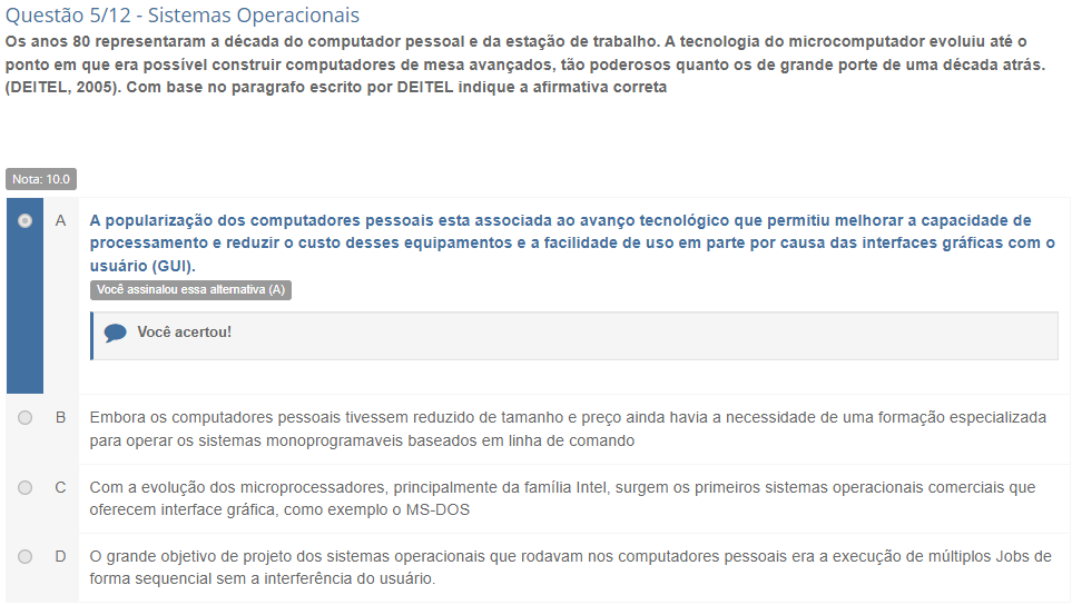 Os anos 80 representaram a década do computador pessoal e da estação de trabalho. A tecnologia do microcomputador evoluiu até o ponto em que era possível construir computadores de mesa avançados, tão poderosos quanto os de grande porte de uma década (DEITEL, 2005). Com base no parágrafo escrito por DEITEL indique a afirmativa correta. A A popularização dos computadores pessoais está associada ao avanço tecnológico que permitiu melhorar a capacidade de processamento e reduzir o custo desses equipamentos e a facilidade de uso em parte por causa das interfaces gráficas com o usuário (GUI). B Embora os computadores pessoais tivessem reduzido de tamanho e preço ainda havia a necessidade de uma formação especializada para operar os sistemas monoprogramáveis baseados em linha de comando. C Com a evolução dos microprocessadores, principalmente da família Intel, surgem os primeiros sistemas operacionais comerciais que oferecem interface gráfica, como exemplo o MS-DOS. D Grande objetivo de projeto dos sistemas operacionais que rodavam nos computadores pessoais era a execução de múltiplos Jobs de forma sequencial sem a interferência do usuário.