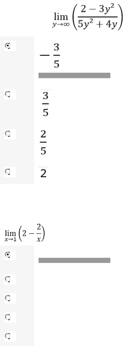 Questão 1/10 - Cálculo Diferencial e Integral a uma Variável Calcule o limite: A Você assinalou essa alternativa (A) B C D Questão 2/10 - Cálculo Diferencial e Integral a uma Variável Calcule o limite: A 0 Você assinalou essa alternativa (A) B 1 C 2 D -1 E -2 Questão 3/10 - Cálculo Diferencial e Integral a uma Variável Calcular o limite: A 0 B 1 C -1 D 3 Você assinalou essa alternativa (D) E -3 Questão 4/10 - Cálculo Diferencial e Integral a uma Variável Use o gráfico dado de f para dizer o valor de cada quantidade, se ela existir. Abaixo, marque a questão correta: A B C Você assinalou essa alternativa (C) D Questão 5/10 - Cálculo Diferencial e Integral a uma Variável Use uma simplificação algébrica para achar o limite, se existe: A 3x2 B 2x Você assinalou essa alternativa (B) C 4x D 5x3 Questão 6/10 - Cálculo Diferencial e Integral a uma Variável Use uma simplificação algébrica para achar o limite, se existe: A B Você assinalou essa alternativa (B) C D Questão 7/10 - Cálculo Diferencial e Integral a uma Variável Calcule o limite: A 0 Você assinalou essa alternativa (A) B 1 C 2 D -1 Questão 8/10 - Cálculo Diferencial e Integral a uma Variável Calcule a derivada da função A B Você assinalou essa alternativa (B) C D Questão 9/10 - Cálculo Diferencial e Integral a uma Variável Calcule a reta tangente e a reta normal à função y = x2 + 2x no ponto x0= 1. A Você assinalou essa alternativa (A) B C D Questão 10/10 - Cálculo Diferencial e Integral a uma Variável Calcule a derivada da função f(x) = (x2 - 1)3 A f'(x) = 3x4 - 2x2 + x B f'(x) = 6x5 - 12x3 + 6x Você assinalou essa alternativa (B) C f'(x) = 6x3 - x2 + 6 D f'(x) = 6x4 - 12x3 + 7x