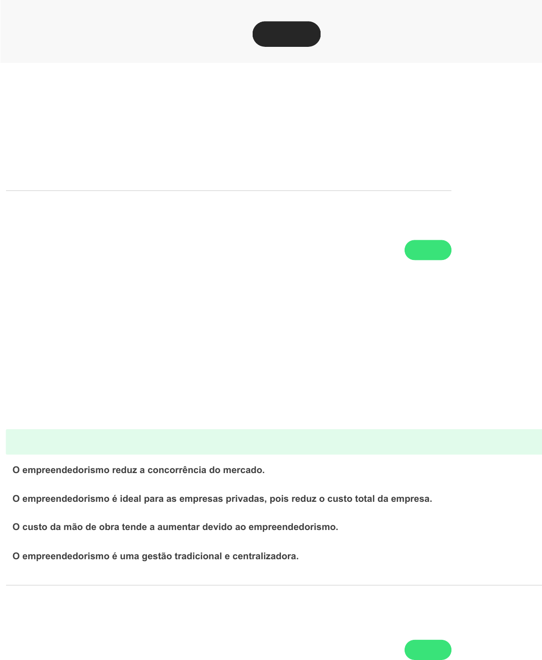 Conteúdo do exercício Ocultar opções de resposta Pergunta 1 1 / 1 Leia o trecho a seguir: “O papel do empreendedorismo no desenvolvimento econômico envolve mais do que apenas o aumento de produção e renda pe capita; envolve iniciar e constituir mudanças na estrutura do negócio e da sociedade.” Fonte: HISRICH, R.; Peter, M. Empreendedorismo. Porto Alegre: Bookman, 2004. p. 33. Considerando essas informações e o conteúdo estudado sobre empreendedorismo, pode-se afirmar que: Resposta coO empreendedorismo é capaz de aumentar a riqueza local. O empreendedorismo reduz a concorrência do mercado. O empreendedorismo é ideal para as empresas privadas, pois reduz o custo total da empresa. O custo da mão de obra tende a aumentar devido ao empreendedorismo. O empreendedorismo é uma gestão tradicional e centralizadora. Pergunta 2 1 / 1 O empreendedorismo busca a descoberta de novas oportunidades de negócios, com foco em inovações, enquanto o empreende assume riscos calculados, com o objetivo de obter lucratividade, reconhecimento pelo trabalho desenvolvido e crescimento no mercado. No entanto, como toda forma de administrar, o empreendedorismo possui vantagens e desvantagens. Considerando essas informações e o conteúdo estudado, analise as vantagens e desvantagens do empreendedorismo disponíve seguir e as associe a suas respectivas características Nota final Enviado em: 13/03/23 15:14 (AMT) 9/10 Ocultar opções de resposta Ocultar opções de resposta 2) Desvantagens ( ) Possibilidade de grande renda financeira. ( ) Necessidade de muito envolvimento, dedicação, trabalho e inteligência emocional. ( ) Estímulo à competição no mercado. ( ) Pressão referente à responsabilidade de gerir o próprio negócio. ( ) Produtos e serviços com maior qualidade. Agora, assinale a alternativa que apresenta a sequência correta: 2, 1, 1, 2, 2. Resposta co1, 1, 1, 2, 1. 2, 1, 1, 1, 2. 1, 2, 2, 1, 1. 1, 1, 1, 2, 2. Pergunta 3 1 / 1 Leia o trecho a seguir: A revolução tecnológica é uma ferramenta que vem acrescentar ao processo de inovação muitas mudanças. Empresas que dese aumentar sua participação de mercado, concorrer com produtos e serviços de qualidade e promover satisfação no cliente, estão revendo seus processos internos e analisado como responder as necessidades de mercado de forma rápida e eficiente. Assim, te como parceria a inovação para desenvolverem novos produtos e serviços e, consequentemente, terem a oportunidade de se diferenciarem de seus concorrentes. Para isso, procuram estimular, de forma proativa, o ambiente empreendedor dentro da organização. Considerando essas informações e o conteúdo estudado sobre empreendedorismo, pode-se afirmar que as empresas tradiciona empreendedoras são diferentes porque: Além de quererem criar algo novo para a empresa e assumir responsabilidades, o intraempreendedor não cria vínculo com a organização onde trabalha, frustrando a organização. Resposta co As empresas tradicionais não estimulam um ambiente empreendedor onde seus colaboradores possam desenvolver novos produtos e serviços. Esse perfil está atrelado à empresa empreendedora. Possuir uma boa rede de comunicação, boa comunicação com clientes, fornecedores e funcionários, concorrentes, sã características das empresas tradicionais. As características do empreendedor são diferentes das características do intraempreendedor, pois o primeiro cuida do seu próprio negócio e o segundo trabalha para uma empresa. As empresas empreendedoras possuem muitas características importantes que a tornam diferentes, como muita Ocultar opções de resposta Pergunta 4 1 / 1 Leia o trecho a seguir: “Um empreendedor de sucesso sabe não só como gerir e guiar um negócio ou uma empresa, mas também como liderar, orientar buscar oportunidades para o crescimento do negócio e de cada funcionário que integra o seu empreendimento, pois sabe que um equipe bem conduzida e motivada é muito mais eficiente e ajuda a empresa a se destacar no mercado.” Fonte: DA SILVA, A. Dez empreendedores de sucesso para se inspirar. 2019. Disponível em: <https://guiaempreendedor.com/10- empreendedores-de-sucesso-para-se-inspirar/>. Acesso em: 5 jul. 2019. Considerando essas informações e o conteúdo estudado sobre tipos de empreendedorismo, analise as afirmativas a seguir e ass V para a(s) verdadeira(s) e F para a(s) falsa(s). I. ( ) Dentro das organizações, o empreendedorismo se reflete nas atividades empreendedoras, como orientações vindas da alta administração, por exemplo. II. ( ) Os empreendedores são visionários e estratégicos, mas preferem trabalhar isolados, sem a necessidade de manter uma frequente comunicação. III. ( ) Empresas empreendedoras são mais tradicionais e fortes, fortalecem sua marca no mercado e, consequentemente, fideliza seus clientes. IV. ( ) As empresas já existentes também podem ser empreendedoras e buscar novas oportunidades. V. ( ) O empreendedorismo não está sempre ligado ao desenvolvimento de negócios lucrativos. Agora assinale a alternativa que apresenta a sequência correta: Resposta coV, F, F, V, V. V, F, V, F, F. V, V, F, F, V. F, V, V, F, V. F, F, V, F, V. Pergunta 5 1 / 1 Leia o trecho a seguir: Ocultar opções de resposta “Pesquisa realizada pelo Sebrae (Serviço Brasileiro de Apoio às Micro e Pequenas Empresas) em 2015, sobre os empreendedor Brasil, traz a seguinte informação: ‘[...] Também para a escolaridade, as distribuições se assemelham. Um baixo número de empreendedores possui curso superior completo: 7% dos empreendedores iniciais e 5% dos empreendedores estabelecidos. Co escolaridade menor, abaixo do segundo grau, são 44% dos empreendedores iniciais e 56% dos estabelecidos. E, que possuem o segundo grau completo, são 49% entre os empreendedores iniciais e 39% entre os estabelecidos’.” Fonte: Global Entrepreneurship Monitor. Empreendedorismo no Brasil. 2015 Disponível em: <https://bibliote