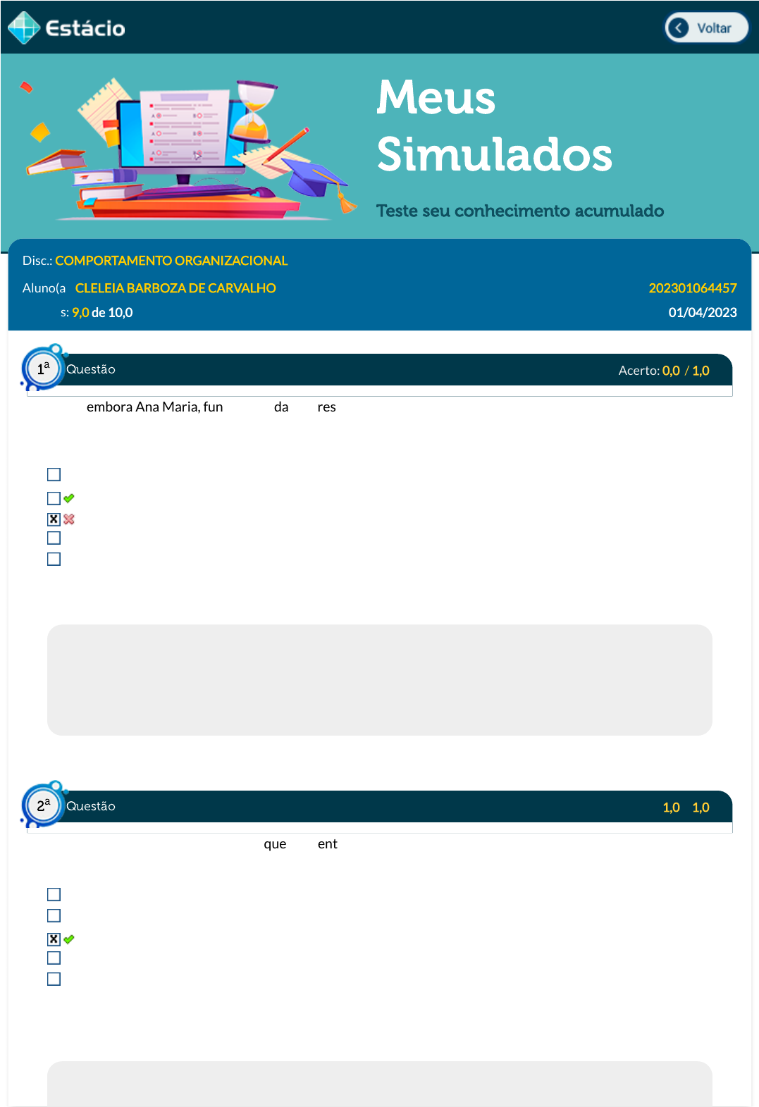 01/04/2023, 16:36 Estácio: Alunos https://simulado.estacio.br/alunos/ 1/7 Meus Simulados Teste seu conhecimento acumulado Disc.: COMPORTAMENTO ORGANIZACIONAL Aluno(a): CLELEIA BARBOZA DE CARVALHO 202301064457 Acertos: 9,0 de 10,0 01/04/2023 Acerto: 0,0 / 1,0 Muito embora Ana Maria, funcionária da empresa Águas Belas, saiba que diversas barreiras podem di�cultar ou distorcer a comunicação e�caz, quando comunica fatos negativos aos seus superiores, ela manipula as informações para que estes a vejam de forma mais favorável. Logo, pode-se dizer corretamente que Ana Maria: escolhe os canais mais ricos para divulgar as informações �ltra o conteúdo da mensagem pratica a percepção seletiva. mantém a natureza da informação. utilização a sensação coletiva Respondido em 01/04/2023 13:22:45 Explicação: Resposta correta: “"iltra o conteúdo da mensagem". A �ltragem ocorre quando o emissor manipula a informação para que a mensagem chegue de forma mais favorável a quem a ouve, omitindo ou distorcendo partes da comunicação. Se alguém tem medo de dar notícias ruins ou quer agradar a todos, a tendência é �ltrar seu conteúdo, comunicando sua parte favorável. Acerto: 1,0 / 1,0 Maria sabe que a percepção e, consequentemente, a comunicação são in�uenciadas também pela atitude. Por essa razão, ela corretamente: fortalece seu modelo mental durante as reuniões, utilizando-se de estereótipos. adota a escuta passiva para melhorar o processo de comunicação com seus colegas de trabalho. oferece feedback da mensagem recebida e pede feedback quando a mensagem é enviada. utiliza-se da percepção seletiva quando vai se comunicar com alguém em seu ambiente de trabalho. agenda reuniões de feedback mais genéricas com seu time, já que estas reuniões funcionam melhor quando o gestor é menos especí�co naquilo que o empregado precisa melhorar. Respondido em 01/04/2023 13:27:29 Explicação: Questão1 a Questão2 a https://simulado.estacio.br/alunos/inicio.asp javascript:voltar(); 01/04/2023, 16:36 Estácio: Alunos https://simulado.estacio.br/alunos/ 2/7 Resposta correta: "oferece feedback da mensagem recebida e pede feedback quando a mensagem é enviada.". Para que o �uxo da comunicação seja completo, o feedback dado ao emissor é essencial. Dessa forma, é possível lhe oferecer uma resposta, con�rmando (ou não) o entendimento sobre o que foi comunicado. Dessa forma, Maria acertadamente oferece e pede feedback garantindo que a comunicação se estabeleceu da maneira esperada. As outras alternativas estão incorretas. Não se deve utilizar da percepção seletiva para se comunicar e nem de estereótipos. Isso prejudica a comunicação. O mesmo ocorre com a escuta passiva, que permite que a mensagem seja entendida erroneamente e não haja correção. Já o feedeback deve ser sempre o mais especí�co e construtivo possível, visando ajudar o empregado a melhorar nos aspectos necessários. Acerto: 1,0 / 1,0 Com o processo de globalização o mundo tornou-se mais dinâmico, o que permitiu que as empresas procurassem sempre estar se adequando às novas formas de composição organizacional, inclusive no que concerne à gestão de pessoas. Dentre essas preocupações, podemos citar o papel da liderança no processo de gestão. Assinale a alternativa que melhor representa o conceito do papel de um líder. O líder procura comandar as pessoas, centralizar o poder e impor seus conhecimentos além de pensar em como se chegar aos resultados e lucros. O líder tem a capacidade de motivar as pessoas, moldando-as segundo seus planos e atribui-lhes outros objetivos que não os delas. O líder sabe manter pessoas a �m de garantir o processo de desenvolvimento organizacional e a busca por resultados práticos. O líder sabe inspirar seus colaboradores a despertar a curiosidade, a assumir responsabilidades e a ter ousadia além de se preocupar em passar adiante os seus conhecimentos. O líder deve estimular os con�itos como forma de facilitar a saída da zona de conforto, trazer novas ideias e soluções, com isso, permitindo o alcance de metas e resultados. Respondido em 01/04/2023 13:28:51 Explicação: O líder não centraliza o poder e não impõe seus conhecimentos. O líder não mantém as pessoas. O líder não molda as pessoas de acordo com seus planos de líder. O líder deve evitar ou gerenciar os possíveis con�itos, não estimular os con�itos. Logo a correta é o líder deve despertar a curiosidade nas pessoas e desenvolver ousadia. Acerto: 1,0 / 1,0 Liderança é uma competência que envolve a habilidade de in�uenciar pessoas para trabalharem engajadas visando atingir os objetivos da equipe buscando o bem comum. A liderança pode ser aplicada através do uso do poder e da autoridade. Sobre esta competência, analise o caso a seguir e escolha a resposta que melhor representa a liderança de Lucas Lucas é gestor em uma empresa de transportes. Ele lidera sua equipe de 15 colaboradores entre motoristas, assistentes administrativos e carregadores de maneira diferente. Ele acredita que a maturidade do pro�ssional e a relevância da tarefa em que eles estão realizando deve ser levada em consideração para direcionar a sua forma de liderar. João é seu motorista mais experiente, ele é responsável e se preocupa muito com os prazos a cumprir em suas entregas. Alexandra é uma assistente administrativa muito desorganizada, vive perdendo documentos e esquece de fazer tarefas importantes, apesar de ser muito querida por todos ela ainda está aprendendo a função. Os carregadores são colaboradores terceirizados que são chamados de acordo com a demanda do trabalho. Questão3 a Questão4 a 01/04/2023, 16:36 Estácio: Alunos https://simulado.estacio.br/alunos/ 3/7 I. Lucas aplica a liderança situacional, onde se considera que os melhores líderes são aqueles que adaptam sua liderança à tarefa, às pessoas, às metas, ao projeto em mãos e as circu