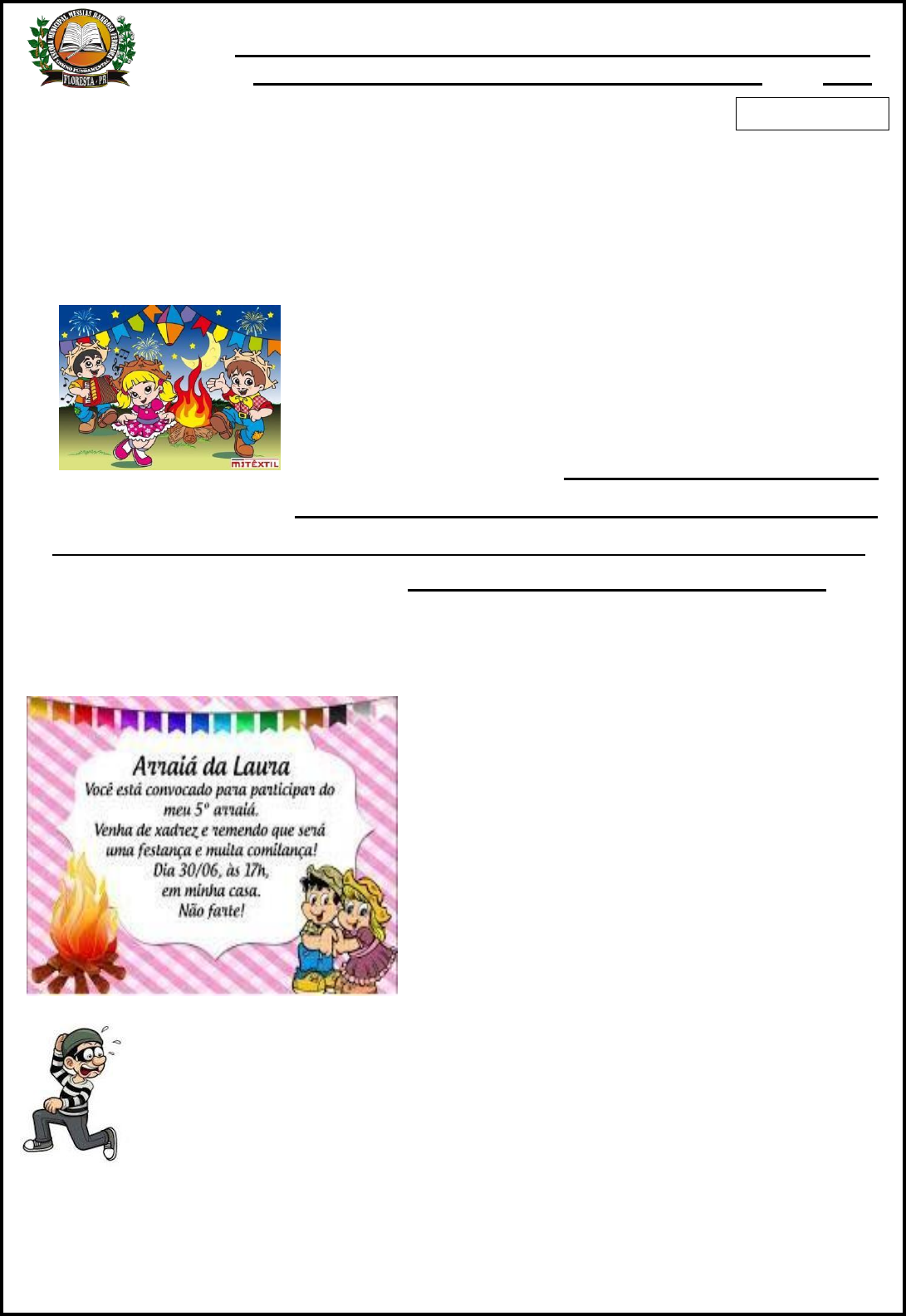 Escola Municipal “Messias Barbosa Ferreira”. Ensino Fundamental Aluno (a): Professora: 5˚ ano ATIVIDADES AVALIATIVA LÍNGUA PORTUGUESA 5º ANO Querido aluno, essas atividades deverão ser devolvidas nos dias 12/04/2021 e 13/04/2021 para serem avaliadas por sua professora e também contará como presença. Leia o texto abaixo: “A festa junina” Lucas foi a Festa Junina. Ele comeu três sacos de pipoca, quatro paçocas, e três queijadinhas. Agora ele está com dor de barriga. Agora responda: Quem foi a Festa Junina? Quais alimentos ele comeu? O que ele sentiu depois de comer tanto? Explorando o tema através de outras tipologias textuais: Cada questão possui apenas uma resposta correta que deve ser assinalada com um X: Texto 01 1. Leia o texto ao lado. O texto pertence ao gênero textual: (a) Bilhete (b) Convite (c) Carta (d) E-mail. 2. De acordo com o texto a festa será as: (a) 16 horas (b) 17 horas (c) 18 horas (d) 19 horas Texto 02 Essa piadinha você vai gostar! P: O que um ladrão perguntou para o outro em uma Festa Junina? R: Vamos formar uma quadrilha? 1. O texto em estudo tem a finalidade de: (a) Informar (b) Instruir (c) Divertir (d) Ensinar 05/04 à 09/04 2. Na frase “Vamos formar uma quadrilha?”, a intenção do ladrão era: (a) Dançar uma música típica (b) Formar um grupo de ladrões (c) Aglomerar pessoas para se divertir (d) Desenvolver um grupo Texto 03 3. A intenção do Cascão no primeiro quadrinho em relação ao Cebolinha é: (a) Relatar um fato (b) Dar um conselho (c) Contar uma história (d) Enumerar opções 4. A expressão facial do Cebolinha no segundo quadrinho indica: (a) Calma (b) Esperteza (c) Nervoso (d) Medo 5. O “brincar com fogo” que Cascão adverte se refere à: (a) Mexer com a fogueira da festa Junina (b) Soltar fogos de artifício (c) Provocar a Mônica (d) Carregar uma caixa de fósforo 6. O fogo sobre a cabeça da Mônica indica que ela: Texto 04 7. A frase do cartaz ao lado remete: (a) Uma ordem (b) Uma opinião (c) Um fato (d) Uma reflexão (a) Está preocupada com a atitude do Cebolinha (b) Ouviu a fala do Cascão (c) Está fantasiada para dançar quadrilha (d) Está furiosa com a provocação do Cebolinha 8. A palavra sublinhada na frase “Não solte balões” indica: (a) Modo (b) Tempo (c) Negação (d) Lugar Leia o texto abaixo: Agora responda: “O sorvete” Luís falou pra sua mãe: _ Quero sorvete! A mãe disse: _ Qual a palavra mágica que você deve dizer? _ Me compra sorvete, por favor! _ Assim é bem melhor, disse sua mãe. Quem quer sorvete? Como Luís pediu sorvete para sua mãe a primeira vez? Qual era a palavra mágica? Texto 01 Explorando o tema através de outras tipologias textuais: História do Sorvete A ideia de misturar frutas com gelo começou com os egípcios e árabes, mas foi na China, há três mil anos, que o sorvete foi realmente criado. A nobreza oriental preparava uma pasta feita de leite, arroz e frutas que era colocada na neve para solidificar. O principal problema era armazenar neve para o verão em rudimentares, câmaras frigoríficas, subterrâneas com grossas paredes de pedra. Na Idade Média, Marco Polo, o explorador veneziano, levou o sorvete para a Itália. Dali, os famosos sucos de frutas congelados alcançaram a França e viraram mania em outros países. No Século 16, o italiano Bernardo Buontalenti inventou o sorvete a base de leite, mais macio e nutritivo. No século seguinte, um outro italiano, Procópio Colteli, criou a máquina de fazer sorvete. Hoje essa já é uma delícia mundial! De acordo com a Associação Brasileira de Indústrias de Sorvete, só em 2004, no Brasil, foram consumidos 493 milhões de litros dessa gostosura, o que significa o consumo de 2,75 litros por habitante, em média. Gazeta do Povo. 7 jan. 2006. Caderno Gazetinha, p. 6. Entendendo o texto: Para cada alternativa correta assinale um X. 1. Qual foi o ponto inicial para a produção de sorvete? (a) Egípcios trazer a ideia da China (b) Misturar leite com arroz e frutas (c) A mistura de gelo com frutas (d) Armazenar neve para o verão 2. Na frase “uma pasta feita de leite, arroz e frutas que era colocada na neve para solidificar” A palavra sublinhada pode ser substituída por: (a) Amolecer (b) Evaporar (c) Endurecer (d) Entalhar 3. A reportagem em estudo foi retirada de: (a) Um livro (b) Uma página virtual (c) Uma revista (d) Um jornal 4. Os fatos apresentados em uma reportagem são: (a) Reais (b) Imaginários (c) Inventados (d) Fantasiosos Texto 02 5. Segundo a tirinha o dia estava propício para tomar sorvete por que; (a) Magali e Mônica passeavam pelo parque (b) Estava muito calor com um sol escaldante (c) O sorveteiro era amigo da Magali (d) Era o melhor sorvete do bairro 6. Ao ouvir o pedido da Magali ao sorveteiro Mônica imaginou que: a) Magali estava de dieta b) Magali estava com muita fome c) Magali dividiria o sorvete com ela d) Magali não gostava de sorvete Texto 03. SORVETE DE MORANGO CASEIRO Ingredientes 1 caixa de creme de leite 1 caixa de leite condensado 1 caixa de gelatina em pó sabor morango 250 ml de água gelada 250 ml de água fervendo Modo de Preparo Bata a água fervendo e a gelatina no liquidificador. Após fazer a mistura, acrescente a água gelada e bata mais. Coloque o creme de leite e o leite condensado e misture novamente. Leve ao freezer por 12 horas. Coloque o sorvete em uma batedeira e bata até ficar cremoso. Coloque o sorvete em um pirex e adicione geleia de morango por cima. Leve ao freezer por duas horas. 7. Os números que aparecem na primeira parte do texto indicam: (a) Tempo (b) Quantidade (c) Sequência (d) Ordem ATIVIDADE AVALIATIVA DE MATEMÁTICA 1. Leia as situações problemas abaixo, resolva a operação e escreva a resposta: (a) João, Luíza e Paulo são irmãos. João tem 20 anos, Luíza 15 e Paulo 10. Qual é soma das idades dos irmãos? R: (b) Joel irá comprar uma bicicleta. Economizou durante 3 meses, no 1º primeiro mês economizou R$ 500,00, no 2
