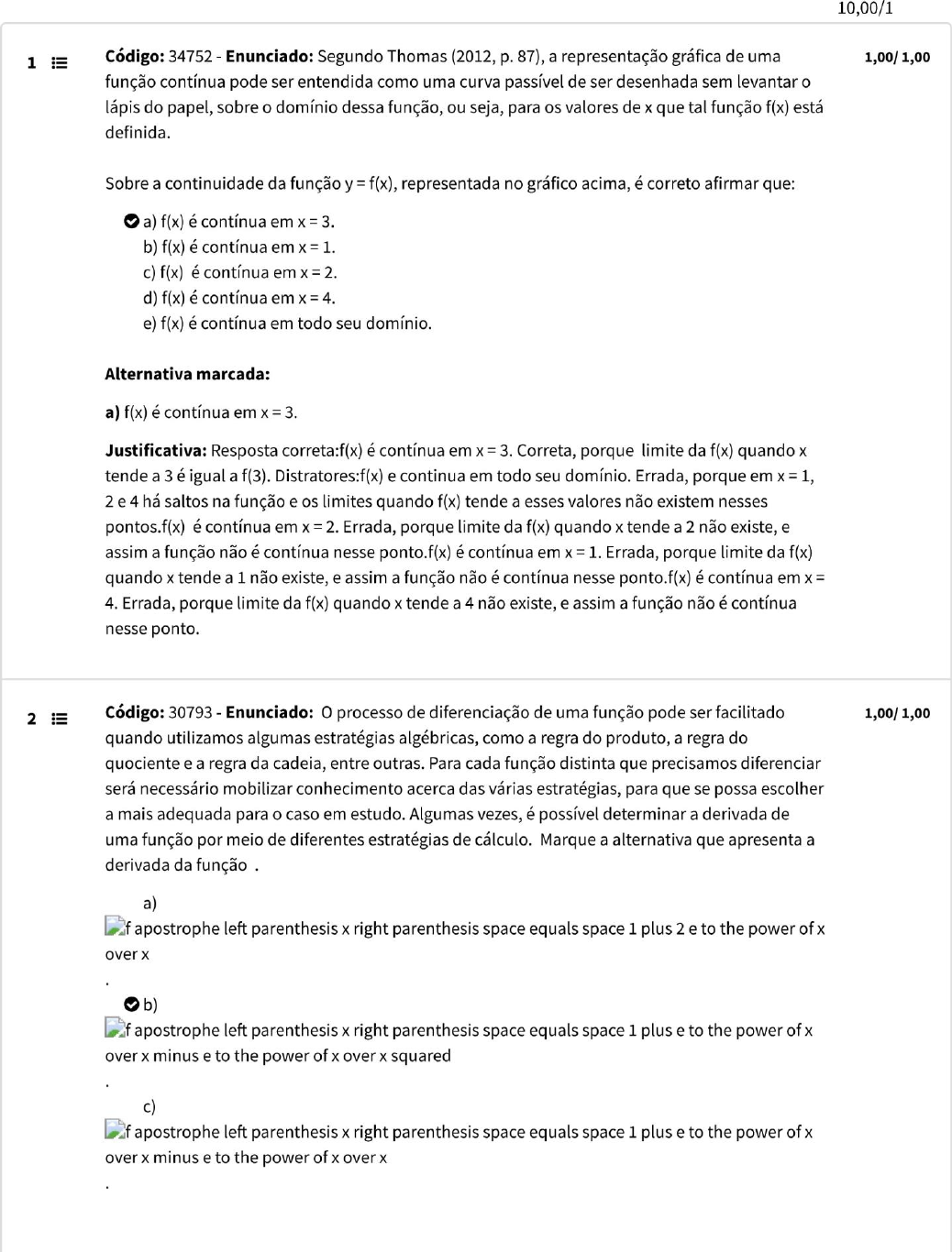 26/04/2021 llumno i l umno.sgp.starlinetecnologia.com.br/ilumno/schedule/resultcandidatedetailprint/6214697/68ce0976-bf94-11 e9-8efb-0242ac110033/ 1/5 Correto Incorreto Anulada Discursiva Objetiva Total: d) f apostrophe left parenthesis x right parenthesis space equals space e to the power of x over x minus e to the power of x over x squared 26/04/2021 llumno i l umno.sgp.starlinetecnologia.com.br/ilumno/schedule/resultcandidatedetailprint/6214697/68ce0976-bf94-11 e9-8efb-0242ac110033/ 2/5 f apostrophe left parenthesis x right parenthesis space equals space 1 plus e to the power of x over x plus e to the power of x over x squared Alternativa marcada: b) f apostrophe left parenthesis x right parenthesis space equals space 1 plus e to the power of x over x minus e to the power of x over x squared Justificativa: Resposta correta: Distratores:, Errada, porque, apesar de a regra do produto indicar Sinal de adição, dependendo da função, o Sinal será negativo. Errada, porque faltou a parcela referente à constante, falha que pode ter tido origem no mau uso da regra do produto. Errada, porque a última parcela tem expoente 2 no denominador. O erro pode ter ocorrido na derivação de l/x. Errada, talvez porque a regra do produto tenha sido usada de forma incorreta. 3 . CÓdigo: 30789 - Enunciado: Algumas integrais indefinidas podem ser determinadas a partir da relação existente entre derivadas e primitivas, quando podemos usar regras já conhecidas de derivação para obter regras correspondentes para a integração. Assim, temos o que chamamos de integrais imediatas, algumas delas presentes em tabelas de integrais. Marque a alternativa que apresenta o resultado de . a) space e to the power of x space plus C. e to the power of x plus C. c) space 1 half e to the power of x plus C. d) -space 2 e to the power of x. e ) -space In space vertical line 2 e to the power of x vertical line space plus C. Alternativa marcada: b) e to the power of x plus C. Justificativa: Resposta correta: Distratores: Errada, porque falta a constante de integração, obrigatória. Errada, porque a função cuja integral envolve Ln é a l/x. Errada, porque desconsiderou-se a constante que multiplica e A x. Errada, porque a constante que multiplica e A x não inverte por ter saído do integrando. 4 Código: 34736 - Enunciado: Há diferentes formas de se estabelecer processos de otimização, a diferenciação não é a única ferramenta matemática para se encontrar pontos de máximo ou de mínimo, mas é bastante eficiente e adequada para casos em que se conhece a função que descreve o comportamento da variável que se deseja otimizar, como nos problemas envolvendo custos, receita e lucro de uma empresa.Considere que a função , em reais, modela o valor da receita em função do número de unidades vendidas. O valor de que maximiza a receita é igual a: a) 2,5 unidades. b) 2,24 reais. c) 2,5 reais. d) amais ou menos2,5 unidades. e) 2,24 unidades. Alternativa marcada: a) 2,5 unidades. Justificativa: Resposta correta:2,5 unidades. Correta, porque:Distratores:2,5 reais. Errada, porque não são reais e sim as unidades que fazem com que a receita seja máxima.2,24 26/04/2021 llumno i l umno.sgp.starlinetecnologia.com.br/ilumno/schedule/resultcandidatedetailprint/6214697/68ce0976-bf94-11 e9-8efb-0242ac110033/ 3/5 unidades. Errada, porque essa é a reposta quando se iguala a zero a própria função R(x), o que está incorreto, porque isso seria uma receita igual a zero e não uma maximização de receita, que exige a derivada da função para igualar a zero.2,24 reais. Errada, porque essa é a resposta quando se iguala a zero a própria função R(x), e ainda mensurada em unidades e não em reais.2,5 unidades. Errada, porque - 2,5 unidades vendidas não faz sentido, neste contexto. 5 Código: 30818 - Enunciado: A derivada pode ser entendida como taxa de variação instantânea e, 1,50/ 1,50 geometricamente, como a inclinação da reta tangente a uma curva em um ponto dessa curva. Determinar a equação da reta tangente à curva é um dos problemas que o cálculo diferencial resolve. Em pontos que estão na vizinhança do ponto para o qual temos a derivada, o comportamento da reta tangente à curva é muito próximo do comportamento da própria curva. Portanto, determinar a reta tangente à curva em um ponto pode ser útil, por exemplo, para aproximar valores da função com uma equação mais simples. A figura a seguir mostra uma tangente à cuva no ponto . Marque a alternativa que apresenta a equação da reta tangente à f(x) no ponto onde a = 1. r left parenthesis x right parenthesis equals x space plus space e. e b) ar left parenthesis x right parenthesis equals e x. r left parenthesis x right parenthesis equals e to the power of x. r left parenthesis x right parenthesis equals e to the power of x space plus space 1. r left parenthesis x right parenthesis equals e x space plus space 1. Alternativa marcada: r left parenthesis x right parenthesis equals e x. Justificativa: Resposta correta: Distratores: Errada, pois essa é a equação da derivada e não a da reta, cuja inclinação é a derivada. Errada, porque a reta não passa por (1,0) e porque a equação de reta deve ser usada, não a exponencial. Errada, porque a reta não passa por (1,0). Errada, porque e é o coeficiente angular, e não o coeficiente linear. 6 CÓdigo: 34753 - Enunciado: A partir de um estudo sobre os dados da produção, gerados no 1,00/ 1,00 sistema integrado utilizado pela Calçadus S. A., o modelo de custo total para produzir x unidades de seu principal produto, a sapatilha lisa preta, é descrito pela equação C(x) = 500 +50x, em reais.Determine a função que descreve o custo médio de produção, para que subsidie o processo de tomada de decisão da direção da Calçadus S. A. a) C space apostrophe space left parenthesis x right parenthesis space equals space 50 C m é d i o left parenthesis x right parenthesis space equals fraction 