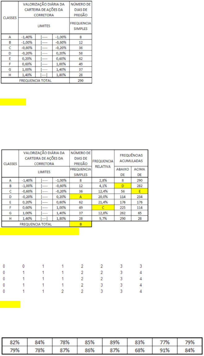 Questão 2: Uma corretora de ações agrupou as valorizações de uma de suas carteiras no quadro abaixo. Posteriormente calculou as frequências relativas e agrupadas. O quadro abaixo apresenta esses cálculos, mas, em razão de descuido do funcionário encarregado por eles, cinco valores foram omitidos. Recupere esses dados e informe o valor respectivo deles (de A até E), assinalando a alternativa correta: