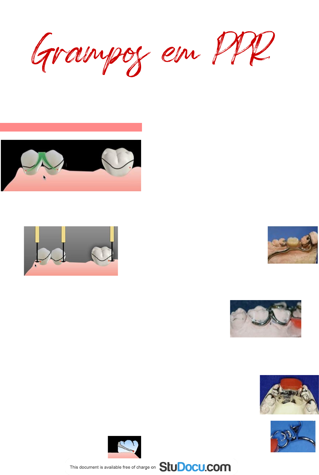 ⇢ os grampos da PPR são diferentes dos grampos da dentística pois não conferem apenas retenção, conferem suporte e estabilização do dente e da prótese ÁREAS DE RETENÇÃO ⇢ são as áreas onde as pontas dos grampos vão se alocar; ⇢ representadas por um pontinho vermelho na área de retenção, que é encontrado através do calibrador ⇢ a ponta do calibrador e a haste devem tocar o dente ⇢ os desenhos dos grampos podem variar de acordo com a localização da área de retenção TIPOS DE GRAMPOS circunferencial simples circunferencial invertido circunferencial reverso geminado MDL grampo T grampo I grampo L ⇢ apenas o braço de retenção tem o desenho diferente ⇢ os grampos circunferenciais vêm de oclusal e “abraçam” o dente; ação de abraçamento ⇢ os grampos tipo TIL têm uma alça saindo da cela, tendo uma ação chamada ação de ponta, pois apenas a ponta do grampo toca o dente (grampo circunferencial simples) muito utilizados em molares e também em pré-molares tem uma versatilidade com relação a dentes posteriores grampo de retenção: terço final flexível indicação: molares, pré-molares e caninos (dentossuportadas) zona de retenção distante ao espaço protético contraindicação: extremo livre (posição do apoio) (classe I e II de Kennedy) apoio e corpo vizinhos ao espaço protético (área desdentada) não é muito estético (grampo circunferencial invertido) o braço de retenção fica na lingual grampo de retenção: terço final flexível indicação: molares, pré-molares zona de retenção na face lingual do dente contraindicação: extremo livre dependendo da posição do apoio apoio pode estar vizinho ou distante do espaço desdentado (grampo circunferencial reverso) ⇢ indicação: - molares, pré-molares - zona de retenção vizinha ao espaço protético - Classe III ou classe II com modificação - plano guia e placa proximal mesial ⇢ apoio, corpo e conector menor distante do espaço protético (grampo circunferencial geminado) ⇢ classe II, III e IV como retentores indiretos áreas de retenção diametralmente opostas ⇢ normalmente usados em regiões posteriores ⇢ oferecem uma vantagem pois possui retenção dobrada: duas áreas de retenção em dentes diferentes (grampo mdl) ⇢ áreas estéticas ⇢ explora o paralelismo ⇢ somente para dentes pilares anteriores ⇢ contraindicado em pilares diretos de extremo livre ⇢ não possui braço de retenção (“diferentão”) ⇢ placas proximais: vão oferecer retenção friccional ⇢ a parte lingual serve como apoio e braço de oposição Baixado por Ana Paula Pinheiro (anapaulaloiolapinheiro3@gmail.com) lOMoARcPSD|12687863 ⇢ desliza sobre o dente nas superfícies proximais com as placas rentes essa superfície, fazendo o deslizamento e realizando retenção por fricção ⇢ não pode ser utilizado em áreas extensas, apenas em casos simples ⇢ altamente estético, pois não fica aparecendo MDL modificado – extensão apenas para uma face proximal (grampos de roach) TIPO BARRA OU COM AÇÃO DE PONTA ⇢ origem: cervical ⇢ estética ⇢ todas as classes de Kennedy ⇢ pouca reciprocidade horizontal ⇢ ação de ponta ⇢ grampos: T, U, L, I, C, S grampo I ⇢ menos flexível ⇢ mais estético ⇢ caninos e pré-molar ⇢ PPR dentossuportada ⇢ área retentiva na região próxima ao espaço desdentado ⇢ o braço de retenção sai da cela; faz parte do mesmo conjunto que o braço de retenção e de apoio, mas saem de cantos separados ⇢ mais retentivo que o L grampo L ⇢ mais flexível ⇢ caninos e pre-molares ⇢ PPR dentossuportada ⇢ área retentiva distante do espaço desdentado ⇢ alça mais longa que a do grampo I, por isso sendo mais flexível ⇢ menos retentivo que o grampo I grampo T ⇢ flexibilidade de acordo com a alça de acesso ⇢ estético ⇢ incisivos, caninos e pré-molares ⇢ PPR dentossuportada e dentomucossuportada ⇢ placas proximais ⇢ confere mais retenção ⇢ altamente utilizado, principalmente em Classe I e II de Kennedy Baixado por Ana Paula Pinheiro (anapaulaloiolapinheiro3@gmail.com) lOMoARcPSD|12687863