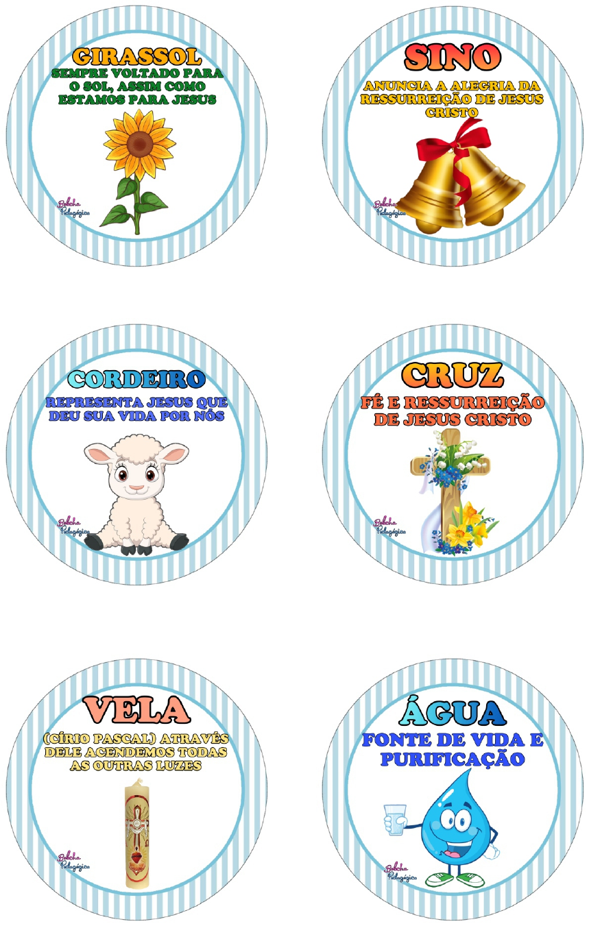 Dica: Imprimir em papel mais forte e plastificar. Fazer um furo em cada cartão e colocar em um chaveiro ou fita. Para mais recursos, acesse: www.bolachapedagogica.com Instagram: @bolacha_pedagogica Chaveiro os Símbolos da Páscoa Dica: Imprimir em papel mais forte e plastificar. Fazer um furo em cada cartão e colocar em um chaveiro ou fita. Para mais recursos, acesse: www.bolachapedagogica.com Instagram: @bolacha_pedagogica Chaveiro os Símbolos da Páscoa Direitos Autorais Este material foi produzido pela Pâmela Fumagalli, autora e criadora do portal bolachapedagogica.com. Este material está sendo disponibilizado gratuitamente no site, não sendo autorizada a venda ou compartilhamento do arquivo seja de todo o conteúdo ou parte dele. Caso tenha a intenção de indicar este material para qualquer pessoa, ao invés de compartilhar o arquivo, deve ser compartilhado o link do site www.bolachapedagogica.com para que o interessado obtenha o material a partir do site. O compartilhamento deste material ou parte dele por pessoa física, jurídica, sites, blogs, canais, páginas/perfis “sociais” sem a autorização previa da autora, incorre em violação de direito autoral conforme Código Penal Art 184, e haverá a denúncia em órgão de proteção global como DMCA o que poderá acarretar em penalizações judiciais, bloqueio de sua conta em perfil social e bloqueio de conta do Google Adsense. Material Disponibilizado Gratuitamente Recursos, ferramentas e ideias pedagógicas! O portal preferido dos professores da educação infantil! @bolacha_pedagogica Apoie o projeto compartilhando o endereço: www.bolachapedagogica.com Venda Proibida Se este material te ajudou de alguma forma, compartilhe as artes nas redes sociais e marque o perfil @bolacha_pedagogica Página 1 Página 2 Página 3