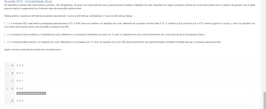 Os depósitos judiciais são instrumentos não na qual o juiz pode solicitar que a parte devedora realize depósito do valor disputado em algum processo judicial em uma conta judicial com objetivo de garantir que a parte passiva realize o pagamento da dívida em caso de execução. Nesse sentido, analise as afirmativas expostas assinalando V para as afirmativas verdadeiras e F para as afirmativas falsas. ( ) A empresa ABC está sendo processada pela empresa XYZ. A ABC teve que realizar um depósito em juízo referente ao processo movido pela XYZ. À medida que é possível que a XYZ venha a ganhar a causa, o valor do depósito em juízo será reconhecido como uma provisão no passivo da ABC. ( ) A empresa Gama realizou um depósito em juízo referente a um processo trabalhista. O valor do depósito em juízo será reconhecido em uma conta do ativo da empresa. ( ) A empresa Beta realizou um depósito em juízo referente a um processo civil. O valor do depósito em juízo não será reconhecido nas demonstrações da Beta até que o processo seja encerrado. A - V, V, F B - V, V, V C - F, F, F D - F, V, F E - V, F, F