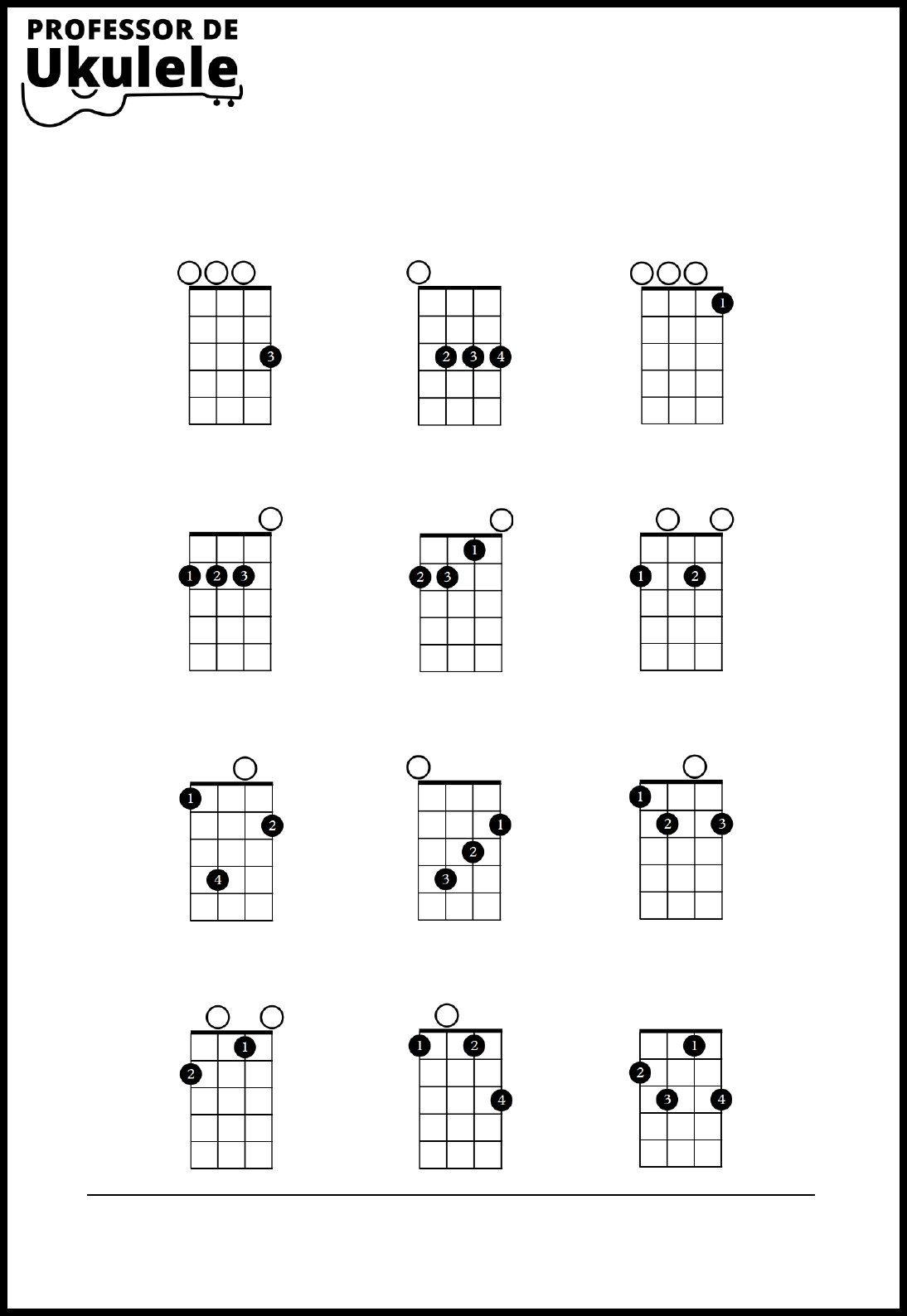 1 www.professordeukulele.com.br – www.joaodaniel.com.br contato@professordeukulele.com.br © 2020 Professor de Ukulele – João Daniel C. Costa C Dó maior Cm Dó menor C7 Dó maior com sétima D Ré maior Dm Ré menor D7 Ré maior com sétima E Mi maior Em Mi menor E7 Mi maior com sétima F Fá maior Fm Fá menor F7 Fá maior com sétima Acordes Básicos no Ukulele http://www.professordeukulele.com.br/ http://www.joaodaniel.com.br/ mailto:contato@professordeukulele.com.br 2 www.professordeukulele.com.br – www.joaodaniel.com.br contato@professordeukulele.com.br © 2020 Professor de Ukulele – João Daniel C. Costa Observações: • dependendo da situação, pode-se usar outros dedos para formar um mesmo acorde; • a alça que liga os círculos com o número 1 significa uma pestana, isto é, várias cordas são pressionadas, simultaneamente, com o dedo 1. G Sol maior Gm Sol menor G7 Sol maior com sétima A Lá maior Am Lá menor A7 Lá maior com sétima B Si maior Bm Si menor B7 Si maior com sétima http://www.professordeukulele.com.br/ http://www.joaodaniel.com.br/ mailto:contato@professordeukulele.com.br