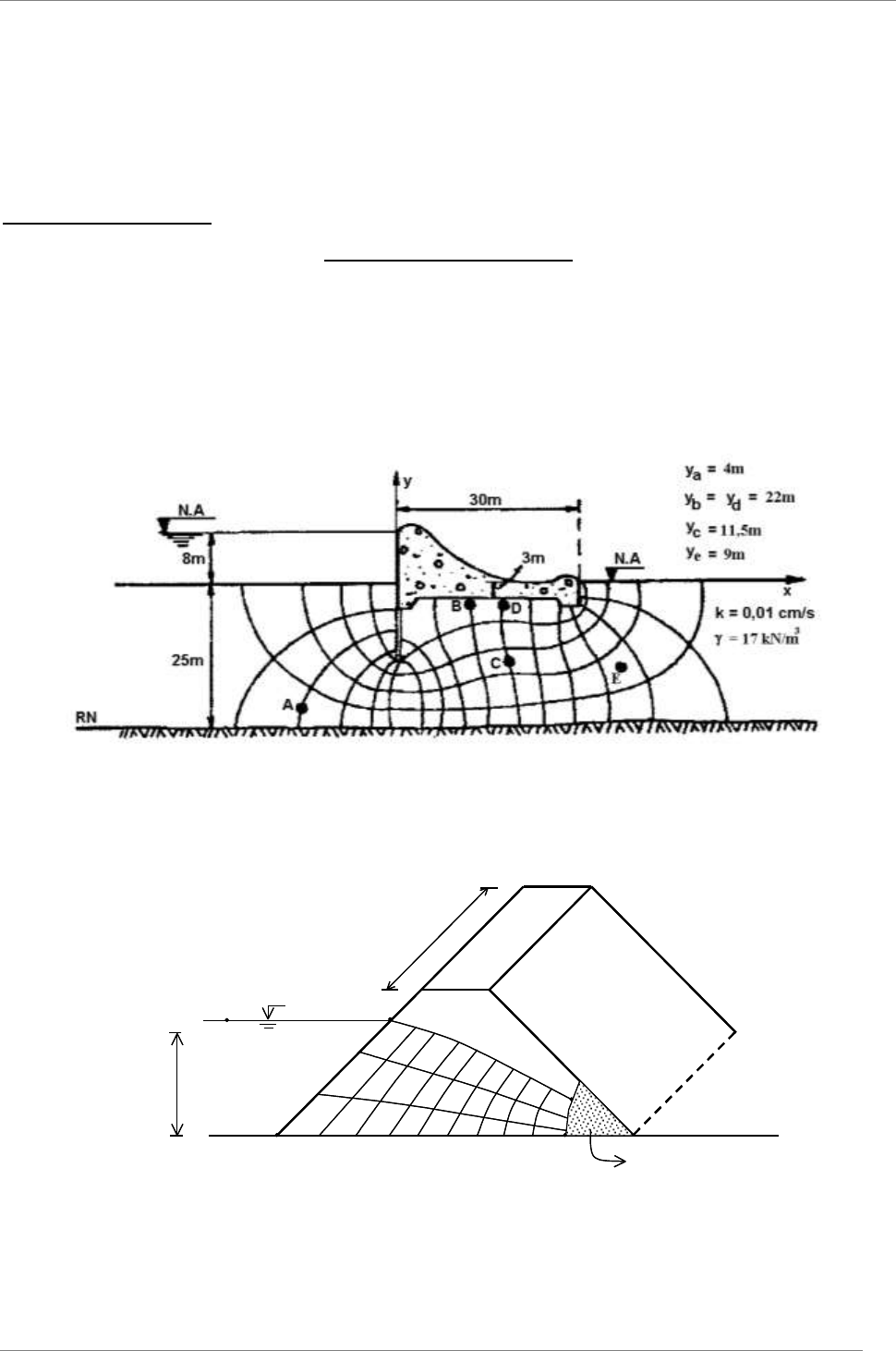 Lista de Exercícios Mecânica dos Solos II Prof. Erinaldo H. Cavalcante 1 UNIVERSIDADE FEDERAL DE SERGIPE CENTRO DE CIÊNCIAS EXATAS E TECNOLOGIA DEPARTAMENTO DE ENGENHARIA CIVIL MECÂNICA DOS SOLOS II PROF. Erinaldo Hilário Cavalcante 4ª Lista de Exercícios LISTA DE EXERCÍCIOS Percolação em Solos – Fluxo Bidimensional 1) Calcular o volume que escoa em 24 horas através da fundação da barragem de concreto abaixo. Calcule as cargas totais e a pressão neutra nos pontos indicados. 2) Calcular a vazão que escoa através da barragem de terra da figura abaixo. L = 200 m NA 12 m K= 1,5x10-4cm/s m on ta nt e ju sa nt e 3 21 4 5 Filtro de pé L = 200 m NA 12 m K= 1,5x10-4cm/s m on ta nt e ju sa nt e 3 21 4 5 Filtro de pé Lista de Exercícios Mecânica dos Solos II Prof. Erinaldo H. Cavalcante 2 3) Calcular as piezométricas e respectivas poropressões atuando nos pontos em A, B, C, D, E e F. (w = 1,0 tf/m 3 ) 6,0 m RN E 0,5 m C D B Cotas: yB = 4,0 m yC = 5,5 m yD = 2,0 m NA NA A Linha Freática F 6,0 m RN E 0,5 m C D B Cotas: yB = 4,0 m yC = 5,5 m yD = 2,0 m NA NA A Linha Freática F 4) Calcular keq e a vazão unitária (Q). Dados: kx = 6,0 x10 -4 cm/s e ky = 1,0 x 10 -4 cm/s. Seção real: NA 27 m kx ky 170 m 6 m 60 m NANA 27 m kx ky 170 m 6 m 60 m Seção transformada: NA 27 m ? m keq NANA 27 m ? m keq 5) Calcular a vazão total que percola por metro de seção da barragem de terra abaixo e o gradiente hidráulico no elemento I. Calcular também as cargas piezométricas nos pontos B, C e D. Um piezômetro instalado no ponto E terá no seu interior o NA registrado até que altura? Considere o RN como sendo a base da barragem. 0 E Lista de Exercícios Mecânica dos Solos II Prof. Erinaldo H. Cavalcante 3 6) Com dados da Figura 1, e considerando que o meio é isotrópico e homogêneo, pede-se: a) O esboço da melhor rede de fluxo para a situação apresentada. b) A vazão que percola através do maciço de solo e a descarga total em 1 ano. A seção tem 400 m de extensão. c) As tensões geostáticas total e efetiva nos pontos A, B e C; d) A altura que a água se eleva dentro de um piezômetro instalado no ponto C. Dados Figura 1 Dados do solo onde ocorre a percolação: 7) Refaça a questão anterior, considerando que o maciço da fundação é anisotrópico, sendo que as permeabilidades são as seguintes: 8) Determine a vazão de água que percola pela fundação da cortina de estaca mostrada a seguir. 3 6 /3,18 /1001,2k mkN scmx sat scmxscmx /101/100,2 56 hv ke k NA NT NT limpermeáve k smx /100,2 6 Lista de Exercícios Mecânica dos Solos II Prof. Erinaldo H. Cavalcante 4 9) Trace a rede de fluxo para a situação apresentada na figura a seguir e determine as subpressões hidrostáticas atuando nos pontos A e B. Dado: k = 5 x 10 -5 m/s. 10) Para cada uma das três seções seguintes, calcule: i) as cargas total, piezométrica e a pressão neutra nos pontos indicados; ii) A vazão que ocorre pelo maciço por unidade de comprimento; iii) o gradiente hidráulico no elemento com as dimensões indicadas. NA NT NT B A Lista de Exercícios Mecânica dos Solos II Prof. Erinaldo H. Cavalcante 5 yA= 2,5 m yB = 4,8 m yC = 2,4 m yE = 9,5 m yB = 12,3 m yC = 7,4 m yD = 2,9 m yB = 12,0 m yC = 6,4 m yE = 6,3 m yF = 6,5 m Cotas altimétricas Cotas altimétricas Cotas altimétricas
