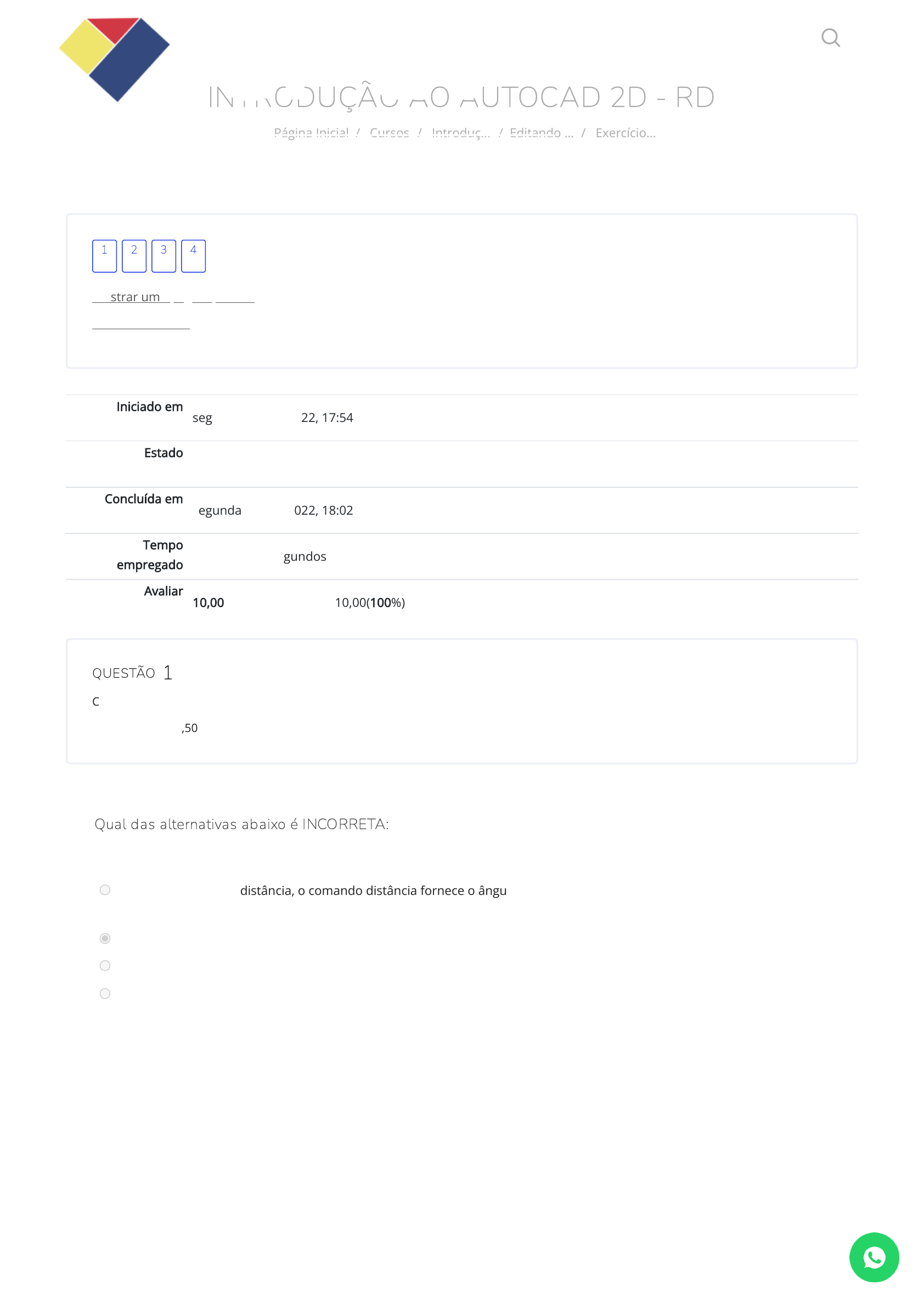 INTRODUÇÃO AO AUTOCAD 2D - RD Página Inicial / Cursos / Introduç… / Editando … / Exercício… Iniciado em segunda, 27 Jun 2022, 17:54 Estado Finalizada Concluída em segunda, 27 Jun 2022, 18:02 Tempo empregado 7 minutos 56 segundos Avaliar 10,00 de um máximo de 10,00(100%) QUESTÃO Correto Atingiu 2,50 de 2,50 Mostrar uma página por vez Terminar revisão 1 2 3 4 1 Qual das alternativas abaixo é INCORRETA: Escolha uma opção: a. Juntamente com a distância, o comando distância fornece o ângulo que a linha que une os dois pontos forma com a referência positiva do AutoCAD. b. O atalho para ativar o comando através do teclado é “d”. c. O comando distância no AutoCAD informa a distância entre dois pontos escolhidos pelo usuário. d. O atalho para ativar o comando através do teclado é “di”. A resposta correta é: O atalho para ativar o comando através do teclado é “d”. https://cpetead.com.br/ https://cpetead.com.br/course/index.php https://cpetead.com.br/course/view.php?id=1057 https://cpetead.com.br/mod/quiz/view.php?id=18698 https://cpetead.com.br/mod/quiz/review.php?attempt=2463737&cmid=18698&showall=0 https://cpetead.com.br/mod/quiz/view.php?id=18698 https://cpetead.com.br/ https://api.whatsapp.com/send?phone=5511960568891 QUESTÃO Correto Atingiu 2,50 de 2,50 QUESTÃO Correto Atingiu 2,50 de 2,50 2 O comando “array”, em sua forma retangular permite: Escolha uma opção: a. Elaboração de cópias em padrão de linhas e colunas; é possível escolher a quantidade de linhas e colunas e a distância entre elas. O atalho para ativar o comando pelo teclado é “arr”. b. Elaboração de cópias em padrão de linhas e colunas; é possível escolher a quantidade de linhas e colunas e a distância entre elas. O atalho para ativar o comando pelo teclado é “ar”. c. Elaboração de cópias em padrão circular. É possível escolher um ângulo de giro e uma quantidade de objetos d. Elaboração de cópias em padrão de linhas e colunas; é possível escolher a quantidade de linhas e colunas, mas não a distância entre elas. A resposta correta é: Elaboração de cópias em padrão de linhas e colunas; é possível escolher a quantidade de linhas e colunas e a distância entre elas. O atalho para ativar o comando pelo teclado é “ar”. 3 Com a ferramenta polígono, podemos: Escolha uma opção: a. Desenhar qualquer polígono formado por linhas e arcos. Além disso, o polígono construído é formado por uma "polyline". b. Desenhar polígonos regulares, ou seja, com lados iguais. Além disso, o polígono construído é formado por um conjunto de linhas simples. c. Desenhar polígonos regulares, ou seja, com lados iguais. Além disso, o polígono construído é formado por uma "polyline". d. Nenhuma das alternativas. A resposta correta é: Desenhar polígonos regulares, ou seja, com lados iguais. Além disso, o polígono construído é formado por uma "polyline". https://api.whatsapp.com/send?phone=5511960568891 QUESTÃO Correto Atingiu 2,50 de 2,50 4 O comando “array” em sua forma polar permite: Escolha uma opção: a. Elaboração de cópias em padrão de linhas e colunas; é possível escolher a quantidade de linhas e colunas, mas não a distância entre elas b. Elaboração de cópias em padrão circular. É possível escolher um ângulo de giro total, ângulo de giro entre objetos de forma independente. c. Elaboração de cópias em padrão circular. É possível escolher um ângulo de giro total, ângulo de giro entre objetos que são dependentes entre si. d. Elaboração de cópias em padrão circular. É possível escolher um ângulo de giro total e ângulo de giro entre objetos, mas não é possível escolher a quantidade de objetos. A resposta correta é: Elaboração de cópias em padrão circular. É possível escolher um ângulo de giro total, ângulo de giro entre objetos que são dependentes entre si. ◄ Alterando as Dimensões das Entidades Seguir para... Movendo, Copiando e Espelhando Entidades - ► Quem somos Cursos Certi�cação Unidades Contato Copyright © 2021 CPET - Centro de Pro�ssionalização e Educação Técnica https://cpetead.com.br/mod/url/view.php?id=41201&forceview=1 https://cpetead.com.br/mod/render/view.php?id=41203&forceview=1 https://www.cpet.com.br/quem-somos-cpet-cursos-tecnicos-a-distancia-ead/ https://www.cpet.com.br/course-cat/cursos/cursos-online/ https://www.cpet.com.br/certificacao-cpet/ https://www.cpet.com.br/unidades-cpet/ https://www.cpet.com.br/contato/ https://www.facebook.com/CPET-Centro-de-Profissionaliza%C3%A7%C3%A3o-e-Educa%C3%A7%C3%A3o-T%C3%A9cnica-1039179026236475/ https://twitter.com/soucpet/ https://www.instagram.com/soucpet/ https://api.whatsapp.com/send?phone=5511960568891