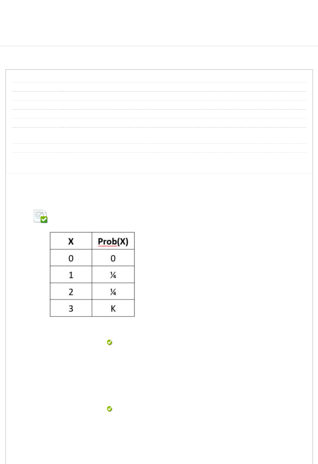 16/03/2023, 21:35 Revisar envio do teste: QUESTIONÁRIO UNIDADE IV – ... https://ava.ead.unip.br/webapps/assessment/review/review.jsp?attempt_id=_91508697_1&course_id=_281764_1&content_id=_3342530_1&ret… 1/14 Revisar envio do teste: QUESTIONÁRIO UNIDADE IVESTATÍSTICA 3066-60_54406_R_E1_20231 CONTEÚDO Usuário raphael.carvalho17 @aluno.unip.br Curso ESTATÍSTICA Teste QUESTIONÁRIO UNIDADE IV Iniciado 16/03/23 21:34 Enviado 16/03/23 21:35 Status Completada Resultado da tentativa 2,5 em 2,5 pontos Tempo decorrido 1 minuto Resultados exibidos Todas as respostas, Respostas enviadas, Respostas corretas, Comentários, Perguntas respondidas incorretamente Pergunta 1 Resposta Selecionada: e. Respostas: a. b. c. d. e. Feedback da resposta: (FGV-2022) Suponha que X, uma variável aleatória discreta, assuma a seguinte distribuição de probabilidade: O valor de K e o valor esperado de X são, respectivamente, 1/2 e 9/4. 0 e 3/4. 1/4 e 3/2. 1/2 e 3/4. 1/2 e 3/2. 1/2 e 9/4. Resposta: E Comentário: Quando a probabilidade de todos os possíveis resultados de uma variável aleatória discreta é expressa como uma taxa percentual, o resultado do somatório das probabilidades deve ser igual a 100%. Quando é expresso na forma unitária, o somatório das probabilidades deve ser igual a 1. Portanto, somando as probabilidades expostas na 2ª coluna da tabela do enunciado, temos a equação a UNIP EAD BIBLIOTECAS MURAL DO ALUNO TUTORIAISCONTEÚDOS ACADÊMICOS 0,25 em 0,25 pontos http://company.blackboard.com/ https://ava.ead.unip.br/webapps/blackboard/execute/courseMain?course_id=_281764_1 https://ava.ead.unip.br/webapps/blackboard/content/listContent.jsp?course_id=_281764_1&content_id=_3341715_1&mode=reset https://ava.ead.unip.br/webapps/portal/execute/tabs/tabAction?tab_tab_group_id=_10_1 https://ava.ead.unip.br/webapps/portal/execute/tabs/tabAction?tab_tab_group_id=_27_1 https://ava.ead.unip.br/webapps/portal/execute/tabs/tabAction?tab_tab_group_id=_47_1 https://ava.ead.unip.br/webapps/portal/execute/tabs/tabAction?tab_tab_group_id=_29_1 https://ava.ead.unip.br/webapps/portal/execute/tabs/tabAction?tab_tab_group_id=_25_1 https://ava.ead.unip.br/webapps/login/?action=logout 16/03/2023, 21:35 Revisar envio do teste: QUESTIONÁRIO UNIDADE IV – ... https://ava.ead.unip.br/webapps/assessment/review/review.jsp?attempt_id=_91508697_1&course_id=_281764_1&content_id=_3342530_1&ret… 2/14 seguir: Isolando o K, temos: Logo, sabemos que K = ½. O valor esperado E(X), de uma variável discreta aleatória X, é calculado pela média ponderada dos valores xi assumidos pela variável, em que os pesos são as probabilidades unitárias p(xi): No contexto do enunciado, temos o cálculo descrito a seguir: Pergunta 2 Resposta Selecionada: a. Respostas: a. b. c. d. e. Feedback da resposta: (FGV-2022) Planeja-se selecionar quatro pessoas, com reposição, de uma pequena população composta por vinte pessoas, das quais dez foram acometidas por certa doença. Se X é a variável aleatória que contará o número de pessoas, entre as quatro, que foram acometidas pela referida doença, então a probabilidade de X ser igual a 2 é igual a: 0,375. 0,375. 0,425. 0,475. 0,5. 0,525. Resposta: A Comentário: A questão aborda uma situação tratada como uma distribuição binomial. A distribuição binomial é uma distribuição discreta de probabilidades que se aplica sempre que o processo de amostragem tem as seguintes características: ● Em cada tentativa, há apenas dois resultados possíveis, chamados de sucesso e fracasso, que são mutuamente exclusivos. No contexto, há apenas a possibilidade de a pessoa ser acometida pela doença ou não ser acometida, e a ocorrência de uma exclui a outra. ● Os eventos de uma série de tentativas são independentes. No contexto, a 0,25 em 0,25 pontos 16/03/2023, 21:35 Revisar envio do teste: QUESTIONÁRIO UNIDADE IV – ... https://ava.ead.unip.br/webapps/assessment/review/review.jsp?attempt_id=_91508697_1&course_id=_281764_1&content_id=_3342530_1&ret… 3/14 amostra é selecionada com reposição, o que torna os eventos independentes entre si. ● O processo é estacionário, ou seja, a probabilidade de sucesso não varia entre uma tentativa e outra. Chamando de p a probabilidade de sucesso de uma pessoa ser acometida pela doença, a probabilidade de fracasso q nessa mesma tentativa é dada por: Pelo contexto, p (probabilidade de a pessoa ser acometida pela doença) é dado por: Nesse caso, temos q (probabilidade de uma pessoa não ser acometida pela doença) dado como: Ou seja, temos dois resultados possíveis e mutuamente exclusivos. O número 1, na expressão acima, indica a probabilidade de ocorrência de 100%. A probabilidade P(X) de termos X sucessos em N tentativas é dada pela seguinte expressão: Escrevendo explicitamente o binômio CN,X, temos: No contexto, calcularemos a probabilidade de termos X = 2 pessoas acometidas pela doença em N = 4 tentativas (quantidade de pessoas da amostra). Dessa forma, a probabilidade de haver 2 pessoas entre as 4 selecionadas que foram acometidas pela doença é de 0,375, ou 37,5%. Pergunta 3 (IADES/2018) A variável normal padronizada Z é dada por Z = (X - µ)/σ, em que X é uma variável que tem distribuição normal de média µ e variância σ², conforme a �gura apresentada. 0,25 em 0,25 pontos 16/03/2023, 21:35 Revisar envio do teste: QUESTIONÁRIO UNIDADE IV – ... https://ava.ead.unip.br/webapps/assessment/review/review.jsp?attempt_id=_91508697_1&course_id=_281764_1&content_id=_3342530_1&ret… 4/14 Resposta Selecionada: d. Respostas: a. b. c. d. e. Feedback da resposta: Considerando uma variável X que tem distribuição normal de média µ = 15,6 e variância σ² = 0,25, assinale a alternativa que indica a probabilidade p(15 < X < 16,2). Dado: Tabela – Áreas de uma distribuição normal padrão em relação à média. 0,7698. 0,1151. 0,2302. 0,3849. 0,7698. 0,8849. Resposta: D Comentário: Temos, no contexto da quest