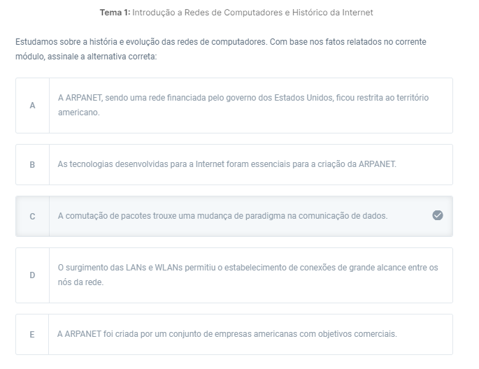 Estudamos sobre a história e evolução das redes de computadores. Com base nos fatos relatados no corrente módulo, assinale a alternativa correta: A - sendo uma rede financiada pelo governo dos Estados Unidos, ficou restrita ao território B - As tecnologias desenvolvidas para a Internet foram essenciais para a criação da C - A comutação de pacotes trouxe uma mudança de paradigma na comunicação de D - o surgimento das LANs e WLANs permitiu estabelecimento de conexões de grande alcance entre os E - A ARPANET foi criada por um conjunto de empresas americanas com objetivos