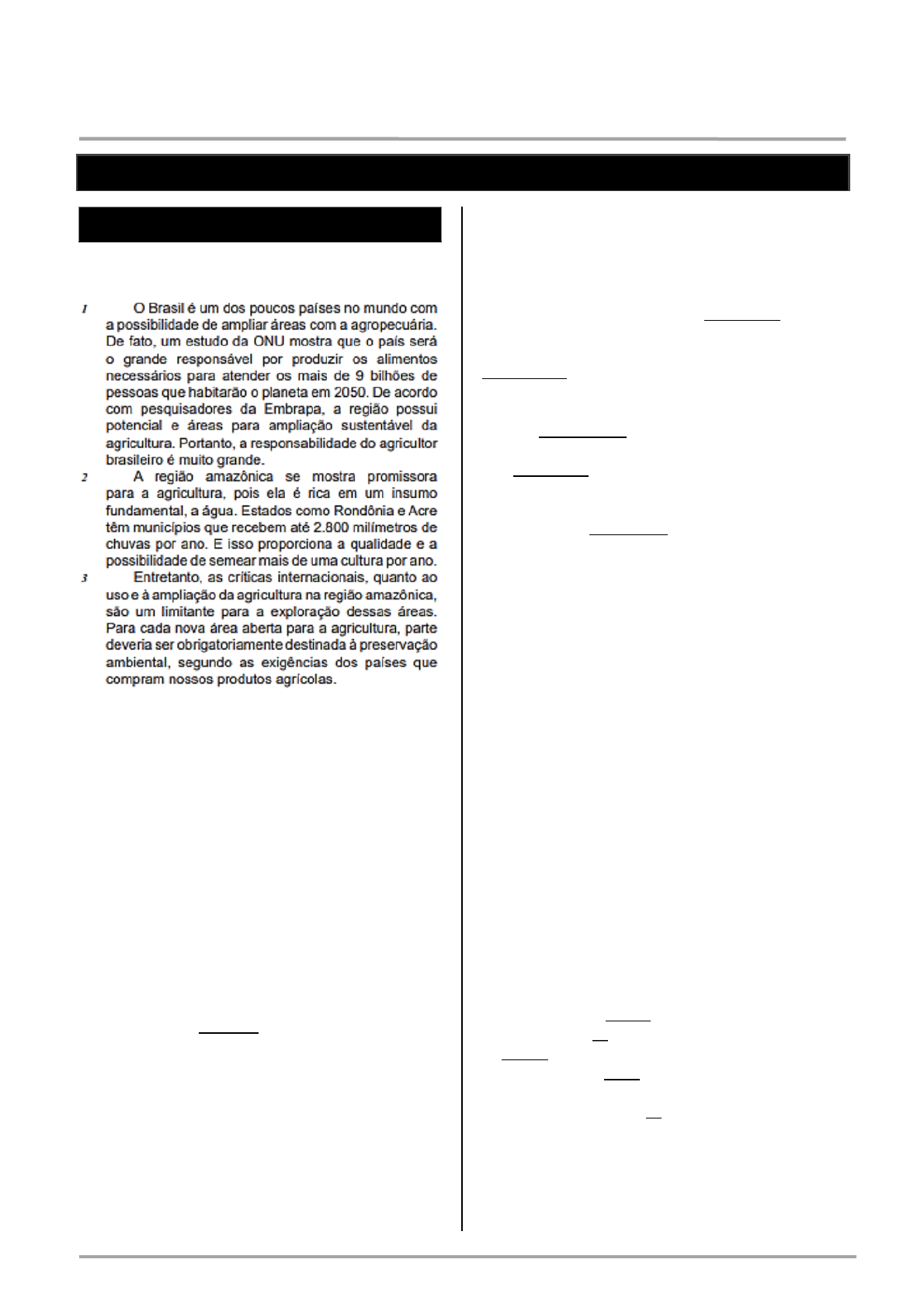 Impresso por Laurinha Estefany, E-mail laurinhaestefany50@gmail.com para uso pessoal e privado. Este material pode ser protegido por direitos autorais e não pode ser reproduzido ou repassado para terceiros. 08/03/2023, 19:28:38 Simulado Amostra Banco do Brasil Escriturário: Agente Comercial Aplicação: Jan/ SimuladosBR – – – 23 Adquira o Pacote de Simulados em Nosso Site - ww.SimuladosBR.net PROVA OBJETIVA Língua Portuguesa Texto I (Questões 01 e ) 02 POPOV, Daniel. Canal Rural. 30 nov. Adaptado 2021 – 01. De acordo com o texto, para atender às exigências internacionais, o país deve A conscientizar os agricultores da necessidade de ampliar seus negócios. B diversificar os tipos de culturas que exigem a utilização de muita água. C garantir a destinação de terras a atividades de preservação ambiental. D liberar as áreas de cultivo de produtos agrícolas na região amazônica. E restringir as terras amazônicas ao desenvolvimento da pecuária. 02. No trecho “Portanto, a responsabilidade do agricultor brasileiro é muito grande.” (parágrafo 1), a palavra destacada pode ser substituída, sem prejuízo do sentido, por A com o fim de B dessa forma C apesar de D porque E quando 03. De acordo com a norma-padrão da língua portuguesa, a concordância nominal está correta na palavra destacada em: A A agricultura sustentável e os cuidados com o meio ambiente são extremamente proveitosas ra a pa preservação do planeta. B O desmatamento generalizado e a monocultura são inadequadas do ponto de vista ambiental. C O uso predatório do solo pode acarretar consequências como a desertificação e a arenização, que são considerados prejudiciais à natureza. D A região amazônica e o pantanal mato-grossense são conhecidas internacionalmente como patrimônios ambientais. E Os cuidados com o solo e as pesquisas em técnicas de plantio são necessários para que a produção de alimentos seja sustentável. 04. De acordo com a norma-padrão da língua portuguesa, o emprego adequado da vírgula está plenamente atendido em: A A criação de animais para a produção de alimentos, é de grande importância para o sustento de milhares de famílias. B A floresta Amazônica, apesar de parecer homogênea, possui muitas diferenças na sua vegetação. C A melhor maneira de proteger as povoações situadas nas margens dos rios, é procurar soluções que impeçam o comércio ilegal. D O estado do Amazonas apresenta, a maior população indígena do Brasil com aproximadamente trinta mil habitantes. E O número de estudiosos preocupados com o futuro do planeta, aumentou devido ao aquecimento global. 05. O verbo destacado está flexionado INCORRETAMENTE em: A Ele, finalmente, reou a fé perdida. ve B Assim que os , dê-lhes um forte abraço. vir C Propus, na verdade, maior reflexão. D Ninguém a deteu, embora sua escolha fosse arriscada. E Durante muito tempo, cri em ideias não plausíveis. 06. A palavra acentuada pela mesma regra que se verifica na palavra símbolos é A já Impresso por Laurinha Estefany, E-mail laurinhaestefany50@gmail.com para uso pessoal e privado. Este material pode ser protegido por direitos autorais e não pode ser reproduzido ou repassado para terceiros. 08/03/2023, 19:28:38 Simulado Amostra Banco do Brasil Escriturário: Agente Comercial Aplicação: Jan/ SimuladosBR – – – 23 Adquira o Pacote de Simulados em Nosso Site - ww.SimuladosBR.net B está C respeitável D esferográfica E desenvolverá 07. A colocação do pronome oblíquo átono está em acordo com a norma-padrão da língua portuguesa em: A Poder- se-á levar a educação financeira para as salas de aula, o que será muito proveitoso. B Nos perguntam sempre sobre como gerir melhor a vida financeira. C As famílias nunca preocuparam-se com a educação financeira como parte da formação de seus filhos. D Aqueles que relacionam-se bem com o dinheiro têm uma vida mais organizada. E Compreenderia-se melhor o desempenho da empresa, se o mercado fosse estudado. 08. Assinale a opção em que a regência do verbo destacado está correta, segundo o registro culto e formal da língua. A Informei-a que o período turbulento havia terminado. B Assistia a derrota daqueles que não acreditaram na oportunidade. C Diante de tamanha pressão, chegou no seu limite. D Neste momento, diante do ocorrido, todos reivindicam por tranquilidade de vida. E A constatação de que aquilo era verdadeiro custou- lhe dias difíceis. 09. O acento grave indicativo de crase é necessário e está empregado de acordo com a norma-padrão em: A É bom manter-nos à distância de dez passos. B O sol estava à pino e precisamos nos proteger do calor. C A volta à Portugal, seu país natal, fez meu pai muito feliz. D Com muito esforço, os idosos acompanham às novas tecnologias. E Sempre reconhecemos àqueles que são nossos verdadeiros amigos. 10. A frase em que a concordância verbal atende ao que prevê a norma-padrão da língua portuguesa é: A Restava cerca de quinze candidatos para a entrevista. B Não sou eu que elabora as perguntas para as entrevistas. C No futuro, a maioria das tarefas poderão ser realizadas por algoritmos. D Nenhum de nós estamos preparados para a responsabilidade daquele cargo. E Mais de um indicador são usados para a seleção dos profissionais durante as entrevistas. Língua Inglesa Texto II (Questões 11 a 15) ThisMatter.com (2015) Adapted – Impresso por Laurinha Estefany, E-mail laurinhaestefany50@gmail.com para uso pessoal e privado. Este material pode ser protegido por direitos autorais e não pode ser reproduzido ou repassado para terceiros. 08/03/2023, 19:28:38 Simulado Amostra Banco do Brasil Escriturário: Agente Comercial Aplicação: Jan/ SimuladosBR – – – 23 Adquira o Pacote de Simulados em Nosso Site - ww.SimuladosBR.net 11. According to the text, a definition for the expression “the efficient allocation of economic resources” (lines 6-7) is: A provision of the most 