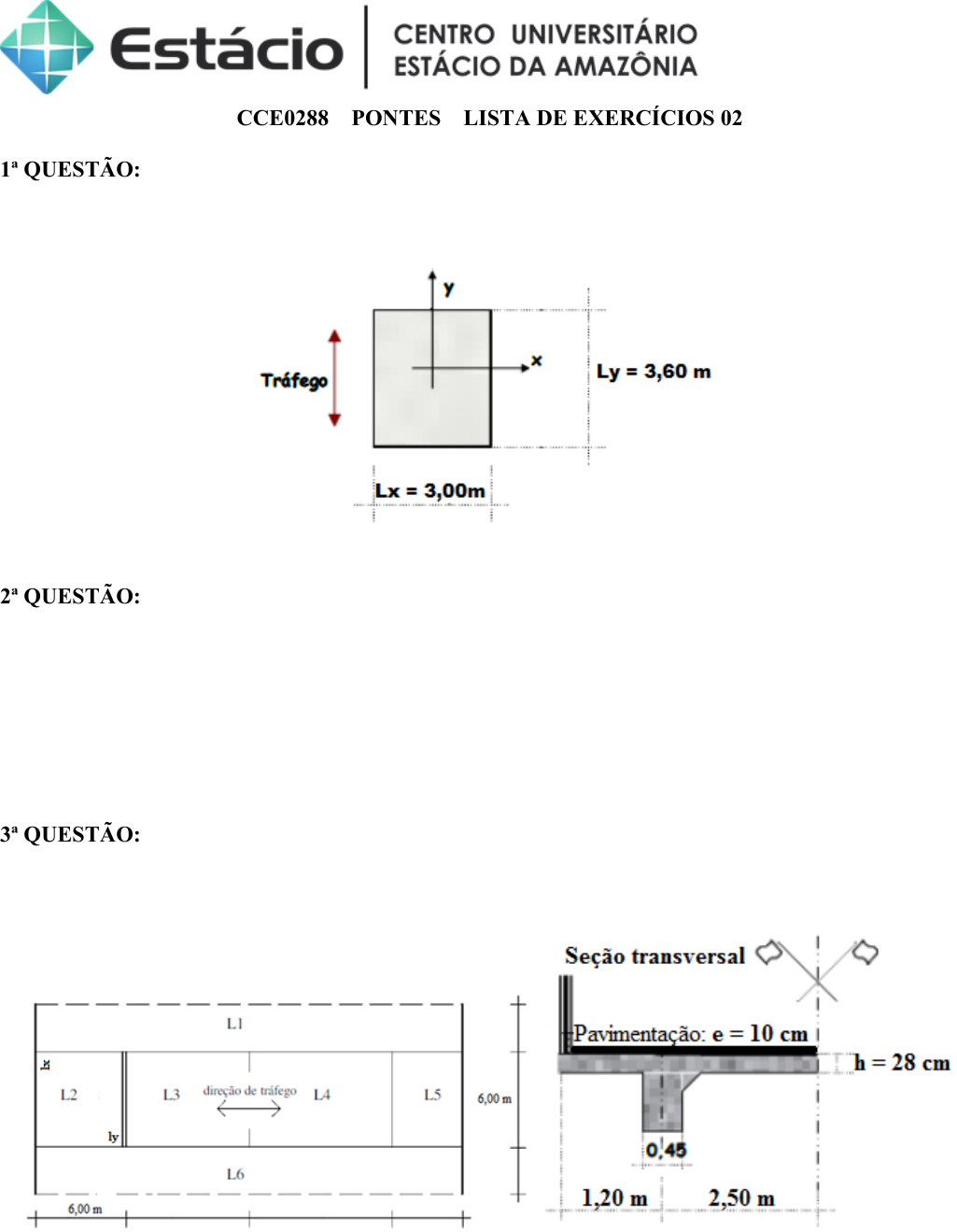 CCE0288 – PONTES – LISTA DE EXERCÍCIOS 02 Página 1 de 1 1ª QUESTÃO: Calcule os momentos fletores devido a carga móvel de uma laje de ponte rodoviária, classe 30, cujo esquema está abaixo indicado. Considere: altura da laje igual a 220 mm; altura do pavimento igual a 50 mm; largura da roda = 40 cm. RESPOSTAS:𝐌𝐱𝐦,𝐪 = 𝟏𝟕, 𝟏𝟖 𝐤𝐍. 𝐦; 𝐌𝐲𝐦,𝐪 = 𝟏𝟑, 𝟐𝟓 𝐤𝐍. 𝐦. 2ª QUESTÃO: Considerando os dados de uma ponte rodoviária bi-apoiada com dois balanços, classe 45, verifique à fadiga das armaduras de flexão da laje. Dados: h = 0,25 m; d’ = 0,03 cm; Ase = 10,41 cm²/m → ∅ 12.5 c/12; Momento fletor devido a carga permanente = 16,37 kN.m; Momento fletor máximo devido a carga variável = 49,44 kN.m; Momento fletor mínimo devido a carga variável = 0,00 kN.m; αe = 10; ∆fsd,ad,mín = 105 MPa. RESPOSTA: ∆𝛔𝐬 = 𝟏𝟖, 𝟗𝟒 𝐤𝐍/𝐜𝐦² > ∆𝐟𝐬𝐝,𝐚𝐝,𝐦í𝐧 = 𝟏𝟎, 𝟓 𝐤𝐍/𝐜𝐦² → 𝐀𝐬 = 𝟏𝟖, 𝟕𝟖 𝐜𝐦²/𝐦 3ª QUESTÃO: Seja a ponte rodoviária, classe 45, cujo esquema com o respectivo sentido do tráfego e seção transversal abaixo indicadas, determine os momentos fletores (Mxm, Mym e Mye) devido às cargas permanentes e móveis. Dados adicionais: Recapeamento = 2,00 kN/m²; γpavimentação = 24 kN/m³. RESPOSTA: Carga permanente: 𝐌𝐱𝐦,𝐠 = 𝟏𝟐, 𝟑𝟏 𝐤𝐍. 𝐦; 𝐌𝐲𝐦,𝐠 = 𝟏𝟒, 𝟕𝟕 𝐤𝐍. 𝐦; 𝐌𝐲𝐞,𝐠 = −𝟑𝟒, 𝟒𝟕 𝐤𝐍. 𝐦 Carga variável: 𝐌𝐱𝐦,𝐪 = 𝟑𝟑, 𝟑𝟓 𝐤𝐍. 𝐦; 𝐌𝐲𝐦,𝐪 = 𝟑𝟔, 𝟑𝟓 𝐤𝐍. 𝐦; 𝐌𝐲𝐞,𝐪 = −𝟗𝟕, 𝟏𝟎 𝐤𝐍. 𝐦 regin Realce regin Realce regin Realce regin Realce regin Retângulo Rüsch - Tabelas para o cálculo de lajes de pontes parte 4.pdf Digitalizar0089.jpg
