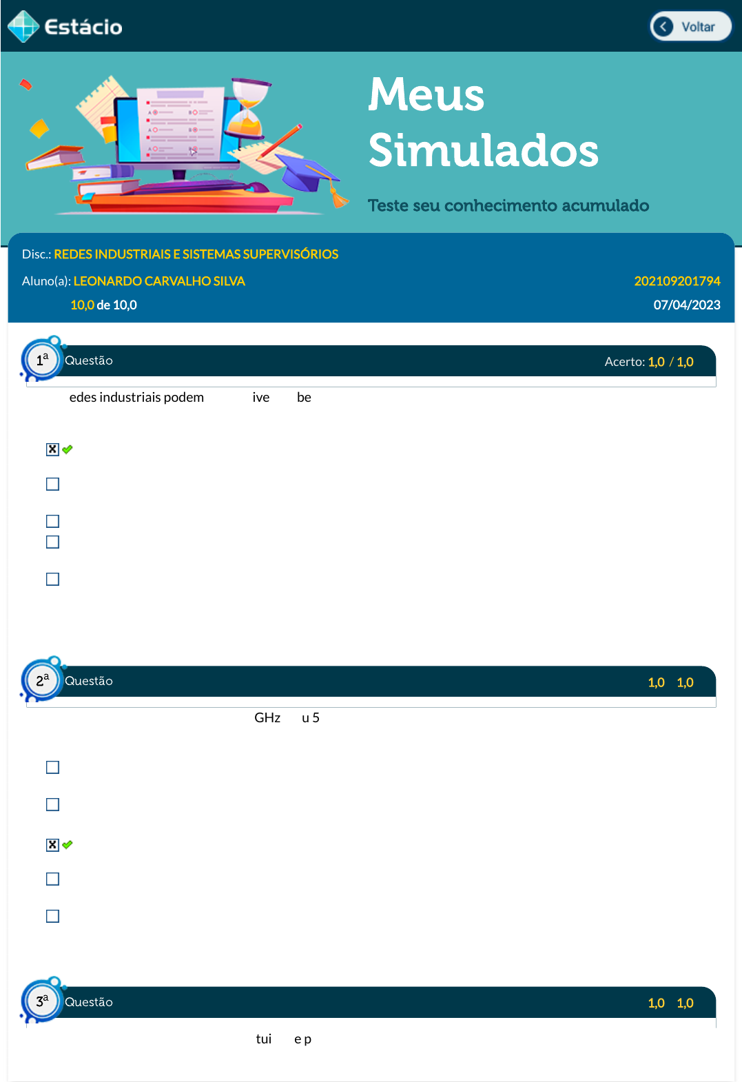 07/04/23, 11:08 Estácio: Alunos https://simulado.estacio.br/alunos/ 1/4 Meus Simulados Teste seu conhecimento acumulado Disc.: REDES INDUSTRIAIS E SISTEMAS SUPERVISÓRIOS Aluno(a): LEONARDO CARVALHO SILVA 202109201794 Acertos: 10,0 de 10,0 07/04/2023 Acerto: 1,0 / 1,0 As redes industriais podem trazer diversos benefícios para as empresas. Qual das alternativas NÃO corresponde a um destes benefícios? Redução da con�abilidade dos sistemas interligados Redução de custos de produção Aumento da segurança nas indústrias Melhor aproveitamento de matéria-prima Melhoria na qualidade dos produtos Respondido em 07/04/2023 11:03:25 Acerto: 1,0 / 1,0 O padrão Wi-Fi para frequência 2,4 GHz e/ou 5 GHz com capacidade de 65 à 600 Mbps é registrado no IEEE como o padrão: IEEE 802.11e IEEE 802.11h IEEE 802.11n IEEE 802.11i IEEE 802.11z Respondido em 07/04/2023 11:03:38 Acerto: 1,0 / 1,0 O padrão RS-485 foi criado com o intuito de prover uma forma robusta de comunicação multiponto. Em qual ano este padrão foi criado? Questão1 a Questão2 a Questão3 a https://simulado.estacio.br/alunos/inicio.asp javascript:voltar(); 07/04/23, 11:08 Estácio: Alunos https://simulado.estacio.br/alunos/ 2/4 1983 1990 2000 1993 1950 Respondido em 07/04/2023 11:03:52 Explicação: O padrão RS-485 foi criado em 1983 Acerto: 1,0 / 1,0 Em qual camada do modelo OSI são dadas permissões para que diferentes usuários de diferentes máquinas possam estabelecer conexões? Transporte Aplicação Rede Física Sessão Respondido em 07/04/2023 11:04:24 Explicação: Dentro do protocolo OSI a camada de Sessão é a responsável pelas permissões de acessos de usuários Acerto: 1,0 / 1,0 Qual a função da palavra de controle no protocolo MODBUS? Detectar erros de transmissão Veri�car a velocidade de transmissão Determinar a função a ser executada pelo escravo Aumentar a velocidade de transmissão Alterar o estado de uma saída digital Respondido em 07/04/2023 11:04:37 Explicação: A função da palavra de controle é detectar erros de transmissão Acerto: 1,0 / 1,0 Suponha que uma rede utiliza o protocolo PROFBUS. Analisando o meio físico de transmissão, qual dos casos abaixo o uso de �bra ótica seria mais indicado? Questão4 a Questão5 a Questão6 a 07/04/23, 11:08 Estácio: Alunos https://simulado.estacio.br/alunos/ 3/4 Regiões subaquáticas Áreas com pouca infraestrutura Regiões com alta temperatura Em campo aberto Áreas com alta interferência eletromagnética Respondido em 07/04/2023 11:04:58 Explicação: O uso da �bra ótica é indicado em áreas com alta interferência eletromagnética Acerto: 1,0 / 1,0 Qual o número máximo de nós em uma rede DeviceNet? 128 16 32 64 512 Respondido em 07/04/2023 11:06:27 Explicação: O número máximo de nós de uma rede DeviceNet é 64 Acerto: 1,0 / 1,0 Para que seja estabelecida comunicação e�caz são necessários alguns elementos. Marque a alternativa que possui um item que não faz parte deste grupo de elementos Emissor Receptor Ruído Meio de comunicação Mensagem Respondido em 07/04/2023 11:06:48 Explicação: O elemento que não se faz necessário em uma comunicação é o ruído Acerto: 1,0 / 1,0 Qual dos itens abaixo não corresponde a um dos principais componentes físicos de um sistema supervisório? Sensores Questão7 a Questão8 a Questão9 a 07/04/23, 11:08 Estácio: Alunos https://simulado.estacio.br/alunos/ 4/4 Estações remotas Rede de comunicação Atuadores Conectores Respondido em 07/04/2023 11:07:03 Explicação: Os conectores não fazem parte dos principais componentes físicos de um sistema supervisório Acerto: 1,0 / 1,0 Para se obter dados de tendência histórica, são utilizados valores de variáveis armazenados por períodos de até quanto tempo? Um ano Um dia Uma hora Dois anos Dez anos Respondido em 07/04/2023 11:07:12 Explicação: Os valores neste caso são armazenados por períodos de até um ano Questão10 a