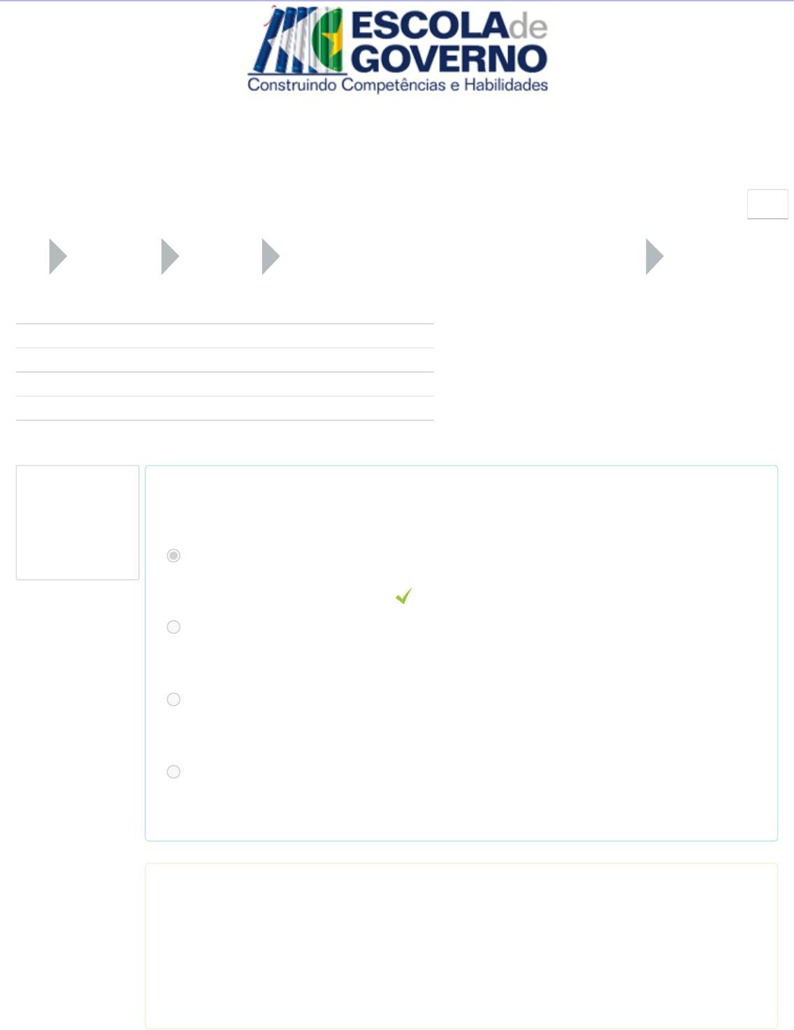 Buscar cursos Questão 1 Correto Atingiu 10,00 de 10,00 Formação e Reforma do Estado Brasileiro-T1/2023 Iniciado em terça, 28 Mar 2023, 19:12 Estado Finalizada Concluída em terça, 28 Mar 2023, 19:43 Tempo empregado 31 minutos 16 segundos Avaliar 100,00 de um máximo de 100,00 Assinale a alternativa correta: Escolha uma: a. A colonialidade se apresenta na atualidade brasileira por meio da roupa social, religião, estrutura familiar, estrutura patriarcal e língua impostos pela colonização europeia e presentes até hoje; b. A colonialidade não se apresenta na atualidade brasileira por meio da roupa social, religião, estrutura familiar, estrutura patriarcal e língua impostos pela colonização europeia e presentes até hoje; c. A colonialidade se apresenta na atualidade brasileira por meio da roupa social, religião, estrutura familiar, estrutura patriarcal e língua impostos pela colonização estadunidense e presentes até hoje; d. A colonialidade se apresenta na atualidade brasileira por meio da roupa social, religião, estrutura familiar, estrutura patriarcal e língua impostos pela colonização sul americana e presentes até hoje; Sua resposta está correta. Resposta: V105-FREB, vídeo O que é a colonialidade brasileira (Profa. Marina Grilli), trecho 00m30s a 1m22s A resposta correta é: A colonialidade se apresenta na atualidade brasileira por meio da roupa social, religião, estrutura familiar, estrutura patriarcal e língua impostos pela colonização europeia e presentes até hoje;. Mensagens ELIAS SPOTTE 2023 Cursos FREB0123 1 - A Formação do Estado Brasileiro (20/03 a 26/03/2023) Q102 FREB - Exercício de Fixação 1 http://eadeg.gestao.mt.gov.br/ http://eadeg.gestao.mt.gov.br/message/index.php http://eadeg.gestao.mt.gov.br/ http://eadeg.gestao.mt.gov.br/course/index.php?categoryid=3 http://eadeg.gestao.mt.gov.br/course/view.php?id=111 http://eadeg.gestao.mt.gov.br/course/view.php?id=111§ion=1 http://eadeg.gestao.mt.gov.br/mod/quiz/view.php?id=5595 Questão 2 Correto Atingiu 10,00 de 10,00 Assinale a alternativa incorreta, sobre o texto Estado e Burguesia no Brasil – Origens da autocracia burguesa (Antônio Carlos Mazzeo): Escolha uma: a. A burguesia latifundiária não criou o aparelho de Estado brasileiro segundo suas diretrizes ideológicas como forma de afastar o perigo de transformações sociais radicais; b. A inexistência de condições para uma ruptura concreta e revolucionária possibilitou a burguesia latifundiária que assumisse o processo de independência; c. Para burguesia latifundiária, D. Pedro I era o instrumento político adequado para propiciar a emancipação do Brasil sem participação popular que ofertasse risco de transformações sociais radicais. d. No momento da independência do Brasil, a luta política não conseguiu alterar as perspectivas econômico-sociais brasileira; Sua resposta está correta. Resposta: T104-FREB, parte superior da pg. 92, do texto Estado e Burguesia no Brasil – Origens da autocracia burguesa (Antônio Carlos Mazzeo). A resposta correta é: A burguesia latifundiária não criou o aparelho de Estado brasileiro segundo suas diretrizes ideológicas como forma de afastar o perigo de transformações sociais radicais;. Questão 3 Correto Atingiu 10,00 de 10,00 Assinale a incorreta sobre o texto Reforma gerencial do Estado, teoria política e ensino da administração pública (Bresser-Pereira): Escolha uma: a. No Brasil, a Reforma Gerencial de 1995 foi uma resposta aos desafios apresentados pela transformação do Estado brasileiro em um Estado social. b. A aproximação que ocorreu no Brasil entre administração de empresas e administração pública decorreu de uma noção equivocada do que é a administração pública. c. Para formar administradores públicos basta ensinar-lhes estratégias de gestão como a administração por resultados, métodos de controle, e uma visão geral da economia e da sociedade, de como evoluem e como são coordenadas d. Administração pública, aquilo que a distingue radicalmente das organizações privadas, é sua soberania, é seu poder de Estado, é a capacidade dos políticos de definir boas leis e políticas públicas, e a capacidade dos servidores de executá-las. Sua resposta está correta. Resposta: T101-FREB, quinto parágrafo da pg. 5, do texto Reforma gerencial do Estado, teoria política e ensino da administração pública (Bresser-Pereira) A resposta correta é: Para formar administradores públicos basta ensinar-lhes estratégias de gestão como a administração por resultados, métodos de controle, e uma visão geral da economia e da sociedade, de como evoluem e como são coordenadas . Questão 4 Correto Atingiu 10,00 de 10,00 Questão 5 Correto Atingiu 10,00 de 10,00 Assinale a alternativa incorreta: Escolha uma: a. O patrimonialismo é o principal traço da administração pública brasileira desde a descoberta do Brasil em 1500 até 1930 no período Vargas; b. O patrimonialismo é utilizado no Brasil no período de 1500 a 1930 como uma forma de dominação tradicional, onde não existia sequer o reconhecimento da igualdade jurídica dos indivíduos; c. O patrimonialismo brasileiro que perdura de 1500 a 1930 foi marcada como um período onde os indivíduos da elite nacional se tornam extremamente dependentes do poder; d. O patrimonialismo brasileiro do período 1500 a 1930 não pode ser caracterizado por uma racionalidade material não legal, guiada por valores éticos, morais e políticos da elite dominante. Sua resposta está correta. Resposta: V109-FREB, vídeo Breve História da Burocracia no Brasil o Patrimonialismo (Prof. Dr. Rodrigo Coelho), trecho 10m00 a 12m50s. A resposta correta é: O patrimonialismo brasileiro do período 1500 a 1930 não pode ser caracterizado por uma racionalidade material não legal, guiada por valores éticos, morais e políticos da elite dominante.. Assinale a alternativa incorreta: Escolha uma: a. O patrimonialismo é uma for