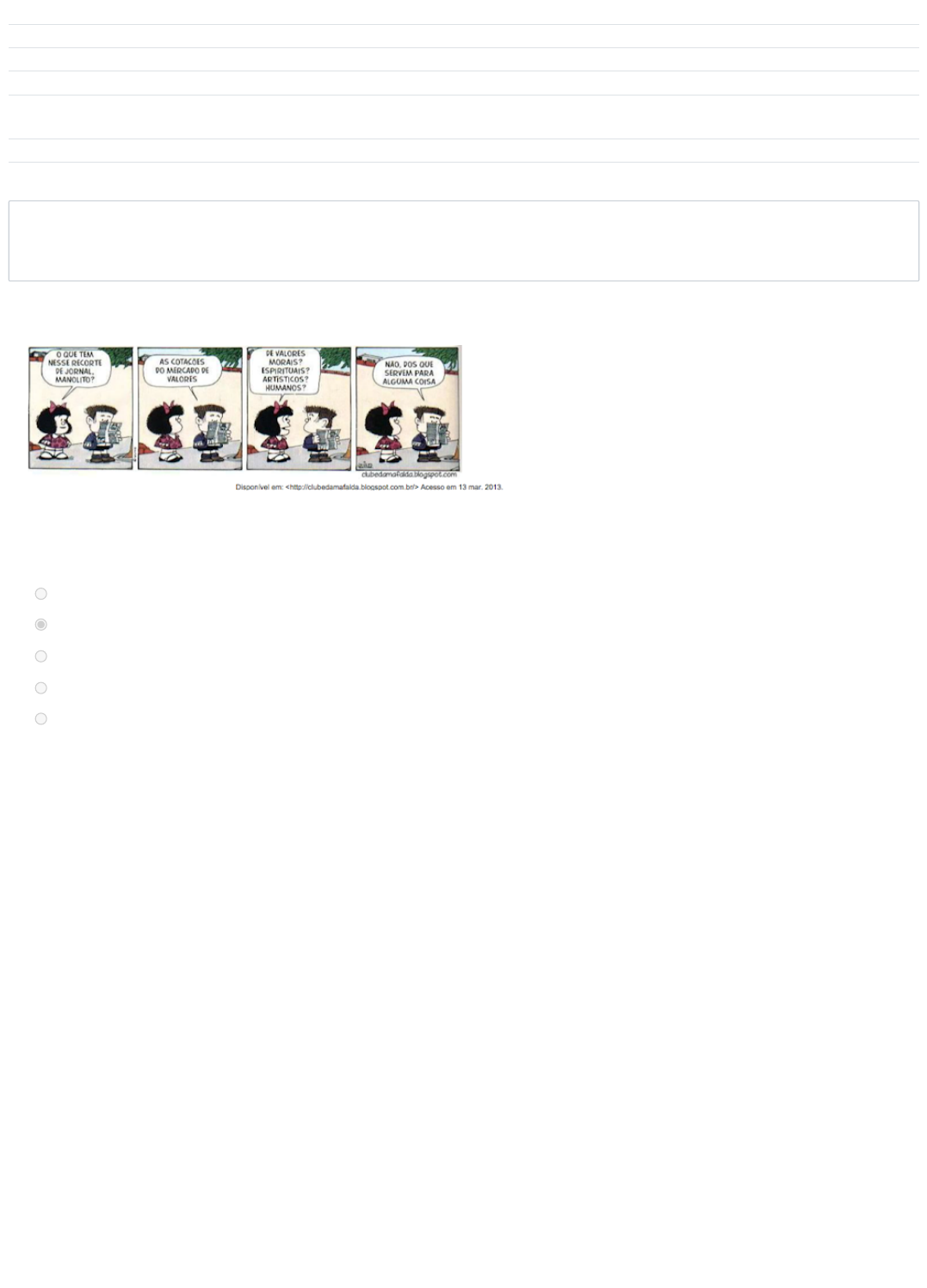 07/04/2023, 22:28 Simulados das avaliações: Revisão da tentativa https://virtual.uninta.edu.br/mod/quiz/review.php?attempt=4229865&cmid=1090279 1/20 Iniciado em sexta-feira, 7 abr. 2023, 18:44 Estado Finalizada Concluída em sexta-feira, 7 abr. 2023, 22:28 Tempo empregado 3 horas 43 minutos Notas 18,00/20,00 Avaliar 9,00 de um máximo de 10,00(90%) Questão 1 Correto Atingiu 1,00 de 1,00 Observe a tira: Tendo em vista a ideia da definição de valores morais, a fala do Manolito retrata: Escolha uma opção: A. Uma valiosa interpretação do que de fato tem valor; B. Uma nova significação de valores; C. Um cenário de vivência ético; D. Um cenário de crescimento reflexivo e moral; E. Uma transformação positiva da sociedade; Sua resposta está correta. Questão 12 - Ap1.1 ética A resposta correta é: Uma nova significação de valores; 07/04/2023, 22:28 Simulados das avaliações: Revisão da tentativa https://virtual.uninta.edu.br/mod/quiz/review.php?attempt=4229865&cmid=1090279 2/20 Questão 2 Correto Atingiu 1,00 de 1,00 Enfim, se quisesses atribuir o pecado ao Criador, desculparias o pecador, que nada teria cumprido fora dos desígnios de seu Criador. E então, poderias desculpá-lo com justiça, pois não haveria pecado algum. Logo, se não houver pecado, nada mais existe que possas atribuir à responsabilidade do Criador (AGOSTINHO, 1995, p.203). Com base no texto acima, avalie as asserções a seguir e a relação proposta entre elas. I___ O homem não é responsável pelo mal, pois o mal já estava determinado e sua ação que resulta no pecado é algo e o cumprimento do querer divino. II___ Deus em sua onisciência já saberia de toda ação humana e suas escolhas, logo o mal estaria voltado somente para Deus que permitiu a criação. Acerca das asserções, assinale a opção correta. Escolha uma opção: A. As asserções I e II são proposições verdadeiras, mas a II não é uma justificativa correta da I. B. A asserção I é uma proposição falsa, e a II é uma proposição verdadeira. C. A asserção I é uma proposição verdadeira, e a II é uma proposição falsa. D. As asserções I e II são proposições falsas. E. As asserções I e II são proposições verdadeiras, e a II é uma justificativa correta da I. Sua resposta está correta. Questão 5 - Ap1.2 - ética A resposta correta é: As asserções I e II são proposições falsas. 07/04/2023, 22:28 Simulados das avaliações: Revisão da tentativa https://virtual.uninta.edu.br/mod/quiz/review.php?attempt=4229865&cmid=1090279 3/20 Questão 3 Correto Atingiu 1,00 de 1,00 Observe a seguinte imagem: Observando a imagem acima, podemos perceber como as ações podem ser determinadas por uma dimensão reflexiva ou não. Dentro da proposta ética, é comum ao agir separar-se da multidão e de sua influência visando estabelecer uma escolha em consonância ao seu pensamento. O processo de autonomia, em muitas ocasiões exige essa separação. Assim sendo, podemos compreender que: Escolha uma opção: A. A ética busca a efetivação da subjetividade em função do desenvolvimento de sua racionalidade, por esta forma, a ação busca uma autonomia. B. A ética é uma imposição de valores sobre a ação correta, pois o sujeito ético atribui o sentido correto das ações para determinar a ação ao outro. C. A ética é uma ação individualista que visa o desenvolvimento da autonomia do indivíduo, mas resulta numa dimensão egoísta. D. A ética é uma reflexão sobre as opiniões de forma geral visando somente desconstruí-las. E. A ética busca o isolamento dos indivíduos, pois assim estes se tornam mais justos. Sua resposta está correta. Questão 3 - Ap1.1 ética A resposta correta é: A ética busca a efetivação da subjetividade em função do desenvolvimento de sua racionalidade, por esta forma, a ação busca uma autonomia. 07/04/2023, 22:28 Simulados das avaliações: Revisão da tentativa https://virtual.uninta.edu.br/mod/quiz/review.php?attempt=4229865&cmid=1090279 4/20 Questão 4 Incorreto Atingiu 0,00 de 1,00 A ideia de indivíduos acorrentados no fundo de uma caverna desde a sua infância apenas contemplando as sombras tomando-as como verdade revela um estado de ignorância. Para reverter este estado, era necessário se livrar desta condição e entender que a verdade se situa fora desta caverna. A caverna é nossa realidade e para chegarmos a uma verdade mais concisa deve-se libertar das aparências. Dentro da discussão política, alcançar esta condição significa. 1. Conhecer as ideias suprassensíveis, mas descartar as ideias materiais; 2. Conhecer somente as ideias materiais; 3. Conhecer somente as ideias suprassensíveis 4. Conhecer as ideias suprassensíveis em função das sensíveis; 5. Conhecer as ideias suprassensíveis para alcançar o bem maior. ASSINALE a alternativa CORRETA. Escolha uma opção: A. As afirmativas 1, 2, 3, 4 e 5 são verdadeiras. B. Somente as afirmativas 2 e 5 são verdadeiras. C. Somente as afirmativas 1, 2 e 3 são verdadeiras. D. Somente as afirmativas 1 e 3 são verdadeiras. E. Somente as afirmativas 4 e 5 são verdadeiras. Sua resposta está incorreta. Questão 4 - Ap1.2 - ética A resposta correta é: Somente as afirmativas 4 e 5 são verdadeiras. 07/04/2023, 22:28 Simulados das avaliações: Revisão da tentativa https://virtual.uninta.edu.br/mod/quiz/review.php?attempt=4229865&cmid=1090279 5/20 Questão 5 Correto Atingiu 1,00 de 1,00 A visão de mundo orgânica, "ecológica", das filosofias orientais é sem dúvida alguma, uma das principais razões para a imensa popularidade que adquiriram em nossos dias, no Ocidente, especialmente entre os jovens. Em nossa cultura ocidental, ainda denominada pela visão mecanicista e fragmentada do mundo, um crescente número de indivíduos começa a perceber do fato de que essa visão constitui a razão subjacente da ampla insatisfação reinante na sociedade. (CAPRA, 1983, p. 27). Considerando o texto apresentado ac