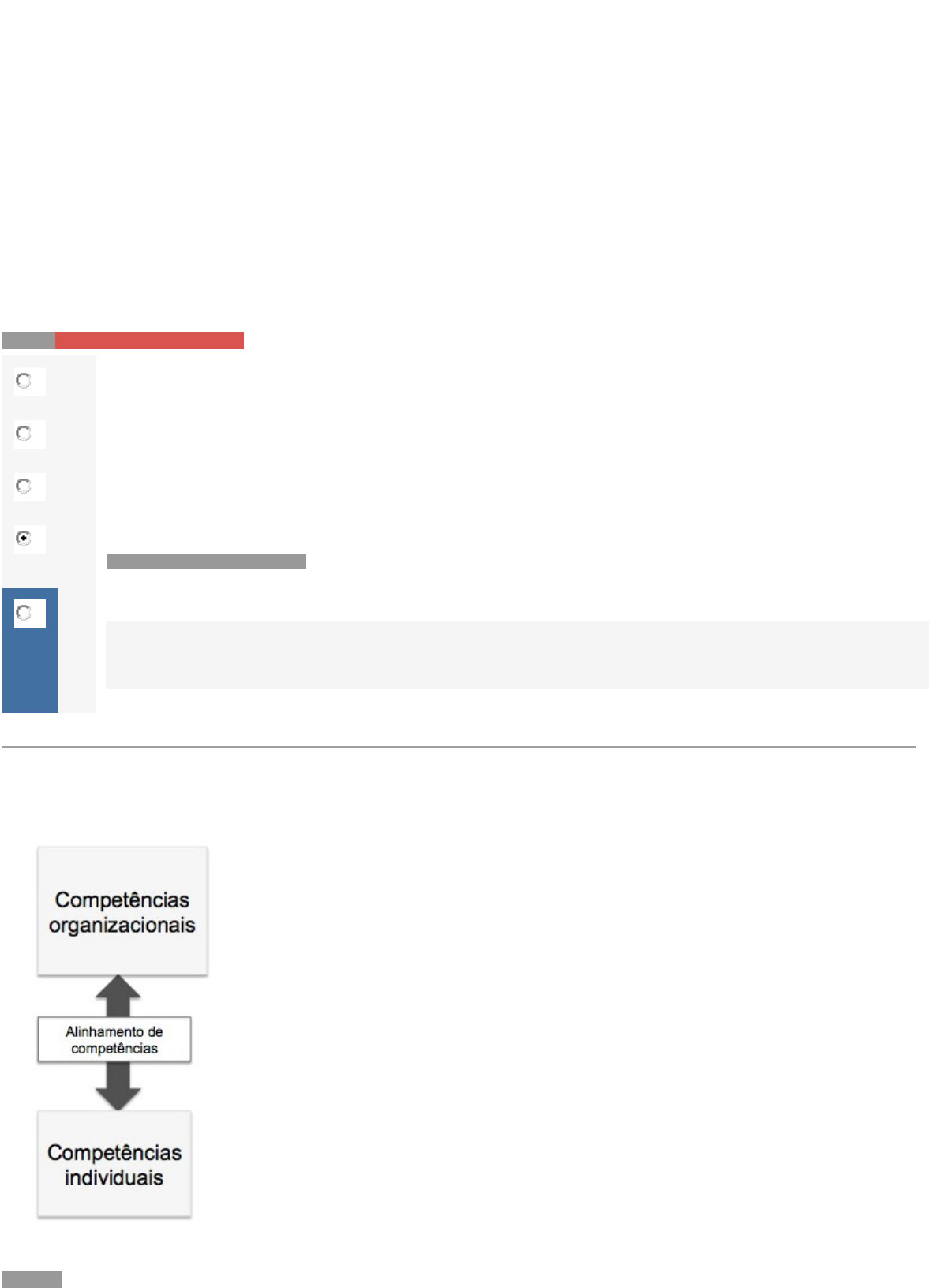 Questão 1/12 - Gestão do Conhecimento Leia o trecho a seguir: Lotz e Gramms (2014, p. 17) dizem que “o coaching é um processo que estimula reflexões para potencializar o desempenho e o aprendizado de um indivíduo, promovendo o desenvolvimento pessoal e profissional”. Baseado nesta afirmativa e nos conteúdos estudados, existem alguns benefícios do coaching para o indivíduo e para a organização. Analise as afirmativas que apresentam tais benefícios: I - Avaliação de desempenho individual dos colaboradores para garantir o alcance das metas operacionais. II - Acompanhamento profissional de pessoas em diferentes profissões e contextos. III - Fomento para a motivação, o rendimento, a capacidade de comunicação e o sucesso, aproveitando as capacidades e os conhecimentos comuns do Coach (o profissional) e do indivíduo. IV - Inovação no desenvolvimento de recursos humanos e instrumento para desenvolver a capacidade de aprendizagem de uma empresa. São corretas as afirmativas: Nota: 0.0Você não pontuou essa questão A I e II, apenas. B II e IV, apenas. C I, II e III, apenas. D I, III e IV, apenas. Você assinalou essa alternativa (D) E II, III e IV, apenas. A alternativa correta é a “e”, uma vez que, a única afirmativa incorreta é a I. A alternativa está correta pois a avaliação d aumento do desempenho individual possa ser resultado de um processo de coaching realizado dentro das organizações (Aula 04, t Questão 2/12 - Gestão do Conhecimento Avalie a figura a seguir: Após a sua avaliação, identifique nas alternativas abaixo aquela que expressa corretamente o que a figura expressa. Nota: 10.0 A A figura expressa a dificuldade que as organizações contemporâneas têm em conciliar as expectativas das pessoas com as expect B A figura expressa que a organização estabelece para si e para seus colaboradores um conjunto de competências, tal estabelecim C A figura expressa que as competências organizacionais e as individuais devem estar alinhas entre si para que as estratégias e os objetivos da empresa Você assinalou essa alternativa (C) Você acertou! A figura expressa que as competências organizacionais e as individuais devem estar alinhas entre si para que as estratégias e os objetivos da empresa sejam alcançados. seus objetivos, definidos em seu planejamento estratégico, com as competências dos profissionais. O desempenho e a competitividade da empresa depende desse alinhamento, assim como, o desempenho do colaborador, pois, tal alinhamento direciona as ações deste. As alternativas "a", "b, "d" e "e" são incorretas, saiba o porquê: Conforme diz Dutra (2004) o "calcanhar-de-Aquiles" da gestão de pessoas em organizações contemporâneas é a necessidade da contínua conciliação entre as expectativas da A figura não representa o mapeamento de competências. A figura não expressa as categorias organização define as suas competências. Resposta: Aula 2 - Tema 05. D A figura expressa que a organização necessita alinhar seus objetivos com o seu desempenho, conforme definidos depende desse alinhamento. E A figura expressa que a organização define as suas competências, algumas são as essenciais, outras das unidades de negócios, outras de suporte, outras dinâmicas e estas precisam estar alinhadas entre si. Questão 3/12 - Gestão do Conhecimento Leia o texto: O coaching objetiva a aquisição de competências técnicas ou comportamentais, aumentar a performance de indivíduos, times ou empresas, ou ainda desenvolver carreiras (Da Matta e Victoria, 2012). A analise os itens a seguir e identifique aqueles que trazem aspectos coerentes sobre o processo de coaching. I - Para atuar como coach, o profissional precisa passar por um processo longo de formação. II - O coaching é similar a treinamento ou aconselhamento ou mentoring, é uma parceria em que o coach contribui para que o coachee obtenha melhores resultados. III - Hábitos arraigados são facilitadores para o desenvolvimento, pois ações e pensamentos bem estruturados e mantidos por tempos fixam modelos mentais e formas de ser. IV - O coaching deve estar focado em resultados, os quais são previamente negociados e estabelecidos entre o coach e o coachee. V - O coaching deve gerar foco, dar ênfase em ações, acompanhar, avaliar e medir resultados, além de propiciar melhoria continua ao coachee. Nota: 10.0 A I; IV; V. Você assinalou essa alternativa (A) Você acertou! Referem-se ao processo de coaching: Para atuar como coach, o profissional precisa passar por um processo longo de formação. O coaching deve estar focado em resultados, os quais são previamente negociados e estabelecidos entre o coach e o coachee. O coaching deve gerar foco, dar ênfase em ações, acompanhar, avaliar e medir resultados, além de propiciar melhoria continua ao coachee. Os itens II e III estão incorretos, pois o coaching não é similar a treinamento ou aconselhamento ou mentoring, como também, dificultadores. Resposta: Aula 4 - Tema 03. B II; III. IV. C I; II; V. D IV; V. E II; III. Questão 4/12 - Gestão do Conhecimento Leia o caso: João Carlos ingressou em uma indústria automotiva desenvolvendo atividades do eixo de carreira operacional, ocupava o cargo de auxiliar de produção, estava com 19 anos e tinha ensino médio incompleto. Concluiu o ensino médio, desenvolveu suas competência, fez uma faculdade de Gestão de RH. Em razão das novas competências e de suas entregas, passou para a carreira gerencial da área de produção, ocupando o cargo de encarregado de turno. Devido a sua formação em RH e sua performance ao liderar a equipe, surgiu oportunidade para migrar para a carreira profissional. Foi transferido para área de RH, na qual passou a ocupar um cargo de Analista RH. O caso de João Carlos exemplifica um processo de RH que contempla o modelo de gestão de pessoas por competências, analise as alternativas a seguir e assinale aquela que apresenta, de forma correta, qual o pro