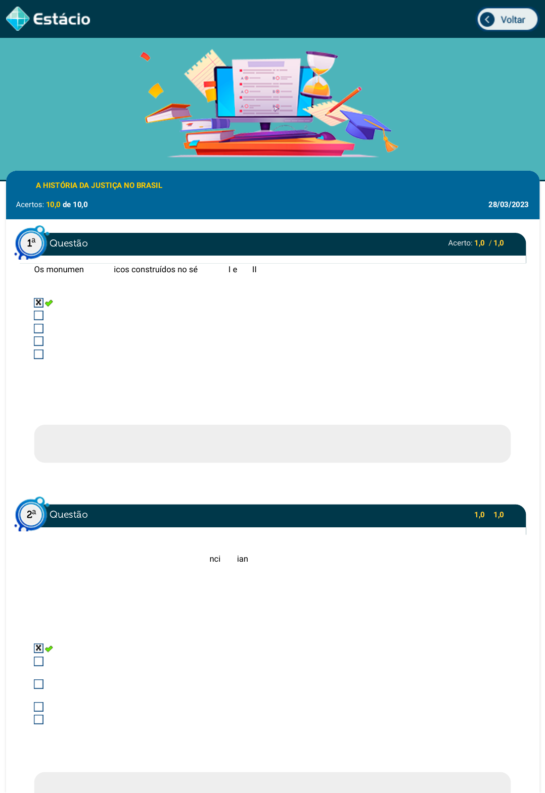 Disc.: A HISTÓRIA DA JUSTIÇA NO BRASIL Acertos: 10,0 de 10,0 28/03/2023 Acerto: 1,0 / 1,0 Os monumentos jurídicos construídos no século XVII e XVIII marcam o direito colonial. Uma das formas de influência e que permanece por longo tempo são as: Ordenações Filipinas Cartas Forais Lex Bizantinae Lex Wisigothorum Tribunais da Relação Respondido em 28/03/2023 09:51:16 Explicação: A resposta correta é: Ordenações Filipinas Acerto: 1,0 / 1,0 (FCC/2018) Considere abaixo o trecho do Hino da Inconfidência Baiana. Igualdade e liberdade / No sacrário da Razão / ao lado da Sã Justiça / Preenchem meu coração / (...) Se este dogma for seguido (...) e assim que florescido / tem na América a Nação / Assim flutue o pendão dos franceses / que a imitaram / depois que afoitos, entraram / no sacrário da Razão. (Apud MOURA, Clóvis. Dicionário da Escravidão Negra no Brasil. Edusp, 2004, p. 205) O trecho revela as seguintes influências da chamada Inconfidência Baiana (1798), também conhecida como Conjuração Baiana e Revolta dos Búzios: a Revolução Francesa e o iluminismo, corrente que cultuava a Razão como valor universal. a Revolução Pernambucana e o nacionalismo como exemplos de libertação racional dos povos contra a escravidão e o colonialismo. a Declaração dos Direitos do Homem e do Cidadão , e a Justiça praticada pela Maçonaria, como exemplos da defesa da igualdade em nome da Razão. o liberalismo e a religião calvinista, crença que considerava Deus como símbolo da Justiça e da Razão. o Império Napoleônico e o positivismo, escola que cultuava a ciência como Razão universal. Respondido em 28/03/2023 10:02:39 Explicação: Questão1 a Questão2 a https://simulado.estacio.br/alunos/inicio.asp javascript:voltar(); Na manhã de 12 de agosto de 1798, a população de Salvador foi surpreendida pelo teor dos boletins manuscritos afixados em prédios públicos, alguns dos quais com uma mensagem que convocava o povo baiano, favorável à República; era uma ordem, uma conclamação para uma necessária revolução. A informação foi acrescida pela convocação da população a participar do levante projetado pelo Partido da Liberdade: um grupo que se intitulava Anônimos Republicanos (MATTOSO, 1969). As autoridades dos dois lados do Atlântico não desconsideraram o peso dos termos veiculados nos boletins, liberdade, república e revolução, que naquela conjuntura compunham a cadência da Revolução Americana (1776), da Revolução Francesa (1789) e da revolução escrava em São Domingo (1791). MATTOSO, K. M. de Q. Presença francesa no movimento democrático baiano de 1798. Salvador: Itapuã, 1969. p. 150-159. Acerto: 1,0 / 1,0 A escravidão no Brasil, em termos jurídicos, pode ser corretamente associada a: Manutenção do status financeiro e garantia da propriedade privada. Crise religiosa, que via na escravidão uma ofensa. Luta de classes, com os trabalhadores escravos lutando por direitos. A compra de alforrias como um processo jurídico. Uma mudança articulada pela aristocracia e quem tem fim por obras da princesa Isabel. Respondido em 28/03/2023 09:36:01 Explicação: A resposta correta é: Manutenção do status financeiro e garantia da propriedade privada. Acerto: 1,0 / 1,0 Em 7 de abril de 1831, D. Pedro I abdicou do trono brasileiro em favor de seu filho, Pedro. Ao período que sucedeu a esse ato chamou-se Regência, durante o qual o país foi governado por políticos em nome do imperador, à época com apenas cinco anos de idade. Algumas reformas institucionais marcaram esse período, que estendeu-se de 1831 a 1840. Entre elas está a criação das Assembleias Provinciais, que substituíram, com mais poderes, os antigos Conselhos Gerais. Essa mudança foi implantada por meio da: Dissolução das Assembleias Provinciais. Promulgação do Ato Adicional. Criação da Guarda Nacional. Criação do Código de Processo Criminal. Dissolução dos Conselhos Gerais. Respondido em 28/03/2023 10:03:31 Explicação: A resposta correta é: Promulgação do Ato Adicional. Acerto: 1,0 / 1,0 Em relação ao Golpe Militar de 1964 no Brasil, pode-se dizer que: I. Foi fruto de uma conspiração civil militar alarmada com os rumos nacionalistas do governo João Goulart. II. Foi a forma encontrada pelos comandos militares para garantir a posse do novo presidente. III. Representou a repulsa de setores da sociedade brasileira à tentativa de João Goulart de aumentar a presença do capital estrangeiro no País. Questão3 a Questão4 a Questão5 a IV. Evitou a tentativa do Partido Comunista Brasileiro, de sindicatos de trabalhadores e de setores do Partido Trabalhista Brasileiro de pressionar o presidente, para a implementação imediata das "reformas de base" que forma anunciadas. Analisando as afirmações anteriores, podemos concluir que estão corretas somente: I, II e IV. I, IV. III e V. III e IV. I, II e III. Respondido em 28/03/2023 09:40:44 Explicação: A resposta correta é: I, II e IV. Acerto: 1,0 / 1,0 (FCC/2015) "Seu Mundinho, todo esse tempo combati o senhor. Fui eu quem mandou atirar em Aristóteles. Estava preparado para virar Ilhéus do avesso. Os jagunços estavam de atalaia, prontos para obedecer. Os meus e os outros amigos, para acabar com a eleição. Agora tudo acabou". (In: AMADO, Jorge. Gabriela, cravo e canela) O texto descreve uma realidade que, na história do Brasil, identifica o: integralismo, que consistia em uma forma de a oligarquia cafeeira demonstrar sua influência e poder político. tenentismo, que considerava o exército como a única força capaz de conduzir os destinos do povo. messianismo, entidade com poderes políticos capaz de subjugar a população por meio da força. mandonismo, criado com o objetivo de administrar os conflitos no interior das elites agrárias do país. coronelismo, que se constituía em uma forma de o poder privado se manifestar por meio da política. Respondido em 28/03/2023 10:03:06 Explicação: "O