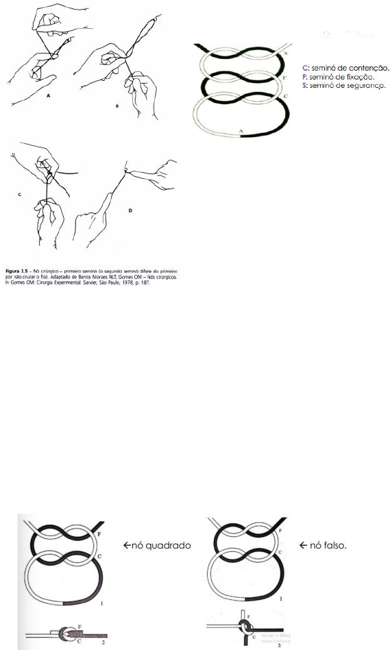Nós Cirúrgicós Definicãó: O nó cirúrgico é a unidade fundamental da hemostasia definitiva e da síntese. O nó deve ser executado de maneira padronizada e segura. Fúncãó: O essencial é que se estabeleça os três objetivos básicos da sutura (aproximação, recobrimento e hemostasia) quanto for necessário. Cãrãcteristicãs: Deve ser de fácil execução. O principal é que não se afrouxe, permitindo perfeito ajuste das bordas a serem afrontadas. A quantidade de pontos necessária para uma sutura adequada depende do local anatômico e sua função e do calibre e tipo de fio empregado. O mesmo deve estabelecer o tempo de retirada dos pontos (quando necessário). Quanto antes a retirada do fio de sutura, desde que observado o tempo para cicatrização do tecido, melhor o resultado estético e menor a reação tecidual. O nó bem-executado exige atenção aos seguintes itens: • não deve ser cruzado, sob risco de rompimento; • o primeiro nó não deve estar frouxo; • deve-se empregar forças iguais em ambos os braços do fio, sem deslocar o nó; • os dedos indicadores acompanham o laço do nó, dirigindo-o e fixando-o no local apropriado e com tensão apropriada; • na execução do segundo nó, evita-se a tração do primeiro já executado, pois qualquer tração mais intensa removerá o primeiro nó; • o número de nós varia de acordo com o tipo de fio empregado e com os tipo de tecido. Os fios finos e monofilamentares (mononylon e Prolene), pela propriedade de “memória” do fio, exigem a execução de mais de três nós. Seminós: O nó cirúrgico, em geral, contas de uma primeira laçada que aperta (1º seminó faz a contenção → seminó constritor), e uma segunda fixadora, que impede o afrouxamento da primeira (2º seminó fixa o entreleçamento → seminó fixador). Quando há necessidade de maior segurança acrescenta-se um terceiro nó (3º seminó é o fixador de reforço → seminó reforço), também utilizado quando existe tendência de os anteriores afrouxarem-se. Cada laçada deve ser feita no sentido oposto ao da anterior, caso contrário, o nó tende a se afrouxas. Além disso, deve-se usar mais os dedos do que as mãos e deve-se deslizar o nó com o indicador esticado. Nó Cómúm: Dois seminós simples seguidos realizados com apenas uma mão. Dentro do nó comum temos: o Nó quadrado: mais seguro, possui duas passagens diferentes (dois seminós simples em direções opostas), é assimétrico, mais resistente a o deslizamento. o Nó falso: deslizante, não é adequado, tem duas passagens iguais (um seminó simples sobreposto sobre o outro), é simétrico. Se você amarrar um fio (1° seminó) da esquerda sobre a direita e sobre ele um segundo seminó também da esquerda sobre a direita, você produz um nó comum (você também poderia amarrar dois fios da direita sobre a esquerda, da direita sobre a esquerda). No nó comum, os fios dos dois seminós se cruzam em vez de correrem paralelos como no nó direito, encurtando o comprimento de contato. Em um nó comum as extremidades tendem a estar em ângulos retos com as partes fixas. Nó Direitó: Amarre dois fios (1° seminó) da esquerda sobre a direita, por exemplo, cruzando os fios de forma que o fio esquerdo é tracionado para a direita e o fio direito é tracionado para a esquerda, e crie um segundo seminó cruzando o que é agora o fio direito para a esquerda, sobre o fio esquerdo. Isso forma um nó direito. Em um nó direito as extremidades estão paralelas às partes fixas. Nó Córredicó: Se você criar os mesmos seminós para um nó comum e um nó direito, mas mantiver um fio esticado, você produz um nó corrediço. Isso enfatiza a necessidade crítica, quando apertar os nós, de manter corretamente sua relação. Tecnicã de Pãúchet: Técnica utilizando o dedo médio para a confecção do nó, unimanual. Possui rápida execução e desvantagem em tecidos sob tensão. 1. A mão direita (dominante, fio amarelo) que dá o nó cruza o fio por baixo. A mão esquerda passa o fio por baixo, para mão direita que vai fará o nó (fica cruzado em cima). No nó comum uma mão trabalha (dominante) enquanto a outra fica parada. 2. Segura o cordão da mão direita com o indicador e polegar (no formato de pinça), apoia os 3 dedos e vira a palma da mão para cima. O fio fica encostado no mindinho. 3. O fio da mão esquerda vem por cima (fio preto), formando um 4. (Fica encostado no indicador) 4. Usa-se o dedo médio para confeccionar o nó. O dedo médio passa por cima do fio preto, enroscando o fio amarelo por baixo e o trazendo para dentro da laçada. 5. Retiram-se os dedos e os fios são puxados para se fizarem, finalizando o nó. Tecnicã Cirúrgiãó: 1º seminó duplo e 2º seminó simples, independente da técnica utilizada para a confecção dos seminós 1. Com a mão direita faz-se a técnica do dedo médio (passa fio amarelo por baixo). E a mão esquerda usa a técnica do indicador então passa por cima. 2. O fio amarelo é pego em pinça com a técnica do dedo médio, sendo os 3 dedos apoiados para virar. 3. A mão esquerda leva o fio para baixo do polegar. 4. Realiza-se o seminó simples. Tecnicã Sãpãteiró: Realizam-se 3 seminós. Possui lenta elaboração mas permite a realização de seminós sem diminuir a tensão do nó, mantendo os fios sempre esticados. 1. Fio esquerdo passa para o lado direito (por cima). 2. Fio direito passa para o lado esquerdo (por baixo). 3. O fio da mão direita passa por cima da mão esquerda, colocando o polegar entre os fios. 4. O polegar e o indicador direitos em pinça pegam a ponta do fio da mão por cima 5. Pegar novamente a ponta com a mão esquerda. 6. Deslizar o seminó dado com o dedo indicador esticado. Tecnicã Sãpãteiró Invertidó: 1. Fio esquerdo passa para a direita (por baixo). 2. Fio direito passa para o lado esquerdo (por cima). 3. Dedo polegar direito traciona o fio direito por fora e entra por baixo do fio esquerdo, ficando o
