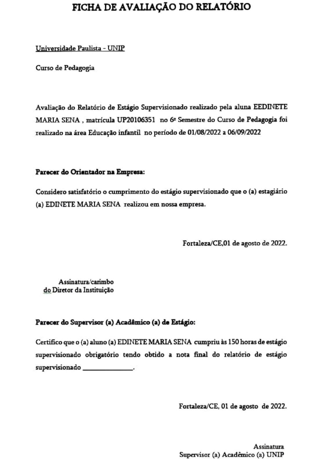 FICHA DE AVALIAÇÃO DO RELATÓRIO Universidade Paulista-UNR Curso de Pedagogia Avaliação do Relatório de Estágio Supervisionado realizado pela aluna EEDINETE MARIA SENA, matrícula UP20106351 no 6 Semestre do Curso de Pedagogia foi realizado na área Educaç�o infantil no periodo de 01/08/2022 a 06/09/2022 Parecer do Orientador na Empresa: Considero satisfatórioo cumprimento do estágio supervisionado que o (a) estagarno (a) EDINETE MARIA SENA realizou em nossa empresa. Fortaleza/CE,01 de agosto de 2022. Assinatura/carimbo do Diretor da Instituiç�o Parecer do Supervisor (a) Acadámico (a) de Estágio: Certifico que o (a) aluno (a) EDINETE MARIA SENA cumpriu às 150 horas de estágio supervisionado obrigatório tendo obtido a nota final do relatório de estágio supervisionado. Fortaleza/CE, 01 de agosto de 2022. Assinatura Supervisor (a) Academico (a) UNIP