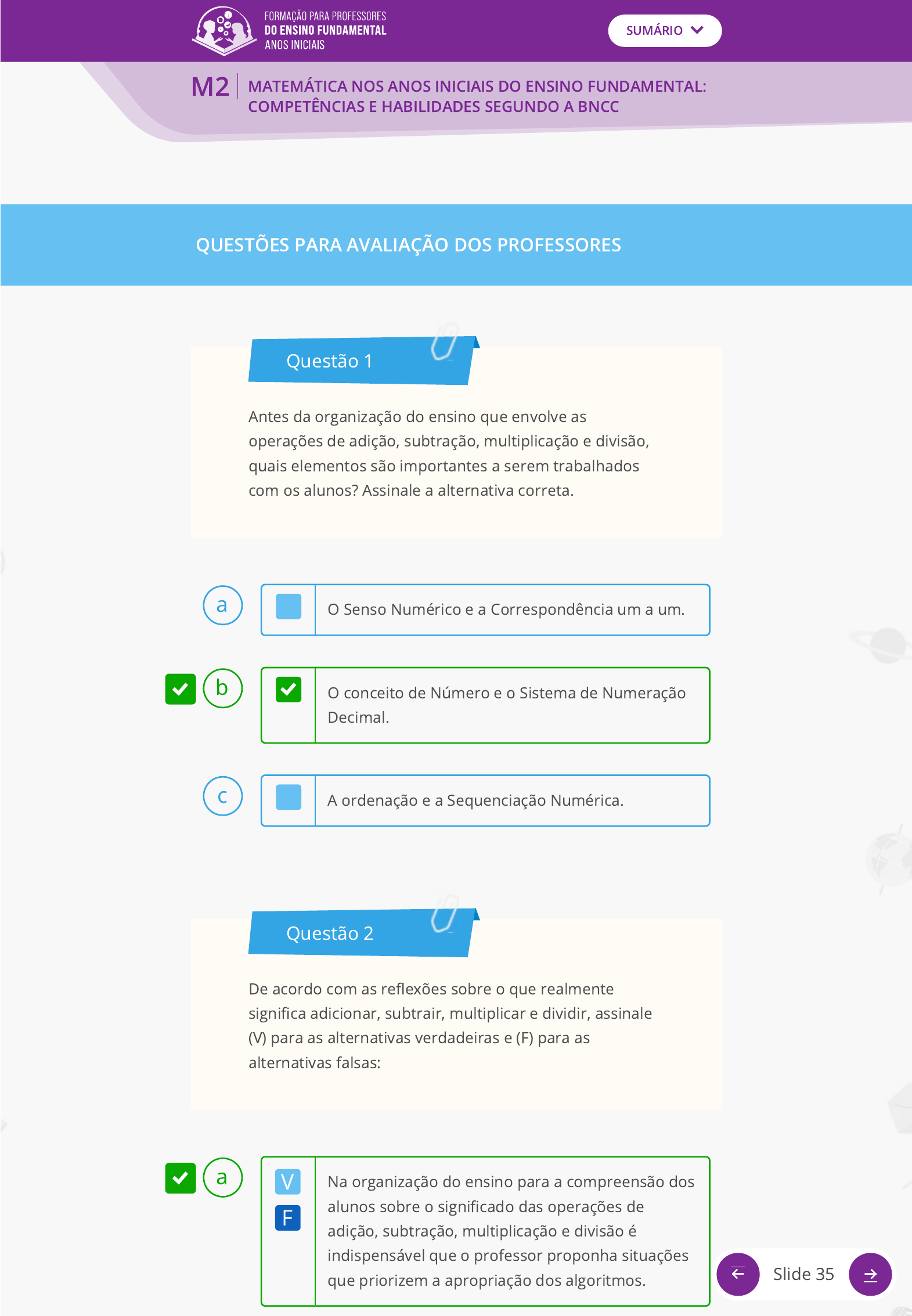 QUESTÕES PARA AVALIAÇÃO DOS PROFESSORES Antes da organização do ensino que envolve as operações de adição, subtração, multiplicação e divisão, quais elementos são importantes a serem trabalhados com os alunos? Assinale a alternativa correta. O Senso Numérico e a Correspondência um a um.a O conceito de Número e o Sistema de Numeração Decimal. b A ordenação e a Sequenciação Numérica.c De acordo com as re�exões sobre o que realmente signi�ca adicionar, subtrair, multiplicar e dividir, assinale (V) para as alternativas verdadeiras e (F) para as alternativas falsas: Na organização do ensino para a compreensão dos alunos sobre o signi�cado das operações de adição, subtração, multiplicação e divisão é indispensável que o professor proponha situações que priorizem a apropriação dos algoritmos. a F V Questão 1 Questão 2 M2 MATEMÁTICA NOS ANOS INICIAIS DO ENSINO FUNDAMENTAL: COMPETÊNCIAS E HABILIDADES SEGUNDO A BNCC SUMÁRIO Slide 35 https://avamec.mec.gov.br/ava-mec-ws/instituicao/seb/conteudo/modulo/4524/mod2/uni5/slide36.html https://avamec.mec.gov.br/ava-mec-ws/instituicao/seb/conteudo/modulo/4524/mod2/uni5/slide34.html O signi�cado das operações de adição é juntar e acrescentar, o da subtração é retirar, completar e comparar. Para organizar o ensino dessas operações, um caminho seria por meio da resolução de situações-problemas. b F V Para a aprendizagem sobre o que signi�ca dividir é su�ciente que os alunos compreendam a repartição equitativa por meio da resolução de situações-problemas com apoio de um material manipulável. c F V A partir de nossos estudos sobre sólidos geométricos e �guras planas, coloque V (verdadeiro) ou F (falso) em cada uma das a�rmativas. A forma de�ne e individualiza um objeto, diferenciando-o de outro. a F V A maçã não é uma esfera, o tronco da árvore ou o graveto não são cilindros. b F V Forma não é o aspecto perceptível pelos sentidos. c F V Quem dá a regularidade métrica à forma não é o ser humano. d F V A forma geométrica ajuda a quanti�car o espaço. e F V Questão 3 Questão 4 Slide 35 https://avamec.mec.gov.br/ava-mec-ws/instituicao/seb/conteudo/modulo/4524/mod2/uni5/slide36.html https://avamec.mec.gov.br/ava-mec-ws/instituicao/seb/conteudo/modulo/4524/mod2/uni5/slide34.html Marque a opção correta. Ao pensarmos em um trabalho pedagógico com jogo, podemos a�rmar que: O jogo deixa de ser interessante para o aluno porque visa à elaboração de procedimentos e tomadas de decisões: habilidades necessárias para o trabalho com resolução de problemas, tanto no âmbito escolar como no contexto social. a A mediação e orientação do professor junto aos procedimentos dos alunos, durante o jogo, questionando sobre suas jogadas e estratégias, não são necessárias para que o jogar se torne um ambiente de aprendizagem e (re)criação conceitual. b No jogo há apenas a reprodução mecânica do conceito. c Deve �car claro que não é o jogo que trabalha a Matemática, mas a intervenção pedagógica que se faz nele. d Enumere a sequência do trabalho pedagógico com jogos, segundo Grando (2004): “Jogo pelo jogo” ou jogar para garantir regras. 3 Intervenção pedagógica verbal. 4 Familiarização com o material. 1 Jogar com “competência”. 7 Registro do jogo. 5 Questão 5 Slide 35 https://avamec.mec.gov.br/ava-mec-ws/instituicao/seb/conteudo/modulo/4524/mod2/uni5/slide36.html https://avamec.mec.gov.br/ava-mec-ws/instituicao/seb/conteudo/modulo/4524/mod2/uni5/slide34.html Reconhecimento das regras. 2 Intervenção escrita. 6 De acordo com seus estudos sobre área e perímetro, é correto a�rmar que: Figuras de mesma área sempre possuem o mesmo perímetro. a Figuras de mesma área não, necessariamente, possuem o mesmo perímetro. b Sobre a organização do ensino de Estatística na perspectiva investigativa nos anos iniciais, assinale a alternativa que representa todas as etapas que precisam ser consideradas. De�nição da questão-problema, construção de tabelas e elaboração de deduções e/decisões. a Instrumento de coleta de dados, elaboração de planilhas e construção de grá�cos; b De�nição da questão-problema, coleta dos dados, representação dos dados, interpretação dos dados e elaboração de deduções e/ou decisões. c Questão 6 Questão 7 Questão 8 Slide 35 https://avamec.mec.gov.br/ava-mec-ws/instituicao/seb/conteudo/modulo/4524/mod2/uni5/slide36.html https://avamec.mec.gov.br/ava-mec-ws/instituicao/seb/conteudo/modulo/4524/mod2/uni5/slide34.html Refazer Atividade Respondidas 8 de 8 questões Progresso do Módulo VOLTAR 35 de 36 AVANÇAR Quais as noções envolvendo Probabilidade podem ser exploradas com o jogo “Campeonato dos números”? Assinale a alternativa correta. Evento equiprovável, espaço amostral e aleatoriedade. a Espaço amostral, soma dos números e cálculo de probabilidade. b Cálculo de probabilidade e princípio multiplicativo de contagem. c Parabéns! Você chegou ao �nal do processo de Formação em Matemática nos Anos Iniciais do Ensino Fundamental! Esperamos que você tenha aproveitado o conteúdo estudado. Caso queira aprofundar seus estudos, veja a lista de referências no próximo slide. Slide 35 https://avamec.mec.gov.br/ava-mec-ws/instituicao/seb/conteudo/modulo/4524/mod2/uni5/slide34.html https://avamec.mec.gov.br/ava-mec-ws/instituicao/seb/conteudo/modulo/4524/mod2/uni5/slide36.html https://avamec.mec.gov.br/ava-mec-ws/instituicao/seb/conteudo/modulo/4524/mod2/uni5/slide36.html https://avamec.mec.gov.br/ava-mec-ws/instituicao/seb/conteudo/modulo/4524/mod2/uni5/slide34.html