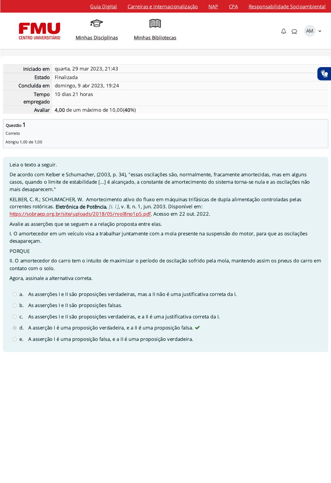 09/04/2023 18:26 Atividade 4 (A4): Revisão da tentativa https://ambienteacademico.com.br/mod/quiz/review.php?attempt=1901041&cmid=796563 1/6 Iniciado em quarta, 29 mar 2023, 21:43 Estado Finalizada Concluída em domingo, 9 abr 2023, 19:24 Tempo empregado 10 dias 21 horas Avaliar 4,00 de um máximo de 10,00(40%) Questão 1 Correto Atingiu 1,00 de 1,00 Leia o texto a seguir. De acordo com Kelber e Schumacher, (2003, p. 34), "essas oscilações são, normalmente, fracamente amortecidas, mas em alguns casos, quando o limite de estabilidade [...] é alcançado, a constante de amortecimento do sistema torna-se nula e as oscilações não mais desaparecem." KELBER, C. R.; SCHUMACHER, W. Amortecimento ativo do �uxo em máquinas trifásicas de dupla alimentação controladas pelas correntes rotóricas. Eletrônica de Potência, [s. l.], v. 8, n. 1, jun. 2003. Disponível em: https://sobraep.org.br/site/uploads/2018/05/rvol8no1p5.pdf. Acesso em 22 out. 2022. Avalie as asserções que se seguem e a relação proposta entre elas. I. O amortecedor em um veículo visa a trabalhar juntamente com a mola presente na suspensão do motor, para que as oscilações desapareçam. PORQUE II. O amortecedor do carro tem o intuito de maximizar o período de oscilação sofrido pela mola, mantendo assim os pneus do carro em contato com o solo. Agora, assinale a alternativa correta. a. As asserções I e II são proposições verdadeiras, mas a II não é uma justi�cativa correta da I. b. As asserções I e II são proposições falsas. c. As asserções I e II são proposições verdadeiras, e a II é uma justi�cativa correta da I. d. A asserção I é uma proposição verdadeira, e a II é uma proposição falsa. e. A asserção I é uma proposição falsa, e a II é uma proposição verdadeira. Guia Digital Carreiras e Internacionalização NAP CPA Responsabilidade Socioambiental Minhas Disciplinas Minhas Bibliotecas AM https://sobraep.org.br/site/uploads/2018/05/rvol8no1p5.pdf https://codely-fmu-content.s3.amazonaws.com/Moodle/GuiaDigital/Guia+digital/index.html https://carreiras.fmu.br/ https://codely-fmu-content.s3.amazonaws.com/Moodle/NAP/inicial/nap/fmu/index.html https://codely-fmu-content.s3.amazonaws.com/Moodle/CPA/landing_CPA/index.html https://portal.fmu.br/sustentabilidade https://ambienteacademico.com.br/ https://ambienteacademico.com.br/ https://ambienteacademico.com.br/course/view.php?id=236 09/04/2023 18:27 Atividade 4 (A4): Revisão da tentativa https://ambienteacademico.com.br/mod/quiz/review.php?attempt=1901041&cmid=796563 2/6 Questão 2 Correto Atingiu 1,00 de 1,00 Questão 3 Incorreto Atingiu 0,00 de 1,00 Diferentes tipos de cames vão nos exigir diferentes conhecimentos teóricos, seja para seu projeto construtivo, seja para sua interpretação e aplicação. Considerando os cames que apresentam movimento harmônico simples, assinale a alternativa que contém a informação correta do que é necessário para realizar o cálculo da aceleração do came e do seguidor. a. Subida total, ângulo do eixo do came e ângulo total de subida. b. Ângulo do eixo do came e do seguidor. c. Subida total, ângulo do eixo do seguidor e ângulo total da subida. d. Descida total, ângulo do eixo do came e ângulo total de descida. e. Tempo de subida e descida. Dentro do contexto de mecanismos, temos diversos elementos que são fundamentais para o bom funcionamento de um sistema mecânico. Podemos citar, como exemplo de um desses mecanismos, o came. Considerando seu conhecimento sobre o assunto, assinale a alternativa que indica o que é um came. a. Parte do mecanismo que sofre movimentação por meio de uma ação. b. Similar ao mecanismo de quatro barras com o elo acoplador trocado por meia junta. c. Mecanismo de barras simples. d. Elemento mecânico de �xação. e. Tipo de junta cinemática. Guia Digital Carreiras e Internacionalização NAP CPA Responsabilidade Socioambiental Minhas Disciplinas Minhas Bibliotecas AM https://codely-fmu-content.s3.amazonaws.com/Moodle/GuiaDigital/Guia+digital/index.html https://carreiras.fmu.br/ https://codely-fmu-content.s3.amazonaws.com/Moodle/NAP/inicial/nap/fmu/index.html https://codely-fmu-content.s3.amazonaws.com/Moodle/CPA/landing_CPA/index.html https://portal.fmu.br/sustentabilidade https://ambienteacademico.com.br/ https://ambienteacademico.com.br/ https://ambienteacademico.com.br/course/view.php?id=236 09/04/2023 18:27 Atividade 4 (A4): Revisão da tentativa https://ambienteacademico.com.br/mod/quiz/review.php?attempt=1901041&cmid=796563 3/6 Questão 4 Correto Atingiu 1,00 de 1,00 Como sabemos, diferentes tipos de cames vão exigir diferentes abordagens para estudo, projeto e aplicação. Além disso, diferentes tipos de cames vão apresentar diferentes movimentos. A imagem a seguir apresenta um tipo de movimento. Analise o grá�co e faça o que se pede: Fonte: Elaboração do autor, 2022. Com base na imagem apresentada, assinale a alternativa que descreve o movimento apresentado. a. Movimento harmônico simples. b. Movimento cicloidal. c. Movimento polinomial. d. Movimento uniforme. e. Movimento de rotação. Guia Digital Carreiras e Internacionalização NAP CPA Responsabilidade Socioambiental Minhas Disciplinas Minhas Bibliotecas AM https://codely-fmu-content.s3.amazonaws.com/Moodle/GuiaDigital/Guia+digital/index.html https://carreiras.fmu.br/ https://codely-fmu-content.s3.amazonaws.com/Moodle/NAP/inicial/nap/fmu/index.html https://codely-fmu-content.s3.amazonaws.com/Moodle/CPA/landing_CPA/index.html https://portal.fmu.br/sustentabilidade https://ambienteacademico.com.br/ https://ambienteacademico.com.br/ https://ambienteacademico.com.br/course/view.php?id=236 09/04/2023 18:27 Atividade 4 (A4): Revisão da tentativa https://ambienteacademico.com.br/mod/quiz/review.php?attempt=1901041&cmid=796563 4/6 Questão 5 Correto Atingiu 1,00 de 1,00 Questão 6 Incorreto Atingiu 0,00 de 1,00 Os amortecedores são partes de máquinas que trazem segurança a elas q