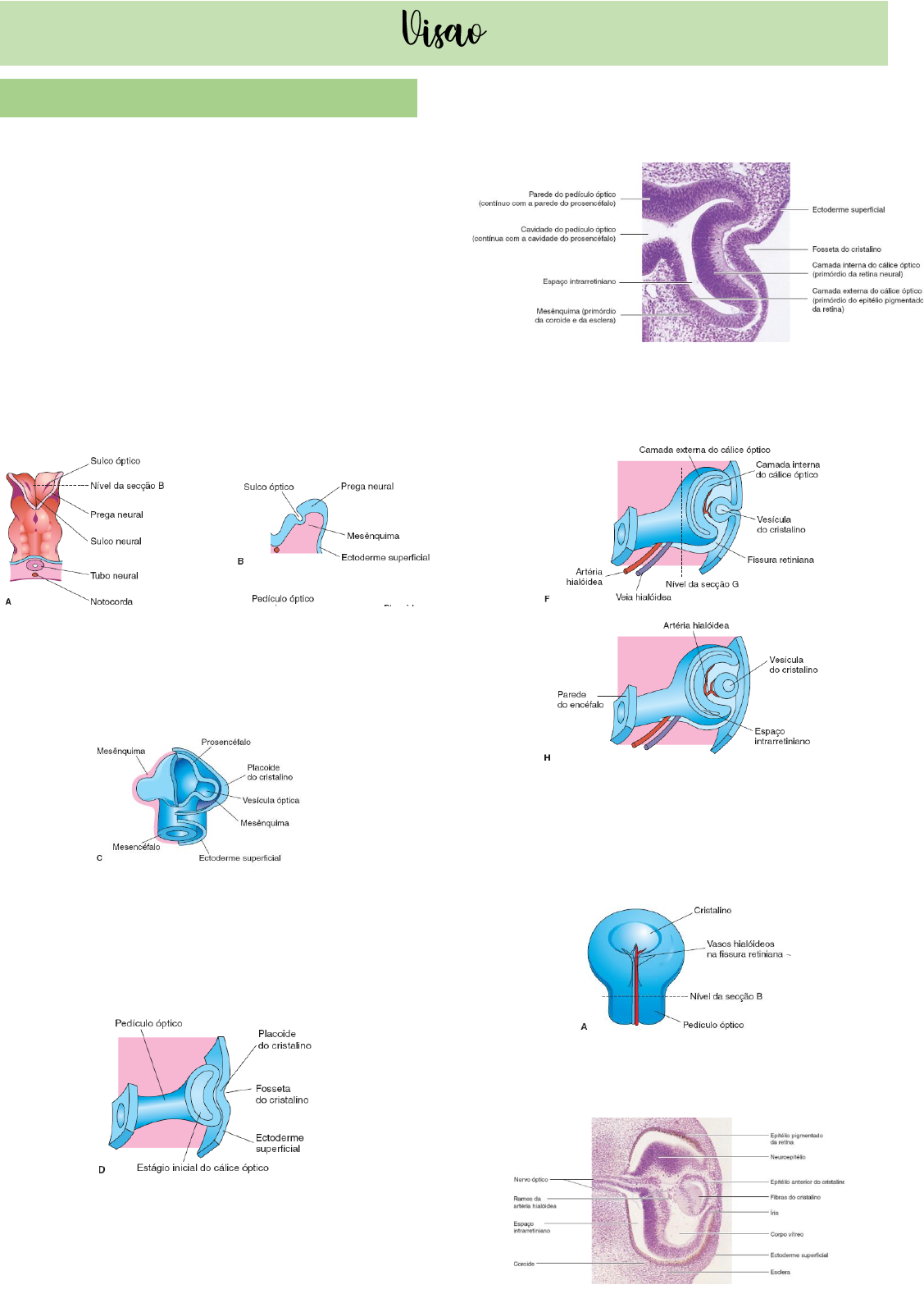 Desenvolvimento dos olhos e das estruturas relacionadas Os olhos são derivados de quatro fontes: •Da neuroectoderme do encéfalo •Da ectoderme superficial da cabeça •Da mesoderme entre a neuroectorme e ectorme superficial da cabeça •Das células da crista neural do prosencéfalo e mesencéfalo O desenvolvimento inicial do olho resulta de uma de sinais indutivos no início da quarta semana, quando as fendas ópticas (sulcos) surgem nas pregas neurais encefálicas Conforme as pregas neurais se fusionam, os sulcos ópticos invaginam para formar divertículos ocos – as vesículas ópticas – que se projetam da parede do prosencéfalo para o interior do mesênquima adjacente A formação das vesículas ópticas é induzida pelo mesênquima adjacente para o encéfalo em desenvolvimento. À medida que as vesículas ópticas crescem, suas conexões com o prosencéfalo se estreitam para formar os pedículos ópticos Um sinal indutivo passa das vesículas ópticas e estimula a ectoderme superficial a se espessar e formar os placoides dos cristalinos, os primórdios dos cristalinos Os placoides dos cristalinos invaginam e penetram profundamente na ectoderme superficial, formando as fossetas dos cristalinos As bordas das fossetas se aproximam e se fusionam para formar as vesículas do cristalino esféricas, que logo perdem suas conexões com a ectoderme superficial. À medida que as vesículas dos cristalinos se desenvolvem, as vesículas ópticas invaginam-se para formar os cálices ópticos de parede dupla, com os cristalinos sendo englobados pela borda dos cálices ópticos As vesículas dos cristalinos penetraram nas cavidades dos cálices ópticos Sulcos lineares – fissuras retinianas (fissuras ópticas) – se desenvolvem na superfície ventral dos cálices ópticos e ao longo dos pedículos ópticos As fissuras retinianas contêm o mesênquima vascular a partir do qual os vasos sanguíneos hialóideos se desenvolvem. A artéria hialóidea, ramo da artéria oftálmica, irriga a camada interna do cálice óptico, a vesícula do cristalino e o mesênquima do cálice óptico. Conforme as bordas da fissura retiniana se fusionam, os vasos hialóideos são inseridos no nervo óptico primitivo As partes distais dos vasos hialóideos eventualmente se degeneram, porém as partes proximais persistem, como a artéria central e a veia da retina Desenvolvimento da retina A retina se desenvolve a partir das paredes dos cálices ópticos, uma evaginação do prosencéfalo As paredes do cálice se desenvolvem em duas camadas da retina: a camada delgada externa, que se transforma na camada pigmentada da retina, e a camada espessa, que se diferencia em retina neural. As duas camadas da retina estão separadas por um espaço intrarretiniano, derivado da cavidade do cálice óptico. Esse espaço desaparece gradualmente à medida que as duas camadas da retina se fusionam. Como o cálice óptico é uma evaginação do prosencéfalo, suas camadas são contínuas com a parede do encéfalo Sob a influência do cristalino em desenvolvimento, a camada interna do cálice óptico prolifera e forma um neuroepitélio espesso. As células dessa camada se diferenciam em retina neural, a região sensível à luz da retina Essa região contém fotorreceptores (bastonetes e cones) e corpos celulares de neurônios (células bipolares e ganglionares). Como a vesícula óptica invagina à medida que se forma o cálice óptico, a retina neural fica “invertida”, as partes sensíveis à luz das células fotorreceptoras ficam adjacentes ao epitélio pigmentado da retina. A luz deve atravessar a parte mais espessa da retina antes de alcançar os fotorreceptores, como a retina, em geral, é fina e transparente, não forma uma barreira à luz. Os axônios das células ganglionares da camada superficial da retina neural crescem na região proximal à parede do pedículo óptico do encéfalo A cavidade do pedículo é gradualmente obliterada à medida que os axônios das células ganglionares formam o nervo óptico A mielinização das fibras do nervo óptico começa no final do período fetal e é concluída na 10ª semana após o nascimento. Desenvolvimento da coroide e da esclera O mesênquima que reveste o cálice óptico se diferencia em uma camada vascular interna – a coroide – e em uma camada fibrosa externa – a esclera. Na borda do cálice óptico, a coroide forma os núcleos dos processos ciliares, constituídos principalmente de capilares sustentados por um tecido conjuntivo delicado. Desenvolvimento do corpo ciliar O corpo ciliar é uma extensão cuneiforme da coroide. Sua superfície medial se projeta em direção ao cristalino, formando os processos ciliares. A porção pigmentada do epitélio ciliar é derivada da camada externa do cálice óptico, que está contínua com o epitélio pigmentado da retina. A retina não visual é o epitélio ciliar não pigmentado, que representa um prolongamento anterior da retina neural, no qual nenhum elemento neural se desenvolve. O músculo ciliar liso é responsável pelo foco do cristalino e pelo tecido conjuntivo no corpo ciliar. Desenvolve-se a partir do mesênquima da borda do cálice óptico, entre a condensação escleral anterior e o epitélio pigmentado ciliar. Desenvolvimento da íris A íris se desenvolve a partir da borda do cálice óptico, que cresce para dentro e cobre parcialmente o cristalino. O epitélio da íris representa ambas as camadas do cálice óptico; está contínuo com o epitélio de camada dupla do corpo ciliar, com o epitélio pigmentado retiniano e com a retina neural. O arcabouço (estroma) do tecido conjuntivo da íris é derivado das células da crista neural que migram para a íris. Os músculos dilatador da pupila e esfíncter da pupila da íris são derivados da neuroectoderme do cálice óptico. Esses músculos lisos resultam da transformação das células epiteliais em células musculares lisas. Desenvolvimento do cristalin