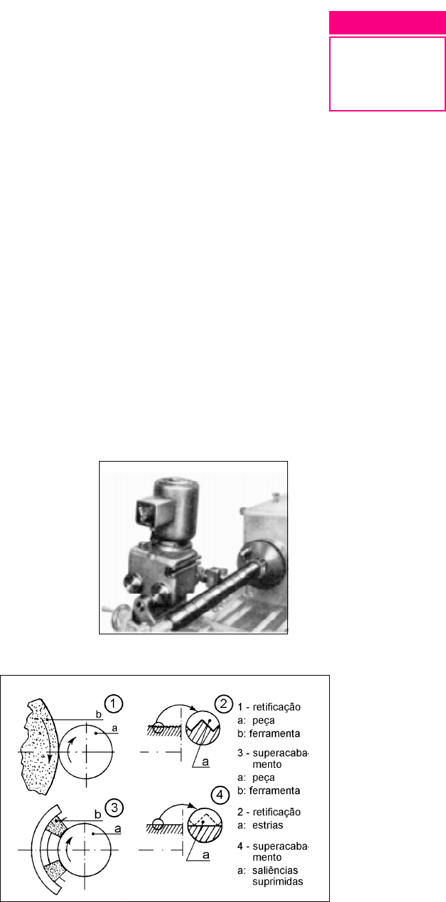 60 A U L A Na aula anterior, você viu que, em muitos casos, as superfícies de peças devem ser praticamente perfeitas, com exatidão dimensional e acabamento superficial excelente. Portanto, essas peças necessi- tam de acabamento especial que pode ser obtido por diversos processos. Desses processos, você estudou brunimento, polimento e lapidação. Nesta aula, veremos os processos de superacabamento e rodagem. Superacabamento O superacabamento é uma operação feita em peças, cuja superfície apresenta defeitos, decor- rentes do processo de retificação que precede a operação. Alguns defeitos têm a forma de riscos e estrias e são causados pelos grãos abrasivos. Outros defeitos, como a formação de facetas, são devidos aos efeitos de vibrações. A operação de supera- cabamento corrige esses defeitos. Com ela, o coeficiente de atrito entre as superfícies é diminuído e a resistência da superfície ao des- gaste é aumentada. Ainda, a ação das pedras abrasivas retira a for- mação de facetas. As facetas são microfaces que se formam na superfície da peça durante a retificação. Elas são provocadas pelo desbalan- ceamento do rebolo ou por folgas no eixo. Superacabamento e rodagem dispositivo para superacabamento 60 A U L A Nossa aula dispositivo para superacabamento 60 A U L A Rebolo muito duro ou com granulação muito fina tende a ficar empastado e por isso favorece a ocorrência do defeito. Finalmente, o mau estado do mecanismo de movimentação da mesa pode também causar o mesmo defeito. Veja figura ao lado. A superfície superacabada deve ficar bem lisa e com aparência de um espelho fosco. A diferença entre superacabamento e retificação está no movi- mento de corte do abrasivo. Na retificação, o movimento de corte é dado pelo rebolo, o qual tem movimento de rotação e gira a uma velocidade de corte de aproximadamente 1800 m/min. Na operação de superacabamento, o movimento de corte é efetuado pela pedra ou bloco abrasivo. A pedra abrasiva trabalha com movimentos retilíneos de vaivém, numa cadência de 1.000 a 2.000 golpes por minuto e amplitude de 1 a 5 mm. Enquanto a pedra abrasiva realiza esses movimentos, a peça gira com velocidade de corte de aproximadamente 20 m/min. A espessura do sobremetal retirado no superacabamento varia de 0,001 a 0,01 e depende dos seguintes fatores: · pressão exercida sobre a pedra abrasiva em kgf/cm2 ou Pa; · estado da superfície ou grau de rugosidade, antes da operação; · natureza da pedra abasiva (grão e dureza). Recordar é aprenderRecordar é aprenderRecordar é aprenderRecordar é aprenderRecordar é aprender 1 kgf/cm2 = 100kPa Na operação de superacabamento, a pedra abrasiva é colocada em posição sobre a peça, com pressão constante de 1 a 5 kgf/cm2 (100 a 500kPa), depois de ter sido perfilada por uma ferrramenta diamantada. Em seguida inicia-se a operação, com a peça girando a uma velocidade de corte de 20 m/min e a pedra abrasiva vibrando. Essa vibração dá-se ao longo da geratriz do cilindro que está sendo submetido ao superacabamento. A operação de superacabmento pode também ocorrer com a peça sendo deslocada ao longo da pedra abrasiva, tal como na fabricação de rolos para rolamentos. Durante a operação, tanto a peça quanto a pedra abrasiva devem ser constantemente lubrificadas com uma mistura de 80% de querosene e 20% de óleo. Também podem ser usados fluidos de corte, encontrados no comércio. Quando a rugosidade chega a níveis satisfatórios, aumenta a superfície de contato entre a pedra abrasiva e a peça. Isto faz com que a pressão real em cada ponto de contato da pedra abrasiva com a peça seja insuficiente para retirar material. Neste momento termina a operação. A operação do superacabamento é indicada nos seguintes casos: · nos ajustes deslizantes ou giratórios de peças de alta precisão; · na melhoria de tolerância de forma; · na diminuição da rugosidade. facetas 60 A U L APara dar superacabamento em séries pequenas de peças, pode-se usar um dispositivo como o da figura ao lado, que pode ser adaptado a um torno. O superacabamento de superfícies cilíndricas exter- nas entre pontas é feito em uma máquina semelhante à máquina de retificação entre pontas. O suporte dos rebolos de retificar é substituído pelo suporte das pedras abrasivas de superacabamento. Essa máquina é utilizada no superacabamento de virabrequins, eixos de comando etc. Existem também outros tipos de máquinas de superacabamento, que são usadas para o acabamento de: · superfícies cilíndricas externas sem centro. Neste tipo de máquina, a peça é suportada e arrastada por dois cilindros. Trata-se de uma máquina usada para grandes produções, como a fabricação de rolos de rolamentos; · superfícies planas; · superfícies cilíndricas internas. A operação de superacabamento deve ser controlada antes, durante e depois: – antes, para verificar na peça a correção geométrica das superfícies a usinar a existência de sobremetal necessário, o qual deve ser geralmente entre 4 a 5 mm; – durante, para verificar o desenvolvimento normal da ação do abrasivo, que deve ter a duração regulada segundo os limites de tolerância determinados; – depois, para verificar na peça as características obtidas. As características da peça são : · geométricas, que dizem respeito às dimensões e tolerâncias de forma; · físicas, relativas principalmente à rugosidade da superfície; · químicas, que se referem à constituição da superfí- cie do metal. dispositivo para superacabamento cilíndrico máquina de superacabamento sem centro medição do estado da superfície 60 A U L A RodagemRodagemRodagemRodagemRodagem A operação de rodagem permite melhorar a exatidão dimensional, o acaba- mento superficial e as tolerâncias de forma e posição de superfícies retificadas. Ela é muito usada em vedações de válvulas e suas sedes, acabamento dos contatos de micr