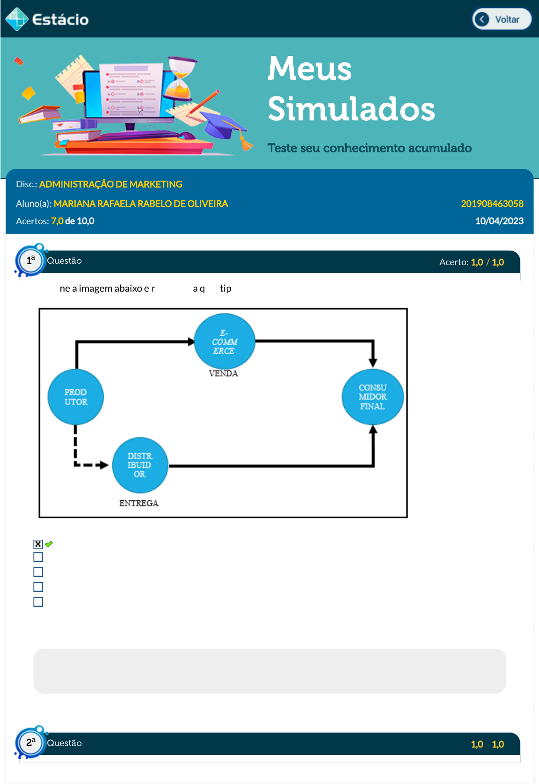 Meus Simulados Teste seu conhecimento acumulado Disc.: ADMINISTRAÇÃO DE MARKETING Aluno(a): MARIANA RAFAELA RABELO DE OLIVEIRA 201908463058 Acertos: 7,0 de 10,0 10/04/2023 Acerto: 1,0 / 1,0 Examine a imagem abaixo e responda a qual tipo de canal ela representa? Canal híbrido. Canal direto. Canal vertical longo. Canal múltiplo. Canal de nível 2. Respondido em 10/04/2023 14:48:44 Explicação: A resposta correta é: Canal híbrido. Acerto: 1,0 / 1,0 Questão1 a Questão2 a https://simulado.estacio.br/alunos/inicio.asp javascript:voltar(); Entre as decisões a serem tomadas ao arquitetar os canais do produtor, qual questão não precisa ser considerada? Tamanho do lote do produto. Quantidade de produtos perdidos. Quantidade de níveis do canal. Intensidade de distribuição desejada. Apoio de serviços. Respondido em 10/04/2023 14:49:22 Explicação: A resposta correta é: Quantidade de produtos perdidos. Acerto: 0,0 / 1,0 Os resultados dos esforços de comunicação de marketing devem sesr medidos pelas empresas. Assinale os melhores indicadores para esse �m. Indicadores de lucro da empresa. Indicadores de pessoal envolvido nas ações. Indicadores de alcance e frequência. Indicadores de mudança comportamental. Indicadores de despesas da área com anúncios e clipings. Respondido em 10/04/2023 14:57:18 Explicação: Geralmente o pro�ssional da área de Marketing é cobrado a respeito de resultados e receitas obtidas com os investimentos em comunicação. No entanto, os diretores da área de comunicação fornecem apenas dados e despesas: contagens de clippings (recortes) de jornais e revistas, número de anúncios veiculados, custos de mídia, entre outros. Ou seja, eles tentam traduzir os dados de resultados intermediários, como alcance e frequência (porcentagem do mercado-alvo exposta a uma comunicação e número de exposições), índices de recall, reconhecimento, custo por mil etc. Porém, são os indicadores de mudanças comportamentais que dirão se o esforço foi vitorioso. Depois da implementação do plano de comunicação, é necessário avaliar o impacto no público-alvo. É importante perguntar se os integrantes do público-alvo reconhecem ou se lembram da mensagem, quantas vezes a viram, quais pontos foram marcantes ou memoráveis, o que sentiram em relação à mensagem e quais as atitudes atuais em relação ao produto, empresa ou marca. Então, é necessário reunir dados comportamentais da resposta do público, quantos clientes compraram o produto, quantos gostaram e quantos falaram dele para outras pessoas. Acerto: 0,0 / 1,0 A comunicação integrada de marketing é essencial para construir e valorizar o brand equity da empresa. Existem alguns critérios para se averiguar se a comunicação integrada está realmente e�caz e e�ciente, são eles: I. Cobertura II. Contribuição III. Versatilidade IV. Custo V. Competência Questão3 a Questão4 a Assinale a alternativa que indica os itens corretos. I, III e V, apenas. II e IV, apenas. I, II, III e V, apenas. I, II, III, IV e V. I, II, III e IV, apenas. Respondido em 10/04/2023 14:57:12 Explicação: A seguir, serão apresentados seis critérios, que podem ser usados para determinar se a comunicação está realmente integrada. I. Cobertura II. Contribuição III. Versatilidade IV. Custo V. Compartilhamento VI. Complementaridade Acerto: 1,0 / 1,0 É um dos melhores modos de gerar con�ança e estreitar seu relacionamento com os seus potenciais consumidores, a começar pela oferta de conteúdos de qualidade. Essa frase se refere a qual canal de marketing digital? E-mail marketing Blog Tráfego orgânico Rede social Mídia paga Respondido em 10/04/2023 14:52:54 Explicação: A resposta correta é: Blog Acerto: 1,0 / 1,0 Com relação à existência de órgãos de regulamentação, �scalização e controle das atividades empresariais relacionadas à Ética corporativa, podemos citar que: São desnecessárias, uma vez que os departamentos de Marketing das empresas têm total consciência dos preceitos éticos corporativos. São úteis, pois auxiliam as empresas na análise do cunho ético das ações de marketing, reduzindo assim seus custos. Questão5 a Questão6 a São fundamentais para monitorar as ações empresariais no que tange à Ética, coibindo assim práticas não desejadas pela sociedade. São inúteis, pois eles não auxiliam as empresas a aumentarem seus lucros. São fundamentais, pois avalizam o teor ético de todas as campanhas de marketing lançadas, evitando assim, processos judiciais. Respondido em 10/04/2023 14:53:38 Explicação: A resposta correta é: São fundamentais para monitorar as ações empresariais no que tange à Ética, coibindo assim práticas não desejadas pela sociedade. Acerto: 0,0 / 1,0 Existem diversos tipos de custos envolvidos no processo de determinação de preço. Custos variáveis são aqueles que: Re�etem em lucro líquido positivo das transações. Oscilam em função do nível da produção. Incluem o prazo para pagamento, se houver. Variam em função da matéria-prima disponível. Representa o somatório dos custos totais da empresa. Respondido em 10/04/2023 14:54:31 Explicação: A resposta correta é: Oscilam em função do nível da produção. Acerto: 1,0 / 1,0 Os produtos podem ser classi�cados de diversas formas: pelas suas características, pela forma como são comprados, pela qualidade, entre outras. Uma dessas classi�cações são os bens de impulso. Assinale a alternativa que indica a correta de�nição de bens de impulso. Itens que o consumidor não conhece ou até evita conhecer. Itens comprados sem um planejamento prévio. Itens especí�cos que demandam bastante tempo do consumidor para conhecer seus detalhes e especi�cidades. Itens emergenciais que são comprados para suprir uma necessidade urgente e imediata. Itens comparados com seus similares ou com outros que suprem a mesma necessidade. Respondido em 10/04/2023 14:57:07 Explica