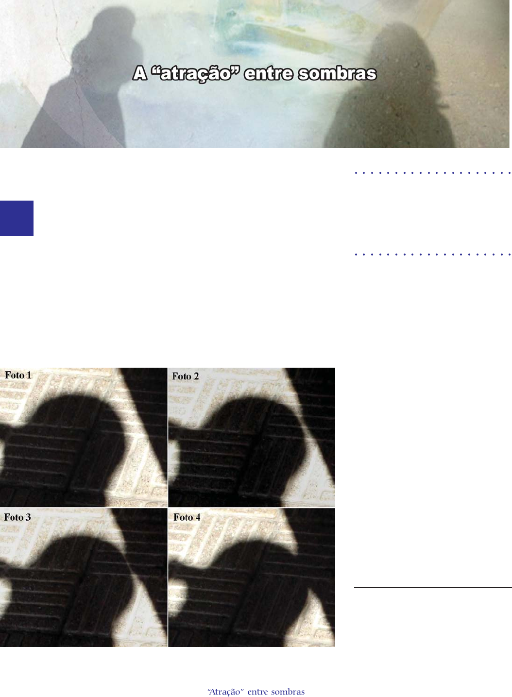 17Física na Escola, v. 8, n. 1, 2007 Um intrigante fenômeno óptico Quando a distância entre duassombras se torna muitopequena, uma delas “atrai” a outra, deformando-a! Vejamos como esse fascinante fenômeno ocorre e pode ser explicado. Na Fig. 1, uma seqüência de fotos mostra a sombra da cabeça do fotógrafo se aproxi- mando da sombra de uma parede. Observa-se que dessa aproximação resulta a deformação da sombra da parede e o prematuro preenchimento do espaço antes iluminado. Fernando Lang da Silveira E-mail: lang@if.ufrgs.br Rolando Axt Instituto de Física Universidade Federal do Rio Grande do Sul Porto Alegre, RS, Brasil Um inusitado efeito ocorre quando a distância entre duas sombras se torna muito pequena: uma das sombras se deforma, como que atraí- da pela outra, preenchendo prematuramente o espaço que as separa. Apresentamos uma explicação geométrica para esse fascinante efeito, tendo por base o fato de que as fontes luminosas são extensas, produzindo sombras com bordas indefinidas, devido à penumbra. Na Fig. 2, uma seqüência de fotos mostra a sombra da aba do alpendre “atraindo” a sombra da cabeça do fotógrafo e a deformando. Diferen- temente do caso anterior, agora é a sombra da cabeça do fotógrafo que se deforma e avança em direção à sombra do alpendre. Embora a “atração” entre as som- bras seja conhecida no teatro de som- bras,1 ela parece ser muito pouco conhecida entre os físicos. Ao demons- trarmos esse efeito para vinte e três colegas, professores universitários de física, apenas um o conhecia (lem- Figura 1. Projetada sobre a calçada, a sombra da cabeça do fotógrafo “atrai” a sombra da parede, deformando-a. ○ ○ ○ ○ ○ ○ ○ ○ ○ ○ ○ ○ ○ ○ ○ ○ ○ ○ ○ ○ ○ ○ ○ ○ ○ ○ ○ ○ ○ ○ ○ ○ ○ ○ ○ ○ ○ ○ ○ ○ “Atração” entre sombras 18 Física na Escola, v. 8, n. 1, 2007 brando da sua infância a brincadeira de ‘espichar a sombra’); ele ignorava, entretanto, a razão de tal inusitado comportamento. Quando alguns dos colegas ensaiavam espontaneamente uma explicação científica, recorriam invariavelmente à difração e à interfe- rência da luz.2 Antes de esclarecermos as razões do inusitado comportamento, esboçaremos o enunciado de uma lei de “atração” entre sombras que pode ser testada facilmente pelo leitor: Quando duas sombras se aproximam, aquela que se encontra mais próxima do objeto que lhe corresponde será “atraída” (deformada) pela outra sombra, a do objeto mais distante. Na Fig. 1, para obter a deforma- ção da sombra da parede, o fotógrafo encontrava-se mais distante da pró- pria sombra do que a parede da sua. Na Fig. 2, a situação se inverte: o chão estava mais próximo da cabeça do fotógrafo do que da aba do alpendre. Fontes luminosas extensas produzem sombras com bordas indefinidas O fato de o Sol ser uma fonte luminosa extensa que subtende, para pontos situados na Terra, um peque- no ângulo de aproximadamente 0,5°, faz com que raios luminosos prove- nientes de regiões diferentes do disco solar incidam aqui na Terra segundo direções diferentes. Por isso as sombras produzidas por obstáculos que interceptam a luz solar não têm bor- das bem definidas. As sombras só te- riam bordas bem definidas se todos os raios luminosos solares fossem para- lelos entre si (o que se assume para fazer representações simplificadas da radiação solar) e então o fascinante fenômeno da “atração” entre sombras não ocorreria. As Figs. 3a e 3b representam de ma- neira esquemática a luz emitida pelos extremos do disco solar, passando por um ponto da borda de um obstáculo e gerando uma região de penumbra (região dentro da qual a iluminação varia desde um mínimo - sombra - até a iluminação plena). Na Fig. 3a a incidência dos raios solares que atingem o plano horizon- tal onde ocorre a sombra é quase per- pendicular a este plano.3 A situação em que o Sol se encontra baixo no céu é apresentada na Fig. 3b. Comparando essa figura com a Fig. 3a, podemos observar uma maior extensão de pe- numbra sobre o plano horizontal.4 A rigor, em vez de usar um tom cinza claro para indicar o intervalo que cor- responde à penumbra nas situações apresentadas nas Figs. 3a e 3b, deve- ríamos preencher esse intervalo com uma variação contínua entre o cinza escuro (sombra) e o branco (ilumina- ção plena), ratificando a inexistência de bordas não definidas, como indicado na legenda dessas figuras. A Fig. 4 representa, em uma escala conveniente, o aumento da ilumina- ção solar, calculada sobre o plano onde é projetada a sombra, a partir do inte- Figura 2. Projetada sobre a calçada a sombra da aba do alpendre “atrai” a sombra da cabeça do fotógrafo, deformando-a. Figura 3. A luz solar que se origina em regiões diferentes do disco solar produz sombras com bordas não definidas (penumbra). “Atração” entre sombras 19Física na Escola, v. 8, n. 1, 2007 rior desta até a região de iluminação plena, em função da posição sobre uma reta neste plano, tal como esque- matizado na Fig. 3. Entre as regiões de sombra e de iluminação plena, existe a penumbra, onde a iluminação varia proporcionalmente à área da parte do disco solar não encoberta pelo obstáculo. Abaixo do eixo horizontal das posições, na Fig. 4, representamos um obstáculo (indicado por um retân- gulo), juntamente com as partes por este encobertas, ou não, do disco solar, correspondente às seguintes cinco posi- ções específicas do gráfico apresentado: o disco solar totalmente encoberto (sombra), três posições distintas de Sol parcialmente encoberto (penumbra) e ainda o disco solar totalmente exposto (iluminação plena). A intersecção das regiões de penumbra produz a “atração” entre as sombras A Fig. 5 representa dois obstáculos próximos um do outro e posicionados a diferentes distâncias do plano que contém as suas 