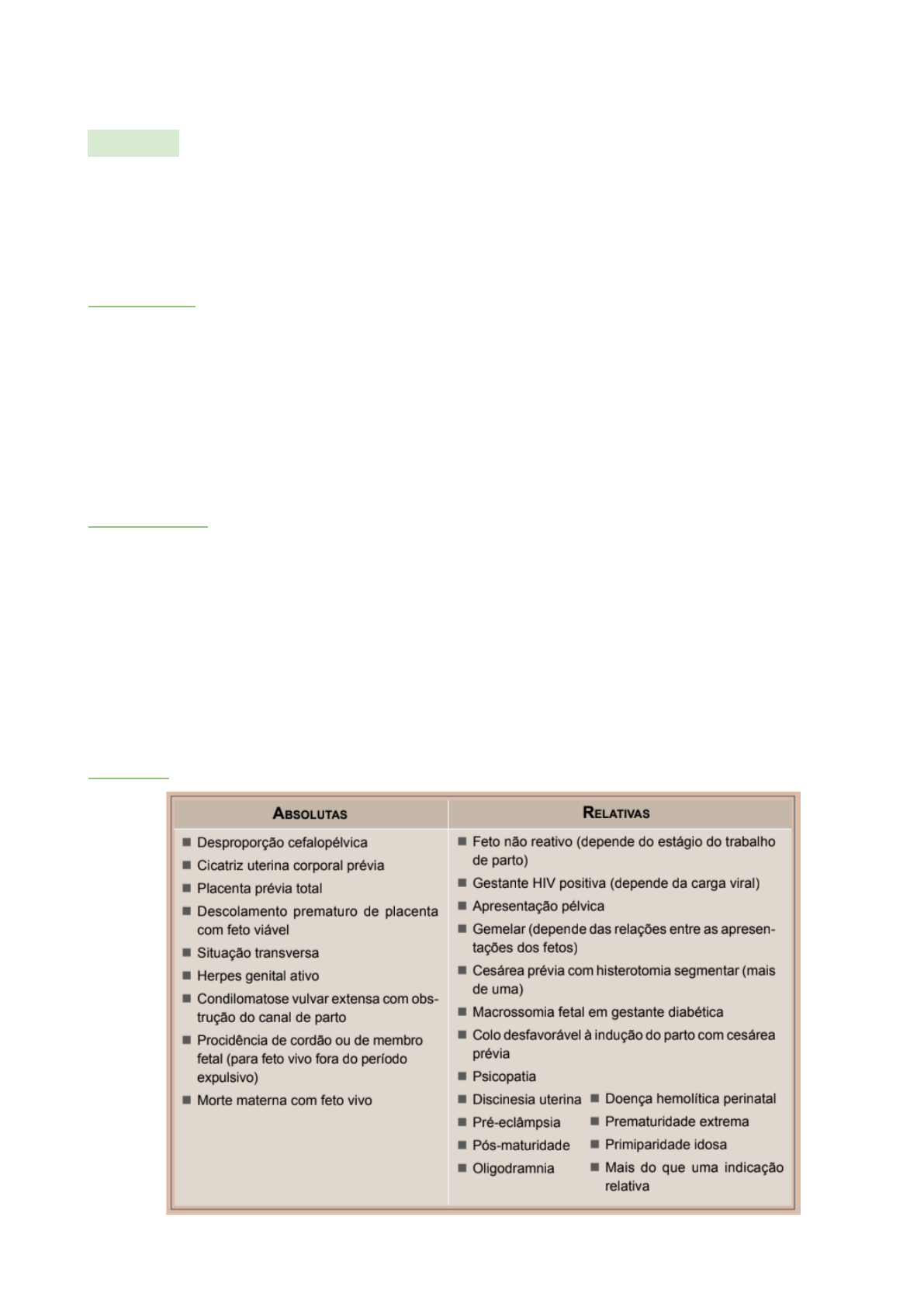 CESARIANA, FÓRCEPS E VÁCUO EXTRATOR Thalita Nóbrega Alvarenga CESARIANA O parto cesáreo é o ato cirúrgico que consiste na abertura da parede abdominal (laparotomia) e da parede uterina (histerostomia) para extração do feto desenvolvido na cavidade uterina. Epidemiologia: ➔ Uma das mais antigas cirurgias descritas na história da medicina ➔ Cirurgia mais realizada na mulher em todo mundo, com grande aumento na década de 60. ➔ O consenso sobre a taxa ideal de cesariana pela WHO é de 15% ◆ Brasil: tendência à estabilização, atualmente temos uma taxa > 50% (região sudeste e sul são as com maior taxa) Fatores de risco: ➔ Indução de parto: principalmente em nulíparas com colo uterino desfavorável (Bishop > ou = 6 → avalia parâmetros para ver se o colo é favorável ou desfavorável) ➔ Oligoâmnio: maior risco de compressões do cordão umbilical ➔ Líquido amniótico meconiado: principalmente mecônio espesso (3 ou 4+/4+) ➔ Idade materna avançada: risco maior de doenças crônicas e patologias obstétricas ➔ Obesidade: maior risco para patologias obstétricas. Indicações: PROVA: Indicações absolutas → desproporção cefalopélvica, apresentação córmica, placenta prévia centro-total e apresentação cefálica defletida de 3 grau com variação mento-posterior. Tipos de cesarianas 1. Cesariana de emergência: realizada durante o TP a. Sofrimento fetal agudo: monitorização intraparto (CTG) b. Prolapso de cordão: após a amniotomia → bolsa rota que vem com cordão junto c. Iminência de rotura uterina: trabalho de parto em cesárea prévia d. Distócia funcional não corrigível (partograma) e. Síndromes hemorrágicas na vigência de trabalho de parto → descolamento de placenta e placenta prévia. 2. Cesariana eletiva: realizada fora do trabalho de parto a. causa feto-anexiais: malformações, apresentações anômalas, gestações múltiplas, placenta prévia, macrossomia b. Causas maternas: doenças crônicas ou obstétricas, cesáreas prévias (a partir da 2 cesária, as próximas necessariamente são cesáreas) c. Medicina defensiva: cesariana a pedido Técnica cirúrgica 1. Pré operatório: a. Maturidade pulmonar: recomenda-se o uso de corticoide para maturidade pulmonar para as cesarianas eletivas que precedem 39 semanas de gestação. b. Antibioticoterapia profilática: toda paciente a ser submetida a cesariana deverá receber ATB profilático (Cefazolina 1-2g) peri-parto. Deve ser realizada antes de iniciar a cirurgia → reduz endometrite pós parto, morbidade infecciosa total e não afeta o feto. c. Cateter vesical de demora: não é necessário 2. Questões operatórias: a. Anestesia: ■ Epidural → mais comum ■ Raquianestesia → EC: cefaléia pós punção; hipotensão arterial; b. Incisão da pele: ■ A incisão mediana é em casos graves, onde precisamos realizar o parto muito rápido → eclâmpsia, por exemplo. ■ Incisão transversa (Pfannenstiel ou Joel Cohen) → Nível de evidência B: mais utilizada, menor dor pós operatória, maior firmeza da cicatriz cirúrgica e melhor resultado cosmético. ■ Joel Cohen x Pfannenstiel → nível de evidência A: ★ Joel Cohen: incisão não arqueada, 3cm acima da sínfise púbica. Tem menor tempo operatório e menor morbidade febril pós-operatória. ★ Pfannenstiel: incisão transversa suprapúbica (2cm acima da sínfise púbica), levemente arciforme com 10-12cm. c. Subcutâneo e aponeurose: ■ Tecido subcutâneo: Não existe uma técnica correta. Sugestão: dissecção romba com os dedos (menor tempo operatório e menor lesão de vasos) ■ Aponeurose: Não existe uma técnica correta. Sugestão: incisão mediana com bisturi e extensão romba com os dedos (técnica de Joel-Cohen) d. Retoabdominais e peritônio: ■ Retoabdominais: Não existe uma técnica correta. Sugestão: separação romba na maioria dos casos evitando a secção dos mesmos. ■ Abertura do peritônio: Não existe uma técnica correta. Sugestão: abertura utilizando os dedos minimiza o risco de lesão de intestino ou outros órgãos, principalmente em casos de aderências e. Histerotomia: O tipo de incisão depende da posição do feto, localização da placenta, presença de miomas, formação do segmento. ■ Segmento corporal: indicada em fetos prematuros (< 30 semanas). ■ Corporal: indicada em casos de tumores prévios no segmento inferior e placentas prévias. ■ Segmentar: padrão f. Extração fetal: ■ Fetos de apresentação cefálica: extração manual ou por alavanca (preferível em cesáreas eletivas) ■ Fetos de apresentação pélvica: extração podálica semelhante ao parto vaginal ■ Fetos em apresentação córmica: é preferível a extração podálica, nos casos de cefálicas altas, pode-se fazer a versão interna com extração podálica. ■ Clampagem do cordão: pode-se aguardar a pulsação espontânea nos casos de fotos vigorosos e de termo. g. Remoção da placenta: ■ A extração manual tem maior risco de endometrite. ■ A remoção da placenta deve ser efetuada pela expressão do fundo uterino (Manobra de Credé) acompanhada de delicada tração do cordão umbilical, que minimiza os riscos de infecção. h. Fechamento dos peritônios: ■ Não fechamento: Menor tempo operatório, menos febre no pós operatório, menor permanência hospitalar, menor necessidade de analgésicos. ■ Se optar pelo fechamento: utilizar chuleio contínuo não ancorado. i. Fechamento retoabdominal, aponeurose, subcutâneo e pele: ■ Retoabdominais: reaproximação é desnecessária e aumenta a dor pós operatória. Pode-se aproximar com pontos em U. ■ Aponeurose: sutura contínua não ancorada com fios de absorção lenta evitando muita tensão. ■ Subcutâneo: aproximação com pontos separados se camada de gordura é maior que 2cm (menor risco de deiscência) ■ Pele: não há recomendações, mas geralmente intradérmico pela estética. 3. Pós parto: aplicar ocitocina → c