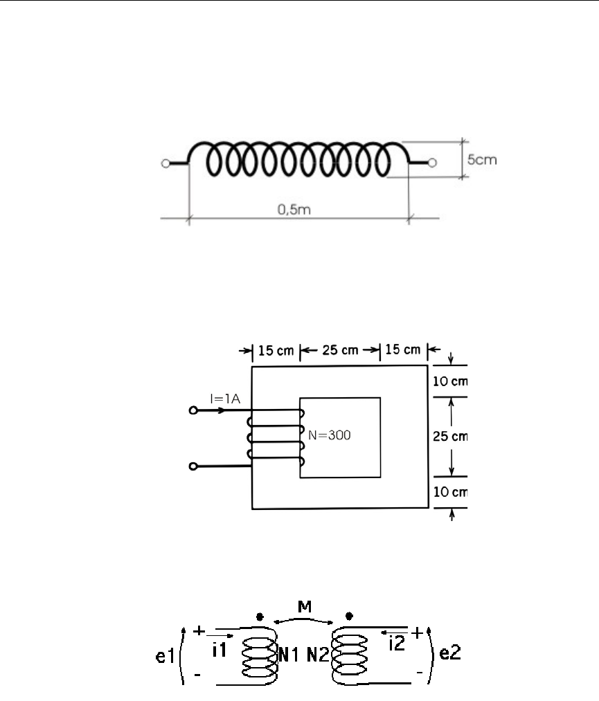 Lista de Exercícios / EEL205 - Circuitos Magnéticos Prof. Isaías Lima 13/11/2015 1) A bobina mostrada na figura abaixo possui 250 espiras. Como o comprimento é muito maior que o diâmetro, o campo magnético no interior da bobina pode ser considerado uniforme. Determine a intensidade de campo magnético e a densidade de fluxo no interior da bobina, assim como a indutância própria. A corrente é igual a 10A. 2) A espessura do núcleo na figura abaixo é igual a 10cm. A permeabilidade relativa do material é igual a 2500, o número de espiras igual a 300 e a corrente que alimenta o circuito igual a 1A. Determine o fluxo magnético no núcleo e a densidade de fluxo magnético nas “pernas” do núcleo. 3) Determinar o circuito equivalente para o circuito abaixo. 4) No circuito magnético a seguir, o núcleo é fabricado com chapas de aço- silício e possui seção transversal quadrada. As correntes nos enrolamentos são i1=0,33A e i2= 0,6A. Determine a densidade de fluxo no raio médio do núcleo. Considerando essa densidade de fluxo, determine o fluxo no núcleo. 5) Considerando o toroide mostrado na figura abaixo (fabricado em aço- silício). Determine: a) A corrente necessária para produzir uma densidade de fluxo igual a 1,2T no raio médio do toroide, sabendo que μr=8000. Qual o fluxo no núcleo? b) Se um entreferro igual a 2mm é inserido no toroide, determine o valor da corrente necessária para manter a densidade de fluxo igual a 1,2T. 6) No circuito abaixo, a indutância da bobina é alterada com a inserção do núcleo ferromagnético cilíndrico (aço-carbono). Determine a indutância antes e após a inserção do núcleo, e a corrente que circula na bobina. A tensão é dada por v(t)=15cos(200t) e a bobina tem 250 espiras. Considere o diâmetro do núcleo o mesmo da bobina. 7) Seja o circuito magnético mostrado na figura abaixo referente a um indutor, com núcleo de ferro, no qual foi aberto em gap de ar. Considere: n=784 espiras; lnúcleo=98 cm; lgap=0,19 cm; Anúcleo=36 cm2; Agap=36 cm2;µr=12860. Considerando que a densidade de fluxo no ferro e entreferro é B =1,56 T. Determine: a) As grandezas magnéticas e o circuito elétrico equivalente anotando os parâmetros análogos; b) A corrente que circula no enrolamento da bobina do indutor; c) O fluxo concatenado com bobina λ e a indutância da bobina; d) O valor percentual da relutância do ferro para relutância do entreferro 8) A figura a seguir representa o núcleo de ferro de um transformador hipotético (adaptado). Possui dois caminhos paralelos para o fluxo magnético. Possui também dois gaps de ar para linearizar o dispositivo. Considere que o material do núcleo tem permeabilidade magnética infinita e que são desprezíveis os fluxos de dispersão e o espraimento nos entreferros. Dados: N =1786 espiras, i = 0,8 A, g1=0,16 pol, g2 =0,12 pol, espessura=10 pol. Considere: 1pol=2,54 cm. a) Calcular as grandezas magnéticas: relutâncias nos gaps, a força magneto motriz e fluxo magnético em cada perna do circuito magnético. b) Desenhar o circuito magnético com as grandezas calculadas no item a); c) Calcular a densidade de fluxo em cada uma das pernas do circuito magnético. 9) A partir dos dados a seguir e das curvas de saturação dos materiais ferromagnéticos, complete a tabela. MATERIAL B[T] Aço-Carbono 1,15 Aço-Silício 1,15 Aço 1,00 Ferro 0,35 MATERIAL H[AE/m] [H/m] R ferro aço-silício aço aço-carbono 10) Descreva sucintamente as grandezas: H e , Re e Pe. Qual a relação entre Re e indutância? Qual a unidade de grandeza de Re e Pe ?