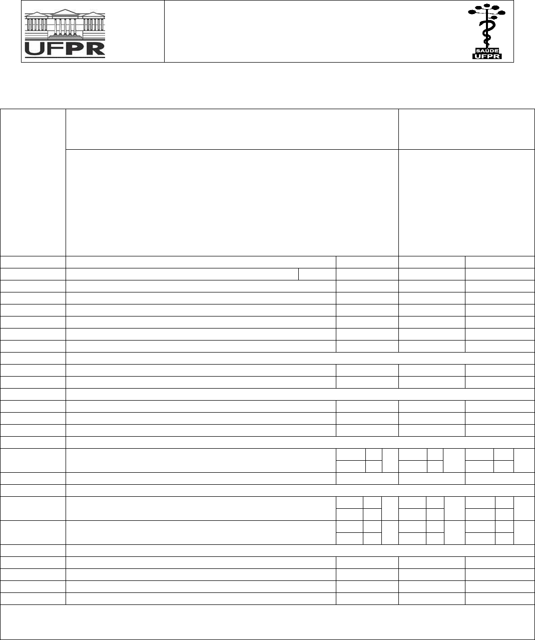 MEDIDA DE INDEPENDÊNCIA FUNCIONAL N Í V E I S Independente 7 – Independência completa (Com segurança e tempo normal) 6 – Independência modificada (Ajuda técnica) SEM ASSISTÊNCIA Dependência Modificada 5 – Supervisão 4 – Assistência Mínima (Sujeito ≥ 75%) 3 – Assistência Moderada (Sujeito ≥ 50%) Dependência Completa 2 – Assistência Máxima (Sujeito ≥ 25%) 1 – Assistência Total (Sujeito ≥ 10%) COM ASSISTÊNCIA Avaliação Atividades 1° Av. 2° Av. 3° Av. Autocuidado Data / / / / / / A. Alimentação B. Higiene pessoal: apresentação e aparência. C. Banho: lavar o corpo D. Vestir: metade superior do corpo E. Vestir: metade inferior do corpo F. Utilização do vaso sanitário Controle dos esfíncteres G. Controle da urina: frequência de incontinência H. Controle das fezes Mobilidade I. Transferências: leito, cadeira, cadeira de rodas J. Transferências: vaso sanitário K. Transferências: banheira ou chuveiro Locomoção L. Marcha/Cadeira de rodas M M M CR CR CR M. Escadas Comunicação N. Compreensão A A A VI VI VI O. Expressão V V V NV NV NV Conhecimento Social P. Interação Social Q. Resolução de Problemas R. Memória Total OBS: Não deixe nenhum item em branco, se não for possível testar marque 1. Medida de Independência Funcional (MIF). (copyright 1987, Fundação Nacional de Pesquisa – Universidade Estadual de New York). Abreviações: M=marcha, CR= cadeira de rodas, A= Auditiva, VI= Visual, V= Verbal e NV= Não Verbal. MINISTÉRIO DA EDUCAÇÃO UNIVERSIDADE FEDERAL DO PARANÁ SETOR DE CIÊNCIAS DA SAÚDE DEPARTAMENTO DE TERAPIA OCUPACIONAL