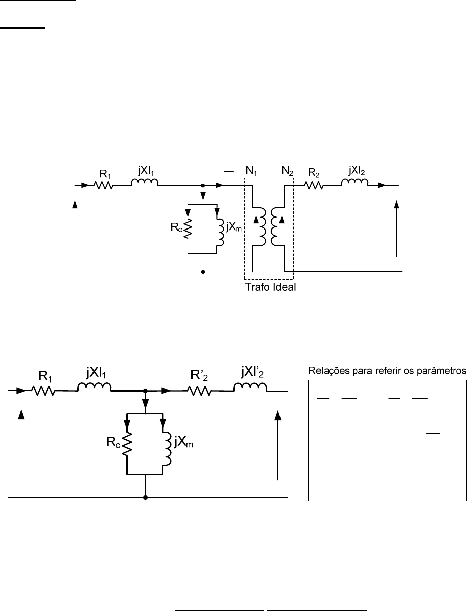 1 UNIVERSIDADE ESTADUAL PAULISTA “JULIO DE MESQUITA F ILHO” FACULDADE DE ENGENHARIA - DEPARTAMENTO DE ENGENHARI A ELÉTRICA ELETROTÉCNICA Experiência 05: Ensaios em transformadores monofásicos Objetivo: Determinar os parâmetros do circuito elétrico equivalente de transformadores monofásicos, bem como calcular seu rendimento e sua regulação. 1.0 – Introdução O circuito elétrico equivalente de um transformador é a forma de representar o comportamento das grandezas elétricas e magnéticas tais como as perdas joule nos enrolamentos, as perdas por Histerese e Foucault, os fluxos de dispersão do primário e secundário e a reatância de magnetização. O circuito equivalente de um transformador com núcleo ferromagnético (não linear) é dado pela Figura 1. 1Iɺ 1Vɺ ' 2 2 I I k = ɺ ɺ 2Iɺ 2Vɺ cIɺ mIɺ Iϕɺ 1Eɺ 2Eɺ Figura 1 – Circuito equivalente do transformador monofásico – Modelo T. O circuito equivalente da Figura 1, referido ao primário (N1 espiras), tem a seguinte configuração: 1Iɺ 1Vɺ ' 2Iɺ ' 2Vɺ cIɺ mIɺ Iϕɺ ' 2 2V kV=ɺ ɺ ' 2 2 2R k R= ' 2 2 2Xl k Xl= 1 1 2 1 2 2 1 2 21 1 1 1 2 2 2 2 ; ; ; V N I N k k V N I N Z V Z I V Z I k Z = = = = = = = ' 2 2 I I k = ɺ ɺ Figura 2 – Circuito equivalente do transformador monofásico referido ao primário. 2.0 – Ensaios: Os parâmetros do circuito equivalente podem ser obtidos mediante a execução dos seguintes ensaios: 2.1 – Ensaio a vazio ou de circuito aberto – Tensão nominal No ensaio a vazio, aplica-se tensão nominal no lado da baixa tensão. Ou seja, nesse caso, o lado de baixa tensão é o primário do transformador. No secundário do transformador não há 2 circulação de corrente. A corrente do primário tem valor muito baixo sendo responsável apenas pela magnetização do núcleo do transformador. Dessa maneira, podemos desprezar as perdas joule dos enrolamentos e as dispersões de fluxos, sendo somente consideradas as perdas no núcleo. Neste ensaio são medidas as seguintes grandezas: Vo – Tensão nominal aplicada (V); Po – Potência consumida – perdas no núcleo (W); Io – Corrente a vazio (A). oIɺ oVɺ cIɺ mIɺ Iϕɺ Figura 3 – Alimentação pela BT com AT em aberto. A partir das grandezas medidas são calculados os seguintes valores: 2 0 0 c V R P = ; 0 0 c P I V = ; 2 20m cI I I= − ; m m I V X 0= Dessa forma, obtêm-se: Rc [Ω] e Xm [Ω] referidos à baixa tensão. 2.2 – Ensaio de Curto-Circuito – Corrente nominal Neste ensaio, são colocados em curto-circuito os terminais da baixa tensão. A tensão aplicada no primário que, agora, é o lado de alta tensão (AT), deve ser de valor tal que circule corrente nominal na baixa tensão. Como a tensão aplicada no primário é muito baixa, as perdas no núcleo e a reatância de magnetização são desprezadas. Portanto, o circuito da Figura 1 pode ser aproximado por: ccIɺ ccVɺ Figura 4 – Alimentação pela AT com BT em curto-circuito. Neste ensaio, são anotados os seguintes valores: Vcc – tensão aplicada na AT para circular Inominal na Baixa tensão (V); Icc – Inominal (A); Pcc – Potência consumida – perdas no cobre (W). A partir dessas grandezas medidas, são calculados: 1 cc cc eq cc V Z Z I = = ; 1 2 cc cc eq cc P R R I = = ; 2 21 1 1cc eq eq eqX X Z R= = − Mas, por outro lado, tem-se: ( ) ( )' '1 1 2 1 2eqZ R R j Xl Xl= + + + 3 sendo: '1 1 2eqR R R= + ; '1 1 2eqX Xl Xl= + Serão feitas as seguintes aproximações: ' 1 2 2 ccRR R= = '1 2 2 ccXXl Xl= = Observar que tais parâmetros são referidos à AT. 3.0 – Rendimento e Regulação Os rendimentos dos transformadores diferem dos 100% desejáveis devido às perdas que ocorrem no seu interior, as quais são subdivididas em perdas no ferro e perdas nos enrolamentos. Considerando a existência dessas perdas, tem-se, para os transformadores, uma diferença entre a potência de entrada P1 e de saída P2 a qual é denominado de rendimento. A regulação de tensão de um transformador é uma grandeza que mede a variação da tensão em seus terminais devido à passagem do regime a vazio para o regime em carga. 3.1 – Rendimento A relação entre a potência de entrada P1 (fonte) e a de saída P2 (carga) define o rendimento do transformador, ou seja: 1 2 P P=η Ou: ( ) 100% 1 2 ⋅= P Pη Como o rendimento dos transformadores pode chegar a 99% e a diferença entre as potências é muito pequena, não é possível simplesmente medir as duas potências. Para contornar esse problema, tem-se: ccPPPP ++= 021 onde: 2222 cosϕ⋅⋅= IVP Dessa forma, o rendimento pode ser calculado como: ( ) 2 2 2 2 2 0 2 2 2 0 cos % 100 100 coscc cc P V I P P P V I P P ϕη ϕ = ⋅ = ⋅ + + + + sendo: Po e Pcc obtidos dos ensaios a vazio e em curto-circuito. 3.2 - Regulação de tensão Mede a variação da tensão nos terminais do transformador devido à passagem do regime a vazio para o regime em carga. Com o transformador a vazio, no secundário tem-se a tensão ou fem induzida E2, que passa para um valor V2 ao se ligar uma carga. Se a regulação é boa, esta variação será pequena e vice-versa. A variação de tensão (∆V = E2 – V2) depende da carga que se coloca no secundário e pode ser: positiva, negativa ou nula. O valor da variação é influenciado por I2 e cosϕ2. Em geral, a regulação dos transformadores é definida para valor nominal da corrente e fator de potência da carga aproximadamente unitário. A regulação é dada relativamente a V2 e sua expressão, em porcentagem, é: ( ) 2 2 20 2 2 2 % 100 100 :n n E V V V reg sendo V V − −= ⋅ = ⋅ V20: Tensão a vazio V2n: Tensão sob carga nominal 4 4.0 – Parte prática: Transformador nas relações 110/220 V e 220/220 V 4.1 – Ensaio a vazio a) Anotar os dados de placa do transformador; b) Montar o circuito da figura abaixo; c) Conexões: 110/220 V; d) Alimentar o transformador pela baixa tensão com Vnominal; e) Medir: V0; I0; P0. 4.2 – Ensaio em curto-circuito a) Monte o circuito da figu