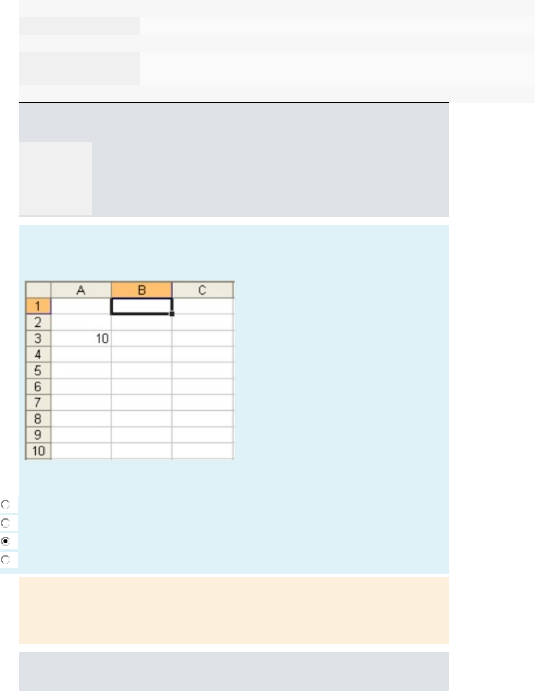 Iniciado em terça, 11 abr 2023, 10:15 Estado Finalizada Concluída em terça, 11 abr 2023, 10:55 Tempo empregado 40 minutos 11 segundos Avaliar 10,00 de um máximo de 10,00(100%) Parte superior do formulário Questão 1 Correto Atingiu 2,00 de 2,00 Marcar questão Texto da questão Na ilustração abaixo, qual é a célula ativa? Escolha uma opção: a. A1 b. A3 c. B1 d. Nenhuma célula está ativa. Feedback Sua resposta está correta. A resposta correta é: B1 Questão 2 Correto Atingiu 2,00 de 2,00 Marcar questão Texto da questão Observando a ilustração abaixo, assinale a alternativa correta: Escolha uma opção: a. B1 é a célula ativa b. Todas as células são ativas porque contém informação c. A célula B1 contém uma fórmula d. A célula A2 está logo abaixo da célula ativa Feedback Sua resposta está correta. A resposta correta é: B1 é a célula ativa Questão 3 Correto Atingiu 2,00 de 2,00 Marcar questão Texto da questão Qual a finalidade do botão mostrado na ilustração a seguir: Escolha uma opção: a. Mudar o alinhamento do texto. b. Apagar o conteúdo. c. Confirmar a digitação na célula. d. Inserir função. e. Mudar o formato de texto. Feedback Sua resposta está correta. A resposta correta é: Inserir função. Questão 4 Correto Atingiu 2,00 de 2,00 Marcar questão Texto da questão De acordo com a imagem e as informações a seguir selecione a correta: I. Há três planilhas no arquivo Excel chamadas Vendas, Despesas e Resultados II. É possível construir uma calculadora no Excel. III. O intervalo D3 a D13 pode ter uma fórmula de multiplicação. IV. A utilização de fórmulas automáticas irá auxiliar o cálculo de valores de forma rápida. V. A formatação da planilha não ajuda em nada. Escolha uma opção: a. Todas são verdadeiras. b. I, III e IV estão corretas. c. I, II, III e IV são corretas. d. I, II, IV e V são corretas. e. II, III e V são corretas. Feedback Sua resposta está correta. A resposta correta é: I, II, III e IV são corretas. Questão 5 Correto Atingiu 2,00 de 2,00 Marcar questão Texto da questão A seleção, na imagem a seguir, representa: Escolha uma opção: a. Um intervalo de células. b. Uma linha inteira. c. Uma única célula. d. Uma coluna inteira. e. Uma célula. Feedback Sua resposta está correta. A resposta correta é: Uma linha inteira. Parte inferior do formulário