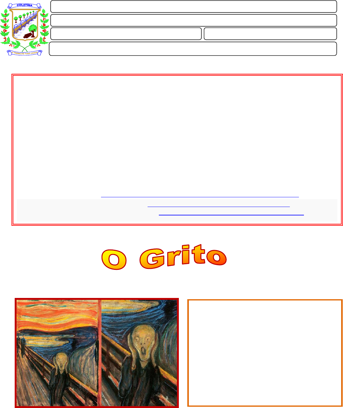 LEITURA BÁSICA “A arte também é a expressão da vida aprisionada num quadro”. Os elementos descritos estão tortos, como se reproduzindo o grito dado pela figura, como se entortando com o berro, algo que reproduza as ondas sonoras. Quase tudo está torto, menos a ponte (que é de concreto e não é “natural”) e as duas figuras que estão no canto esquerdo. A dor do grito está presente não só no personagem, mas também no fundo, o que destaca que a vida para quem sofre não é como as outras pessoas a enxergam, é dolorosa também, a paisagem fica dolorosa e talvez por essa característica do quadro é que nos identificamos tanto com ele e podemos sentir a dor e o grito dado pelo personagem. EMEF “BAIRRO COLÚMBIA” ATIVIDADES NÃO PRESENCIAIS – TURMAS: 6º ao 9º ANOS Professora: Vera Lucia Guzzo Período: 15/09 a 05/10/2020 – SEMANA 24-25-26 Disciplina: ARTE Aluno(a): _________________________________Turma:____ ORIENTAÇÕES IMPORTANTES: - As atividades sobre apreciação e releitura da obra “O Grito” serão realizadas durante as semanas 24,25,26 - Depois de concluídas as atividades, fotografar com enquadramento e foco adequado. - Lembrar de colocar o nome na própria atividade como foi orientado nas atividades anteriores. - Enviar para Luciana no contato: (27) 99503-2828 - A atividade deve ser arquivada na Pasta de Arte. Etapas de realização da atividade proposta: - Leitura do texto escrito e a imagem da obra “O Grito” e fazer também uma apreciação comparativa entre a obra original e as releituras. - Se for possível, assistir aos vídeos: 1- O Grito - Edvard Munch - https://www.youtube.com/watch?v=ym0xdsAX__0&feature=youtu.be 2- O Grito - Obra icônica do Expressionismo - https://www.youtube.com/watch?v=wiZSSPb5gKA 3- Arte para Crianças: O Grito de Edvard Munch - https://www.youtube.com/watch?v=oObEF1x618w 2- O QUE É ARTE NAIF? | Galeria Jacques Ardies - https://www.youtube.com/watch?v=DaMGT9QotRQ 3- VIDEO REPORTAGEM SOBRE Ângela Gomes - https://www.youtube.com/watch?v=_hsoI2RbL2k 4- Ouvir as músicas que homenageiam o estado do Espírito Santo: IRMÃOS ZANETTI - Homenagem ao Estado do Espírito Santo - 2012.wmv https://www.youtube.com/watch?v=ONeUJdn_zSE Ataíde e Alexandre - Viva o Capixaba - Ao Vivo Em Vitória - ES https://www.youtube.com/watch?v=dPng1NuE7us - Ouvir as músicas que homenageiam o Espírito Santo. Não é para copiar. Se você quiser e tiver possibilidade, em casa, também poderá imprimir o material e colocá-lo na Pasta de Arte. - Assistir os vídeos : O Grito é uma pintura do norueguês Edvard Munch, datada de 1893 e considerada como uma das obras mais importantes do movimento expressionista. Vemos ao fundo um céu de cores quentes, em oposição ao rio em azul (cor fria). A figura humana também está em cores frias, azul, como a cor da angústia e da dor, sem cabelo para demonstrar um estado de saúde precário. https://www.youtube.com/watch?v=ym0xdsAX__0&feature=youtu.be https://www.youtube.com/watch?v=wiZSSPb5gKA https://www.youtube.com/watch?v=oObEF1x618w https://www.youtube.com/watch?v=DaMGT9QotRQ https://www.youtube.com/watch?v=_hsoI2RbL2k https://www.youtube.com/watch?v=ONeUJdn_zSE https://www.youtube.com/watch?v=dPng1NuE7us Eis o relato de Munch: “Eu estava a passear cá fora com dois amigos e o sol começava a pôr-se. De repente o céu ficou vermelho, cor de sangue. Eu parei, sentia-me exausto e apoiei-me a uma cerca, havia sangue e línguas de fogo por cima do fiorde azul-escuro e da cidade. Os meus amigos continuaram a andar e eu ali fiquei, em pé, a tremer de medo e senti um grupo infindável a atravessar a Natureza”. É bom saber: O Expressionismo é a arte do instinto, trata-se de uma pintura dramática, subjetiva, “expressando” sentimentos humanos. Utilizando cores irreais, dá forma plástica ao amor, ao ciúme, ao medo, à solidão, à miséria humana. Deforma-se a figura, para ressaltar o sentimento. Características da pintura expressionista - Deformação da imagem visual e cores resplandecentes, vibrantes, fundidas ou separadas. - O pintor recusa o aprendizado técnico e pinta conforme as exigências de sua sensibilidade. ... - Preferência pelo patético, trágico e sombrio. Semana 24 Preencha as lacunas abaixo de acordo com o texto escrito e a imagem da obra O Grito. TIRE FOTO E ENCAMINHE PARA LUCIANA, NO GRUPO ESPECÍFICO DE ARTE. 1-O Grito é uma pintura do norueguês____________________ datada de_________ e considerada como uma das obras mais importantes do movimento____________________. 2- Vemos ao fundo um céu de cores_________________, em oposição ao rio em azul de cor _____________. 3-A figura humana também está em cores frias, azul, como a cor da __________ e da___________, sem cabelo para demonstrar um estado de saúde_________________. 4-Os elementos descritos estão _____________, como se reproduzindo o ________dado pela figura. 5- Quase tudo está torto, menos a __________ ____que é de concreto e não é “natural, e as duas figuras que estão no canto _____________. 6- A dor do grito está presente não só ____________________, mas também no___________, o que destaca que a vida para quem sofre não é como as outras pessoas a enxergam. 7- O Expressionismo é a arte do _________________, trata-se de uma pintura _____________, que expressa sentimentos humanos como amor, ao ciúme, ao medo, à solidão, à miséria humana. Deforma-se a figura, para ressaltar o_______________. FOLHA DE ATIVIDADES (Enviar esta atividade para Luciana, no Grupo Específico de Arte) Aluno(a): _________________________________________________ Turma: _______________ SEMANA 25 - RELEITURA DE UMA OBRA DE ARTE Como o próprio nome já diz, a releitura trata-se de reler. Então, quando alguém se pergunta o que é releitura, basta entender que fazer uma nova leitura é interpretar a obra e adicionar a sua própria visão a ela. Ou seja, para fazer uma releitura, é preciso entender o conceito da obra