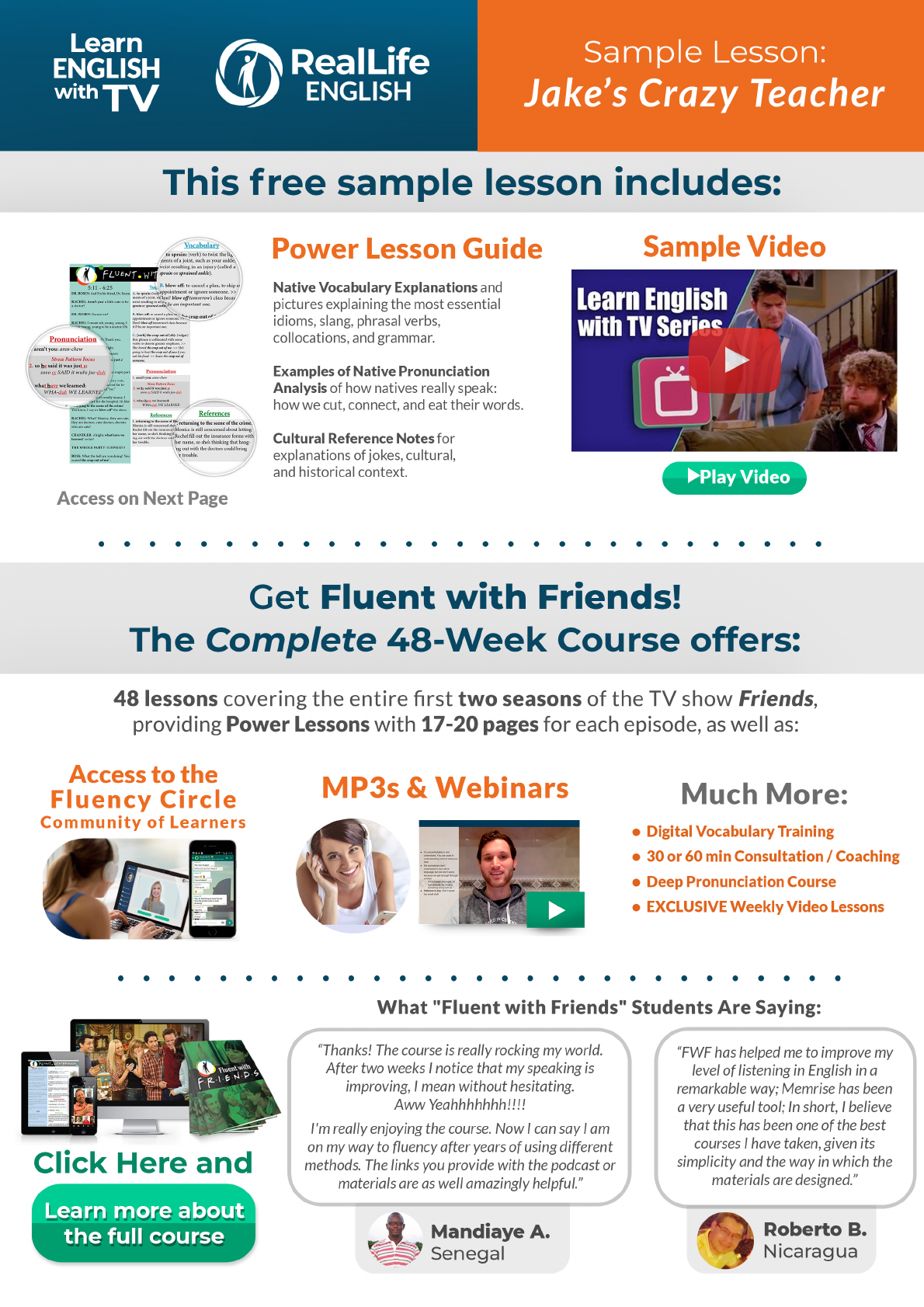 https://www.youtube.com/watch?v=Lllt-NcoleM http://fluentwithfriends.com Vocabulary Pronunciation 1. You got him a tutor?: you goh-dima-too-der? 2. I want him to: I-wan-im-duh 3. Don’t make fun of him: doan-make-fun-uv-imˌ 4. Have you been: ha-view-binˌ 5. Come on in: cah-moh-ninˌ A. tutor: a private teacher that helps students get higher grades, or prepare for tests. B. roadie: the profession of setting up stages and lights for bands (we say roadie because they generally travel ‘on the road’ with the band). C. make fun of: to ridicule or tease someone in an unkind, or even playful way. >> he made fun of the kid for mak- ing a mistake. D. how that saying goes: a ‘saying’ is an expression which usually has a mor- al, or an inspiring message. ALAN: Be right there! Ok, that’s Jake’s tutorA so could you please go read some- where else? CHARLIE: You got him a tutor1? ALAN: Yeah, I want him to2 graduate high school. CHARLIE: Why? So the other roadiesB don’t make fun ofC him3? ALAN: Yeah, like anyone’s going to let that kid work around electricity. Hello? STU: Oh, hey. I’m Stu, the tutor. Are you Jake? ALAN: No, I’m his father. STU: Oh. I’m Stu, the tutor. ALAN: Right. Have you been4 smoking pot? STU: No, sir. Not at all. Perhaps you’re smelling my cat. ALAN: Your cat? STU: Yes, sir. He’s an outdoor cat. ALAN: Ok, well ahh, well come on in5. STU: As an educator I always tell my students just to say no to drugsI. ALAN: Right STU: And you know how that saying goesD, a mind... Make fun of Roadie Eyedrops Transcript A common English saying: Don’t put all your eggs in one bakset. See definition Note: Eyedrops are used a lot by pot smokers because their eyes get really red. Pot = Marijuana I. Just say no to drugs: this is a popular saying from an anti-drugs campaign in the US. References http://idioms.thefreedictionary.com/put+all+eggs+in+one+basket Vocabulary ALAN: A terrible thing to waste. STU: Yeah that’s it. This is their brain on drugs, and this is an eggPIC. ALAN: Got it. Um, uh, Charlie, this is uh Jake’s tutor, Stu. CHARLlE: Hey. STU: I’m not highA, man, it’s my cat. CHARLlE: Relax, Stu. We’re not copsB. STU: Oh, really? He sure looks like the heatC. ALAN: Ahh please, make yourself com- fortable. Jake your tutor’s here! CHARLlE: Where did you find this clownD? ALAN: CraigslistE, his ad says he has a PHDF. CHARLlE: Big dealG, I have an adH on Craigslist that says I have a private plane and a 12 inch penis. STU: Guys I got bananas, are you hun- gry? ALAN and CHARLIE: Ahh not thanks, I’m good. STU: How about a1 Hot PocketI, actual- ly this isn’t hot anymore. ALAN and CHARLIE: Ahh no, I’ll passI. A. high: to be experiencing the effects of marijuana. B. cops: an informal way to say police. C. the heat: another informal way to say the police. D. clown: someone who is not being professional. >> I am not going to buy a car from that clown. E. Craigslist: a very popular online advertisement forum, here you can find literally anything. F. PHD: a doctorate in any disipline except medicine, Doctor of Philosophy Degree. G. big deal: used to show that you are unimpressed, often with a sarcastic tone. H. ad: advertisement. I. I’ll pass: expressions to say you are not interested when someone offers you something. >> A. Wanna come to the movies? B. I’ll pass. I. Hot Pocket: a popular microwave snack in the US, generally filled with cheese, meat, or vegetables. References Hot Pockets to feel high 1. How about a: how-bow-dah Pronunciation Craigslist Anti drug campaign This was a famous comercial using an egg frying to say this is what happens to your brain with drugs. Vocabulary A. pita bread: a flat piece of bread originating in the middle east. B. hummus: a thick paste or spread made from ground chickpeas and ses- ame seeds, olive oil, lemon, and garlic, made originally in the Middle East. C. finals: the end of year, or semester tests in highschool and college. D. X: even though Stu is referring to a math equation, X can also be another name for ecstacy. E. self loathing: the feeling of hating yourself, and feeling depressed. F. give something away: to reveal a surprise or an answer while someone is still trying to discover it. STU: Pita breadA? HummusB? ALAN: Again, no thank you. CHARLlE: You got anymore pot? STU: Not for 9 dollars an hour I don’t. I mean, I don’t know what your talking about1. JAKE: Hey ALAN: Oh Jake, Jake, here let me2 intro- duce you to Stu. He’s going to help you3 get ready for finalsC. STU: Hey little dude, are you ready to have some math fun? JAKE: No, but I’ll take a Hot Pocket. STU: Oh alright. If three Hot Pockets minus X equals 1 Hot Pocket, what does X equal? CHARLlE: In my experience XD usually equals an all night party followed by a headache and self loathingIE. STU: Hey man, I can’t do my job if you’re going to4 give awayF the answers. Pronunciation 1. I don’t know what you’re talking about: I-dunno wuh-yer talking about 2. Let me: lemme 3. He’s going to help you: he’s gonna-hell-pya-geh-redyˌ 4. If you’re going to: fya-gonna Pita bread Hummus Ecstacy I. followed by a headache and self loathing: Charlie is talking about the after effects of taking ecstacy. References the munchies Note: to have ‘the munchies’ is when you get really hungry from smoking pot. It seems Stu is experi- encing this with all his food. Enjoy learning with TV shows? Join our fluency course, Fluent with Friends For 48 weeks, you will watch, laugh, learn, and dramatically accelerate your English fluency together with one of the best American TV series ever created: Friends. Using the RealLife Power Learning Method, Chad, Ethan, and Justin guide you on a linguistic and cultural tour of English fluency, a com- plete learning experience around the captivating and humorous story of 6 charasmatic friends from New York. The Ultimate English Learning Experience Learn More About Course http://fluentwithfriends.com/