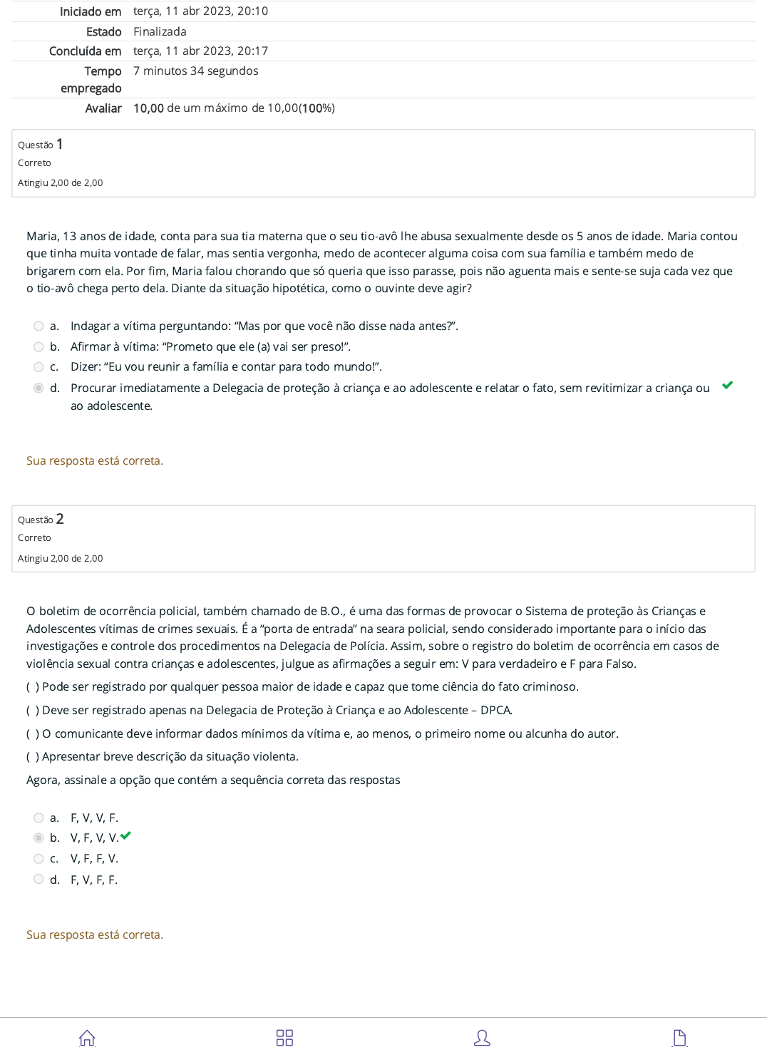 Iniciado em terça, 11 abr 2023, 20:10 Estado Finalizada Concluída em terça, 11 abr 2023, 20:17 Tempo empregado 7 minutos 34 segundos Avaliar 10,00 de um máximo de 10,00(100%) Questão 1 Correto Atingiu 2,00 de 2,00 Questão 2 Correto Atingiu 2,00 de 2,00 Maria, 13 anos de idade, conta para sua tia materna que o seu tio-avô lhe abusa sexualmente desde os 5 anos de idade. Maria contou que tinha muita vontade de falar, mas sentia vergonha, medo de acontecer alguma coisa com sua família e também medo de brigarem com ela. Por �m, Maria falou chorando que só queria que isso parasse, pois não aguenta mais e sente-se suja cada vez que o tio-avô chega perto dela. Diante da situação hipotética, como o ouvinte deve agir? a. Indagar a vítima perguntando: “Mas por que você não disse nada antes?”. b. A�rmar à vítima: “Prometo que ele (a) vai ser preso!”. c. Dizer: “Eu vou reunir a família e contar para todo mundo!”. d. Procurar imediatamente a Delegacia de proteção à criança e ao adolescente e relatar o fato, sem revitimizar a criança ou ao adolescente. Sua resposta está correta. O boletim de ocorrência policial, também chamado de B.O., é uma das formas de provocar o Sistema de proteção às Crianças e Adolescentes vítimas de crimes sexuais. É a “porta de entrada” na seara policial, sendo considerado importante para o início das investigações e controle dos procedimentos na Delegacia de Polícia. Assim, sobre o registro do boletim de ocorrência em casos de violência sexual contra crianças e adolescentes, julgue as a�rmações a seguir em: V para verdadeiro e F para Falso. ( ) Pode ser registrado por qualquer pessoa maior de idade e capaz que tome ciência do fato criminoso. ( ) Deve ser registrado apenas na Delegacia de Proteção à Criança e ao Adolescente – DPCA. ( ) O comunicante deve informar dados mínimos da vítima e, ao menos, o primeiro nome ou alcunha do autor. ( ) Apresentar breve descrição da situação violenta. Agora, assinale a opção que contém a sequência correta das respostas a. F, V, V, F. b. V, F, V, V. c. V, F, F, V. d. F, V, F, F. Sua resposta está correta. https://eskadauema.com/my https://eskadauema.com/index.php?redirect=0 https://eskadauema.com/user/edit.php?id= https://eskadauema.com/theme/olm/certificates.php Questão 3 Correto Atingiu 2,00 de 2,00 Questão 4 Correto Atingiu 2,00 de 2,00 Questão 5 Correto Atingiu 2,00 de 2,00 Conforme vimos em nossos encontros, a Legislação brasileira incumbe aos pais um conjunto de deveres para com seus �lhos até que completem a maioridade, o que juridicamente se denominou como “autoridade parental” ou “poder familiar”, e que implica: a. no poder irrestrito dos pais de de�nir sua vontade a dos �lhos. b. um conjunto de responsabilidades dos pais para com os �lhos e no interesse destes. c. um conjunto de responsabilidades dos pais para com os �lhos e no interesse daqueles. d. por se tratar de relação de poder familiar, o Estado não poderá interferir nas relações de pais e �lhos. Sua resposta está correta. João e Maria são irmãos e vivem atualmente em situação de rua, são �lhos de uma família de classe média alta conhecida na cidade. Eram vítimas constantes de violência e maus tratos dos pais. João, tido como travesso, recebia golpes por todo o corpo, que deixavam marcas; enquanto que a irmã era obrigada, desde de muito cedo, a fazer a maioria das tarefas domésticas. Os vizinhos presenciavam as violências, mas diziam que não tinham nada que ver com a situação, sobretudo por se tratar de uma família conhecida na cidade, tinham receio de se envolver. As crianças, que não aguentavam mais tanta violação, fugiram de casa e hoje perambulam pelas ruas. O município não dispõe de qualquer serviço que os acolha, tão pouco receberam atendimento assistencial na época em que moravam com os pais. A história �ctícia narrada acima é um exemplo que a�ige diversos meninos e meninas em nosso País. Sobre o dever de cuidado de crianças e adolescentes, podemos dizer que compete: a. exclusivamente à família. b. primeiro à família, e caso não atenda, surge a obrigação do Estado. c. paralelamente à família e ao Estado. d. à família, a sociedade e ao Estado. Sua resposta está correta. Para o ordenamento jurídico brasileiro, é considerada a forma alternativa, não penal e de suma importância manter o suposto agressor longe da vítima. Estamos nos referindo a(ao) a. Prisão antecipada. b. Prisão preventiva. c. Prisão em �agrante. d. Afastamento perimetral. Sua resposta está correta. https://eskadauema.com/my https://eskadauema.com/index.php?redirect=0 https://eskadauema.com/user/edit.php?id= https://eskadauema.com/theme/olm/certificates.php Termos de uso Política de privacidade https://eskadauema.com/admin/tool/policy/view.php?policyid=1&versionid=3 https://eskadauema.com/admin/tool/policy/view.php?policyid=2&versionid=2 https://eskadauema.com/my https://eskadauema.com/index.php?redirect=0 https://eskadauema.com/user/edit.php?id= https://eskadauema.com/theme/olm/certificates.php